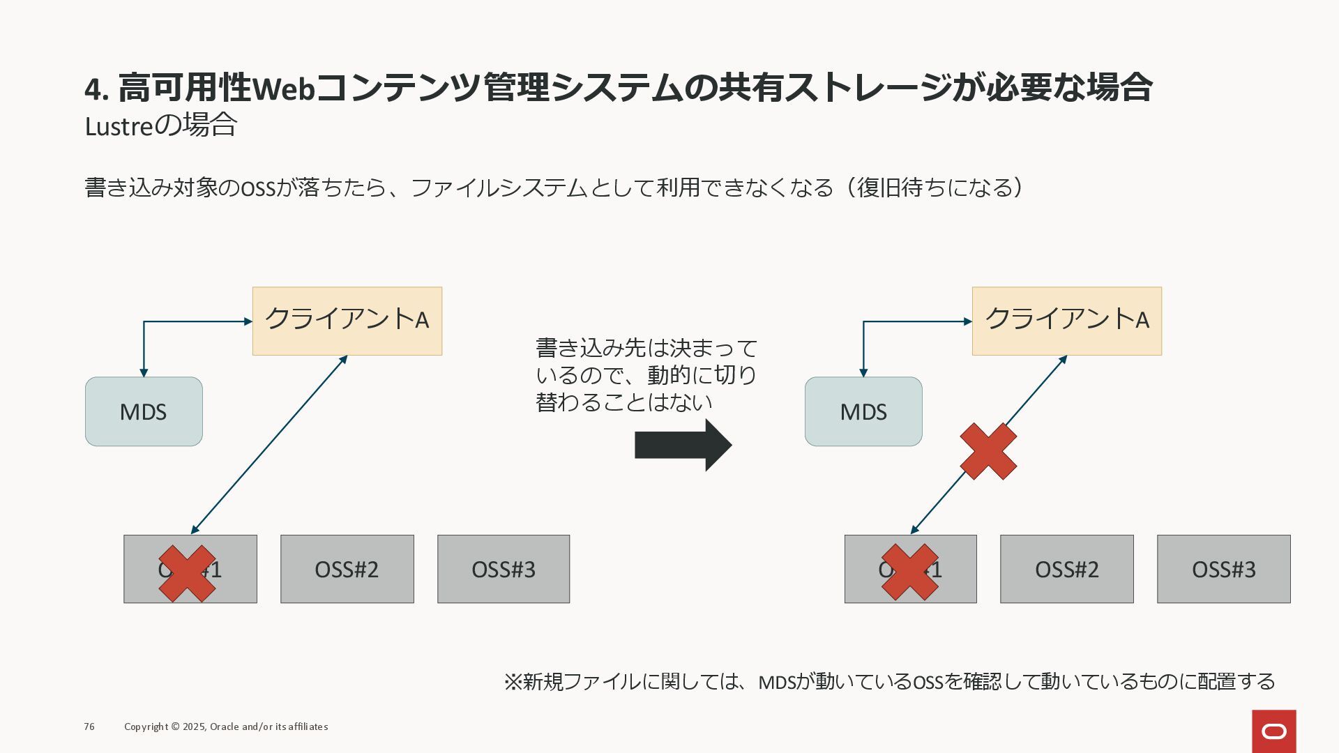 4. 高可用性Webコンテンツ管理システムの共有ストレージが必要な場合 Lustreの場合 書き込み対象のOSSが落ちたら、ファイルシステムとして利用できなくなる(復旧待ちになる) 76 Copyright © 2025, Oracle and/or