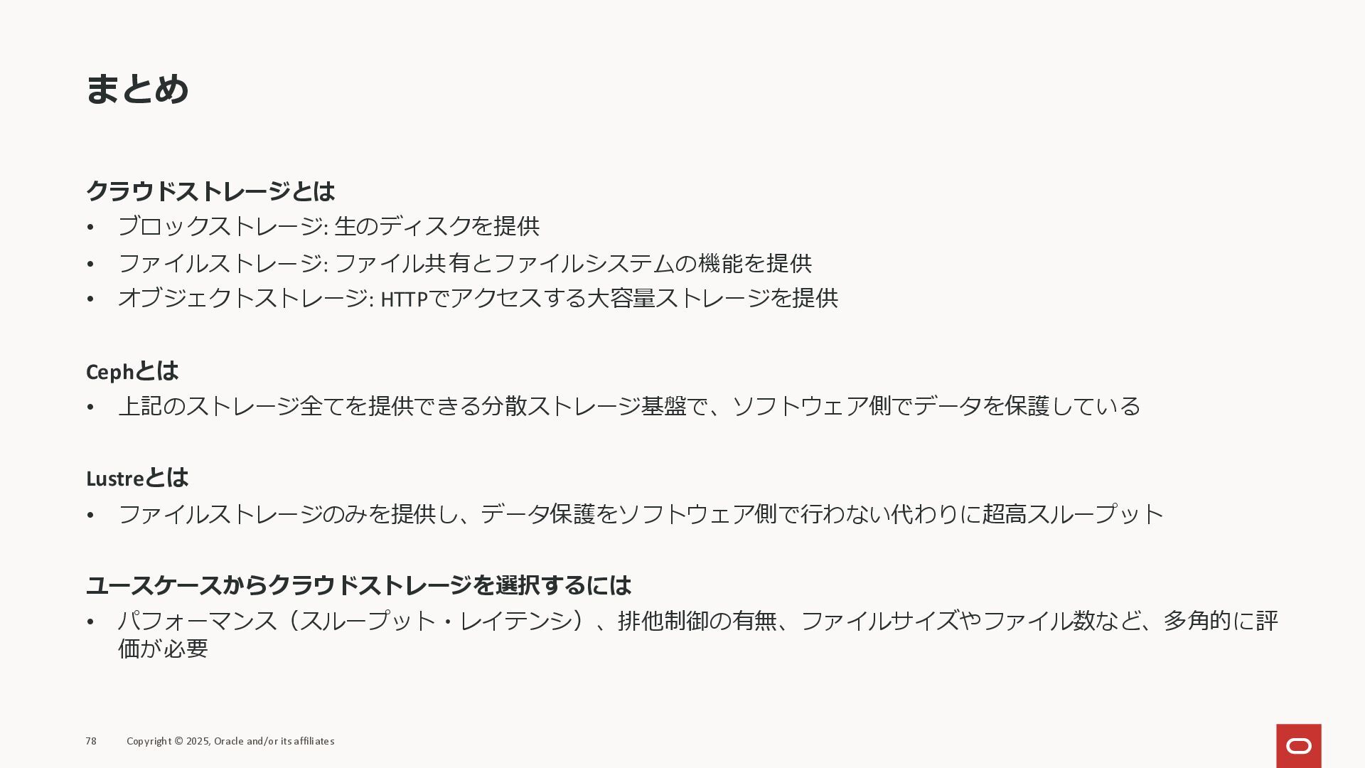 HTTPでアクセスする大容量ストレージを提供 Cephとは • 上記のストレージ全てを提供できる分散ストレージ基盤で、ソフトウェア側でデータを保護している Lustreとは • ファイルストレージのみを提供し、データ保護をソフトウェア側で行わない代わりに超高スループット ユースケースからクラウドストレージを選択するには • パフォーマンス(スループット・レイテンシ)、排他制御の有無、ファイルサイズやファイル数など、多角的に評 価が必要 78 Copyright © 2025, Oracle and/or its affiliates