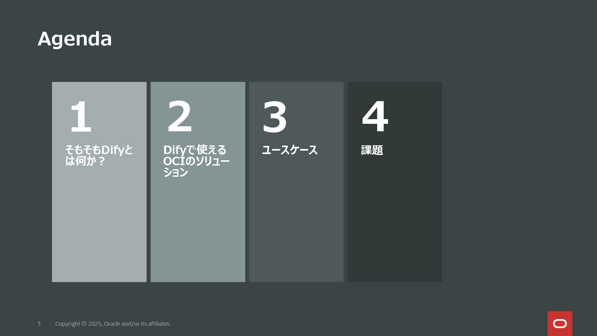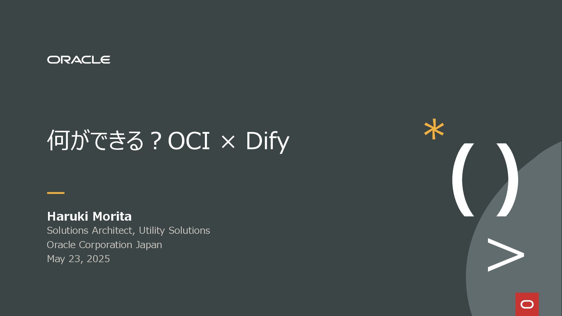 2025年5月23日(金)に開催された Developer Day 2025 の [LT3-3] 何ができる?OCI × Dify の登壇資料です。