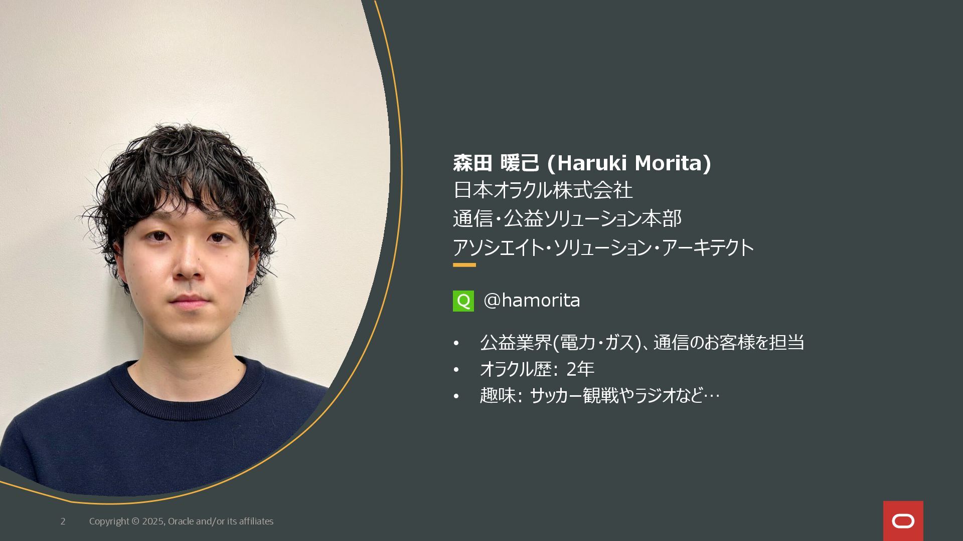 2025, Oracle and/or its affiliates • 公益業界(電力・ガス)、通信のお客様を担当 • オラクル歴: 2年 • 趣味: サッカー観戦やラジオなど… @hamorita