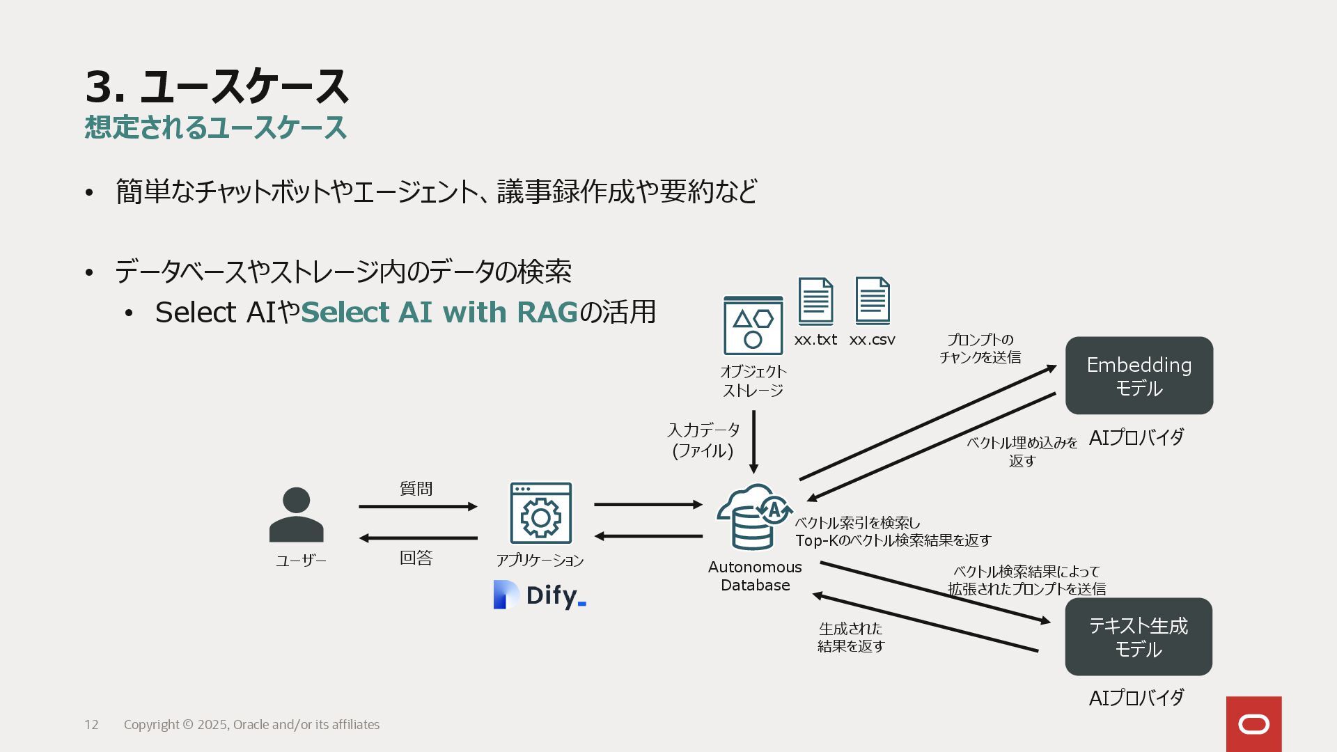 3. ユースケース 想定されるユースケース • 簡単なチャットボットやエージェント、議事録作成や要約など • データベースやストレージ内のデータの検索 • Select AIやSelect