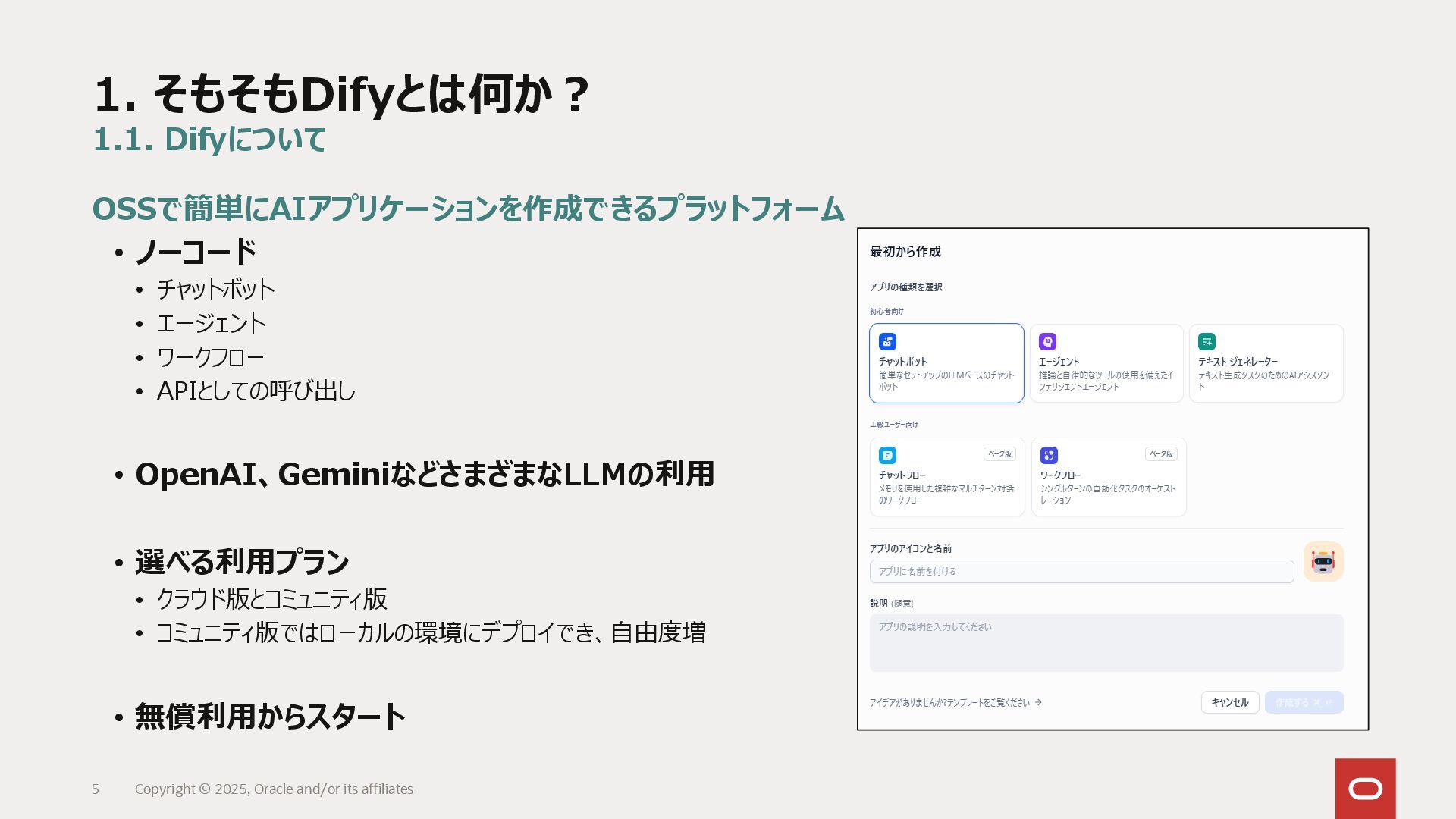 そもそもDifyとは何か? 4 Copyright © 2025, Oracle and/or its affiliates