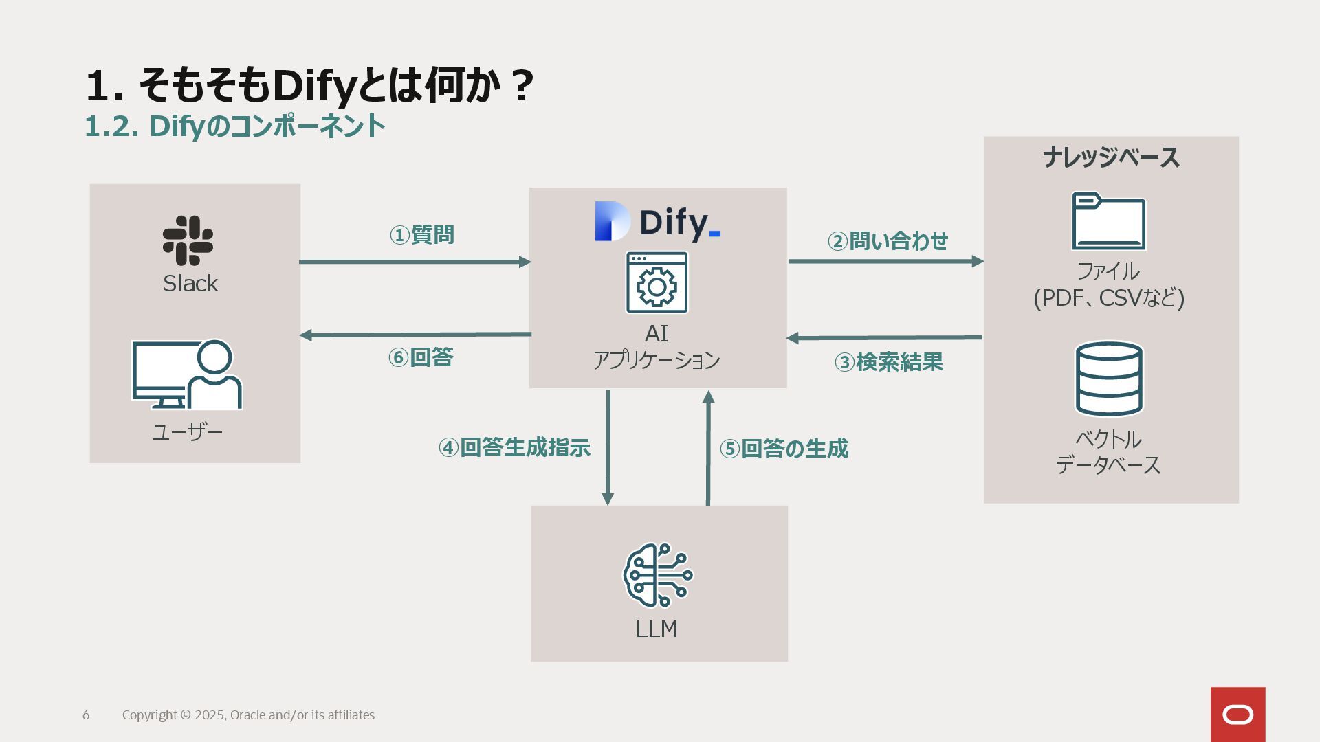 ナレッジベース 1. そもそもDifyとは何か? 1.2. Difyのコンポーネント 6 Copyright © 2025, Oracle