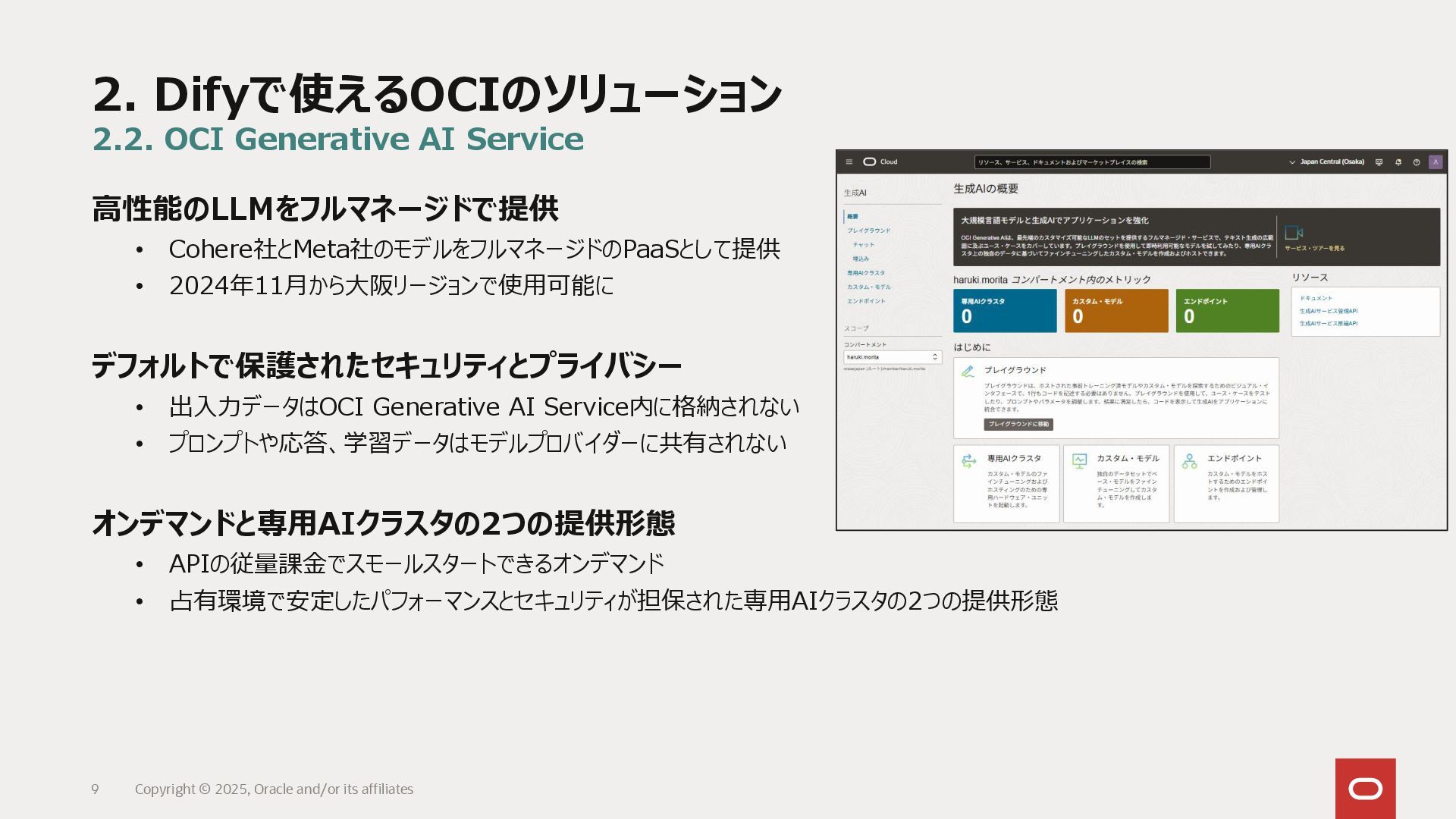 • 2024年11月から大阪リージョンで使用可能に デフォルトで保護されたセキュリティとプライバシー • 出入力データはOCI Generative AI Service内に格納されない • プロンプトや応答、学習データはモデルプロバイダーに共有されない オンデマンドと専用AIクラスタの2つの提供形態 • APIの従量課金でスモールスタートできるオンデマンド • 占有環境で安定したパフォーマンスとセキュリティが担保された専用AIクラスタの2つの提供形態 9 Copyright © 2025, Oracle and/or its affiliates