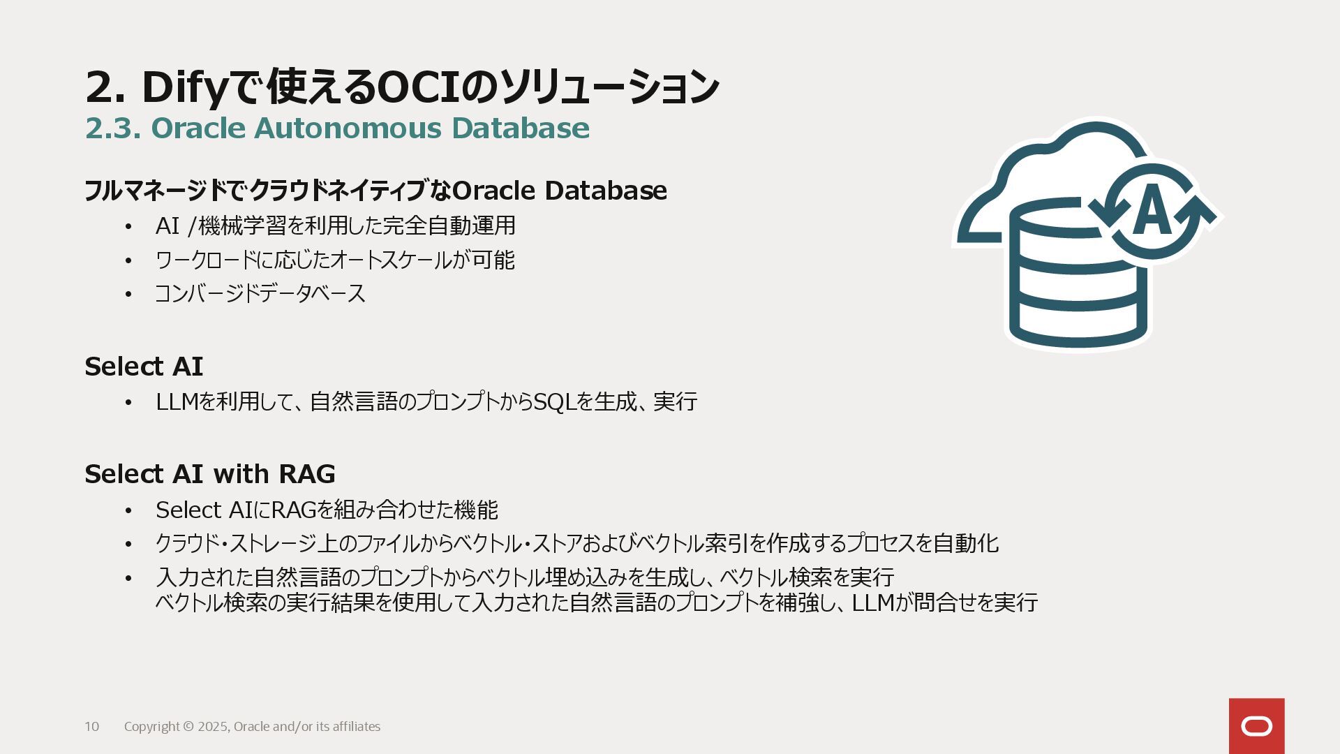 2. Difyで使えるOCIのソリューション 2.3. Oracle Autonomous Database フルマネージドでクラウドネイティブなOracle Database • AI