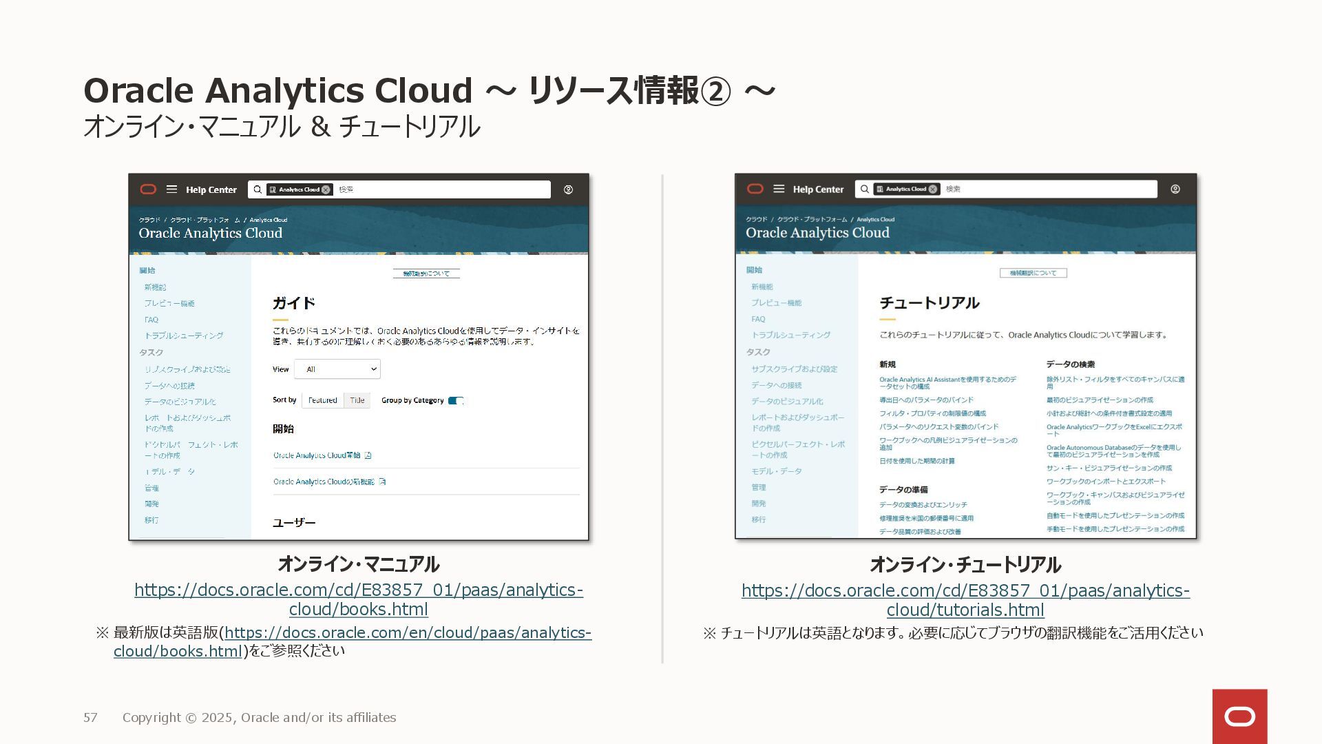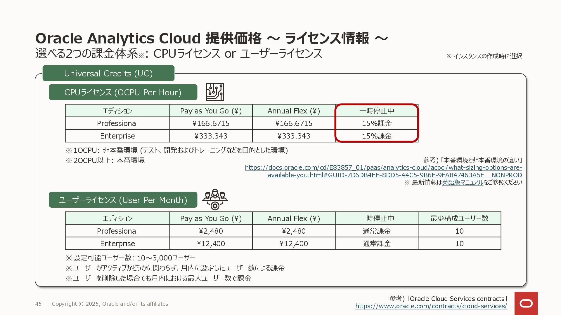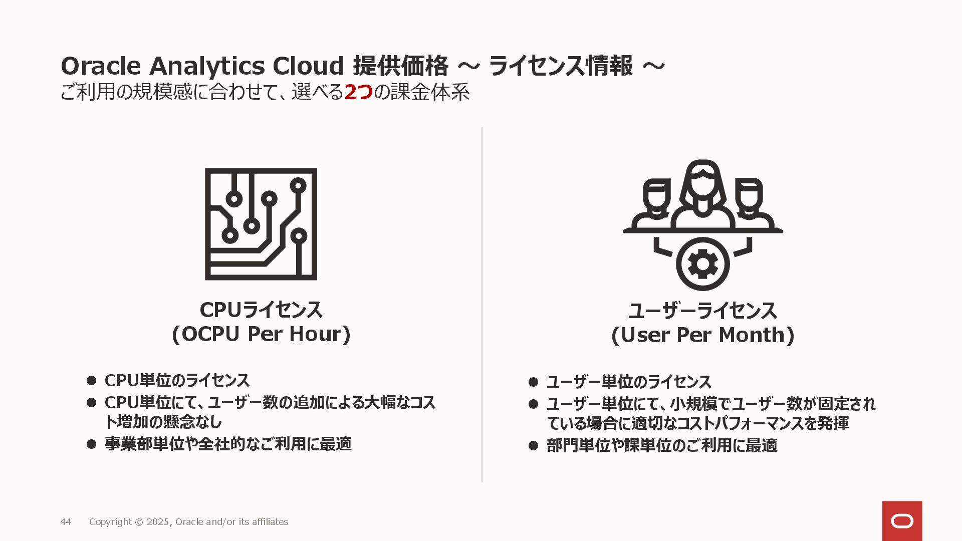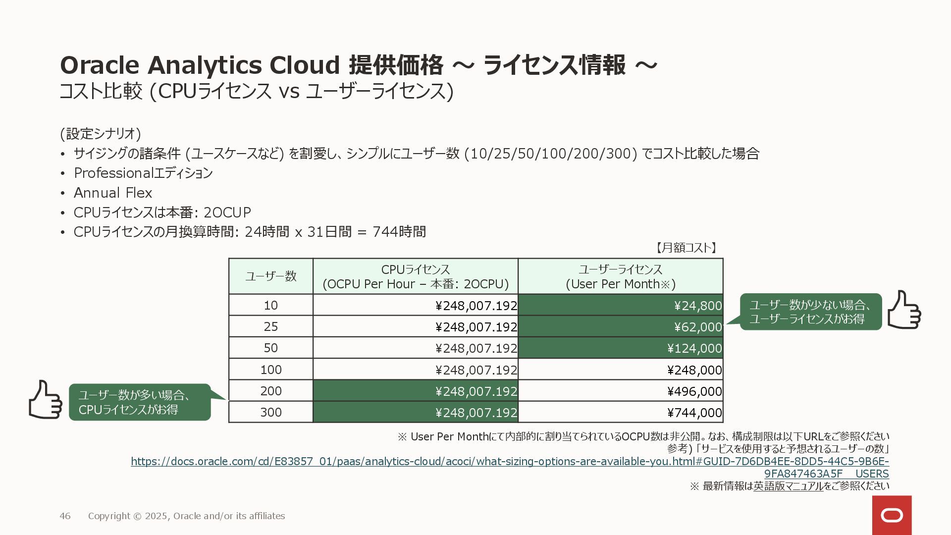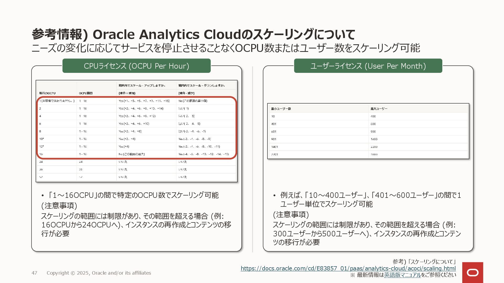 ユーザーライセンス) (設定シナリオ) • サイジングの諸条件 (ユースケースなど) を割愛し、シンプルにユーザー数 (10/25/50/100/200/300) でコスト比較した場合 • Professionalエディション • Annual Flex • CPUライセンスは本番: 2OCUP • CPUライセンスの月換算時間: 24時間 x 31日間 = 744時間 46 Copyright © 2025, Oracle and/or its affiliates ユーザー数 CPUライセンス (OCPU Per Hour – 本番: 2OCPU) ユーザーライセンス (User Per Month※) 10 ¥248,007.192 ¥24,800 25 ¥248,007.192 ¥62,000 50 ¥248,007.192 ¥124,000 100 ¥248,007.192 ¥248,000 200 ¥248,007.192 ¥496,000 300 ¥248,007.192 ¥744,000 【月額コスト】 ユーザー数が少ない場合、 ユーザーライセンスがお得 ユーザー数が多い場合、 CPUライセンスがお得 ※ User Per Monthにて内部的に割り当てられているOCPU数は非公開。なお、構成制限は以下URLをご参照ください 参考) 「サービスを使用すると予想されるユーザーの数」 https://docs.oracle.com/cd/E83857_01/paas/analytics-cloud/acoci/what-sizing-options-are-available-you.html#GUID-7D6DB4EE-8DD5-44C5-9B6E- 9FA847463A5F__USERS ※ 最新情報は英語版マニュアルをご参照ください