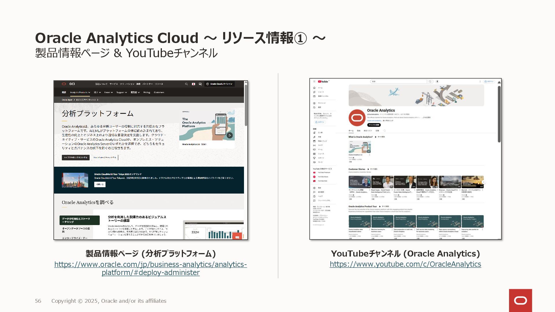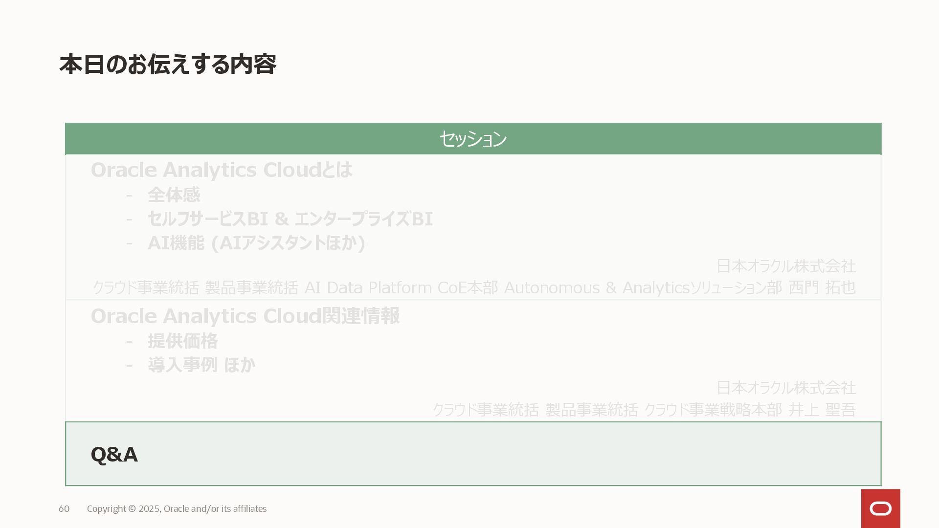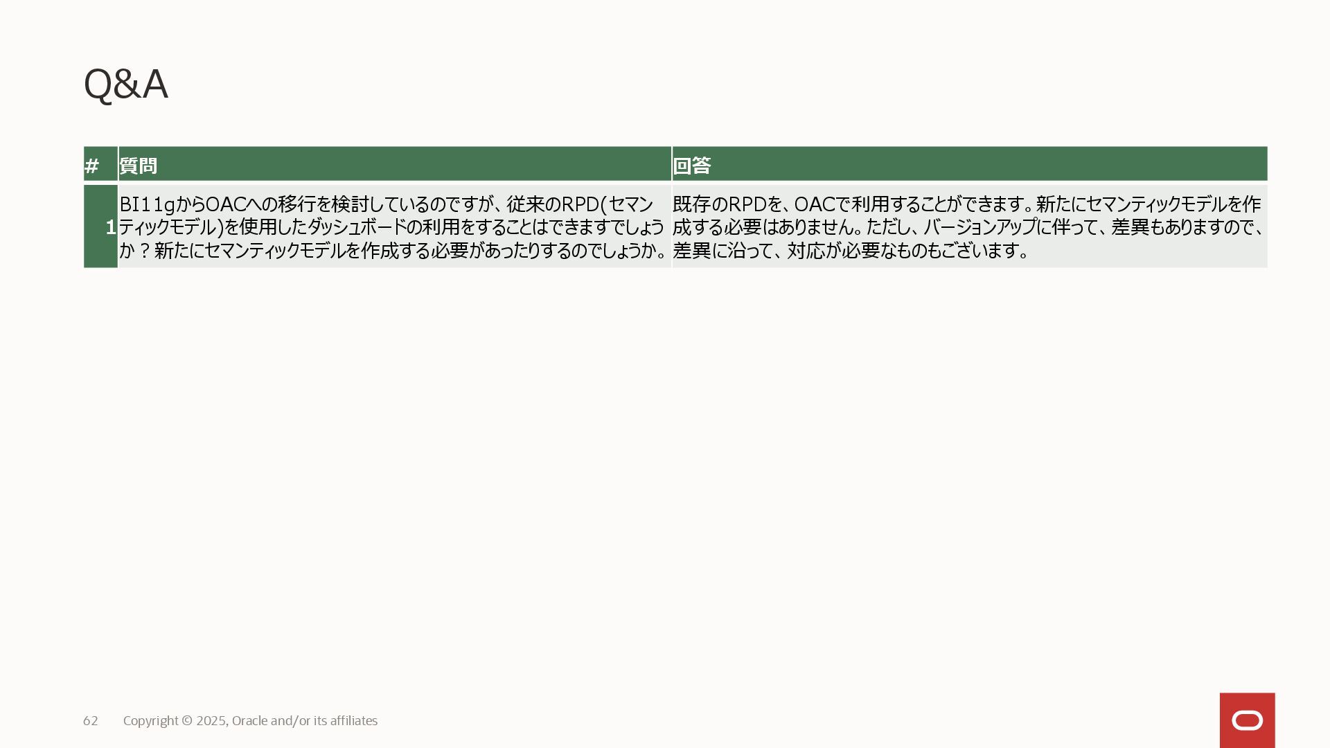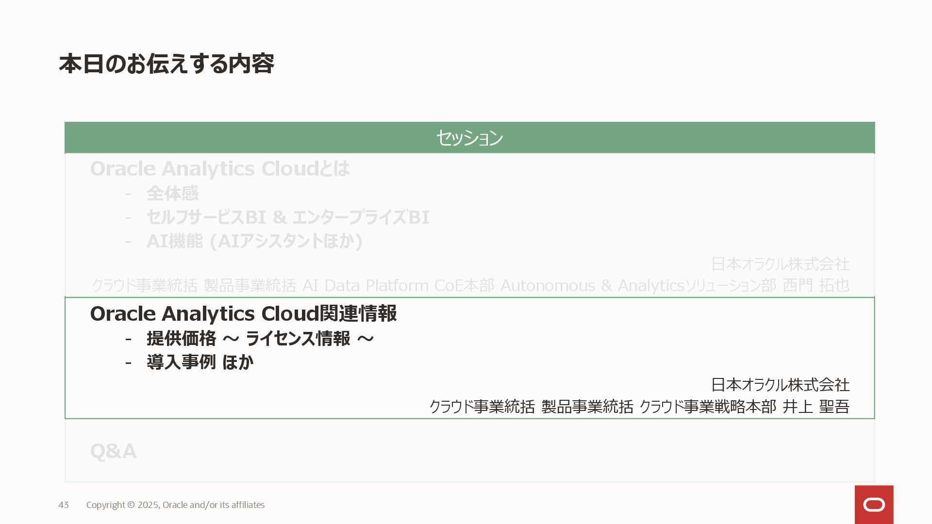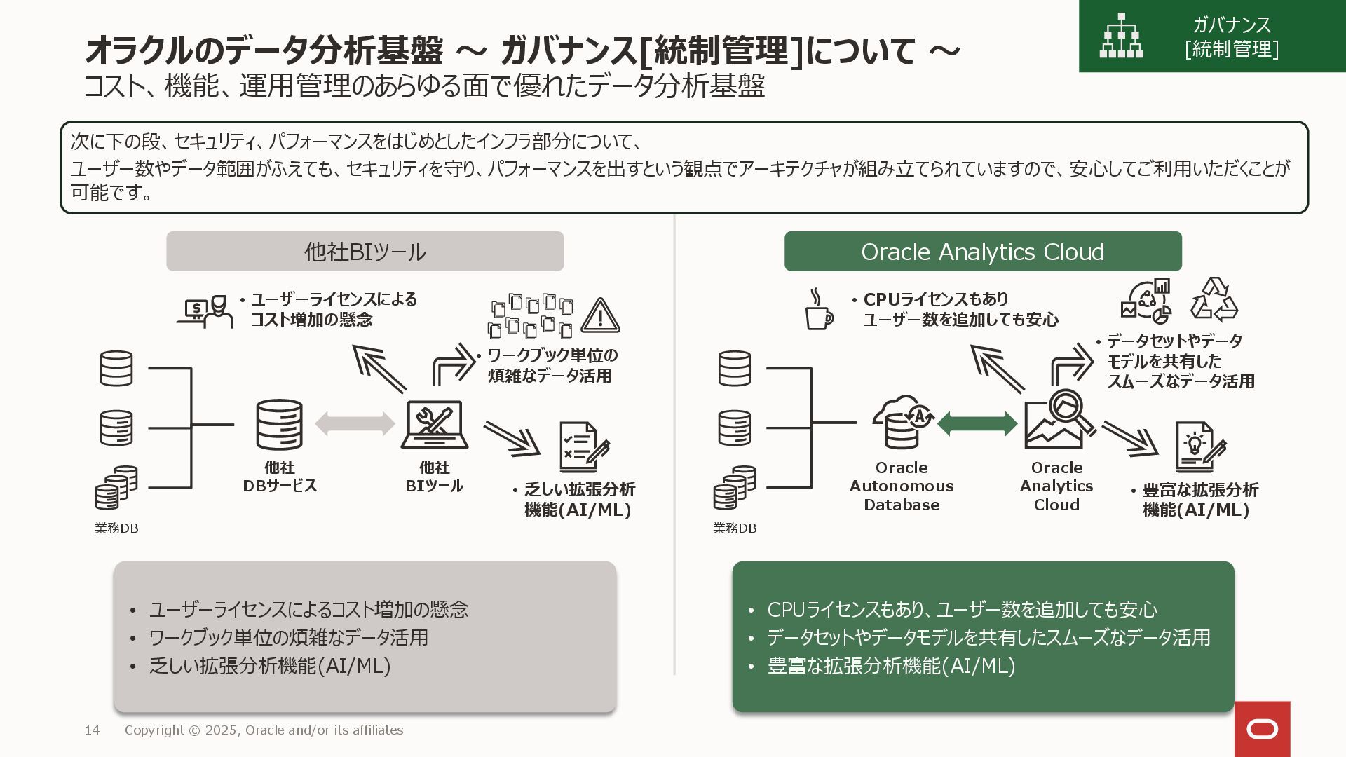 ユーザーライセンス) (設定シナリオ) • サイジングの諸条件 (ユースケースなど) を割愛し、シンプルにユーザー数 (10/25/50/100/200/300) でコスト比較した場合 • Professionalエディション • Annual Flex • CPUライセンスは本番: 2OCUP • CPUライセンスの月換算時間: 24時間 x 31日間 = 744時間 46 Copyright © 2025, Oracle and/or its affiliates ユーザー数 CPUライセンス (OCPU Per Hour – 本番: 2OCPU) ユーザーライセンス (User Per Month※) 10 ¥248,007.192 ¥24,800 25 ¥248,007.192 ¥62,000 50 ¥248,007.192 ¥124,000 100 ¥248,007.192 ¥248,000 200 ¥248,007.192 ¥496,000 300 ¥248,007.192 ¥744,000 【月額コスト】 ユーザー数が少ない場合、 ユーザーライセンスがお得 ユーザー数が多い場合、 CPUライセンスがお得 ※ User Per Monthにて内部的に割り当てられているOCPU数は非公開。なお、構成制限は以下URLをご参照ください 参考) 「サービスを使用すると予想されるユーザーの数」 https://docs.oracle.com/cd/E83857_01/paas/analytics-cloud/acoci/what-sizing-options-are-available-you.html#GUID-7D6DB4EE-8DD5-44C5-9B6E- 9FA847463A5F__USERS ※ 最新情報は英語版マニュアルをご参照ください