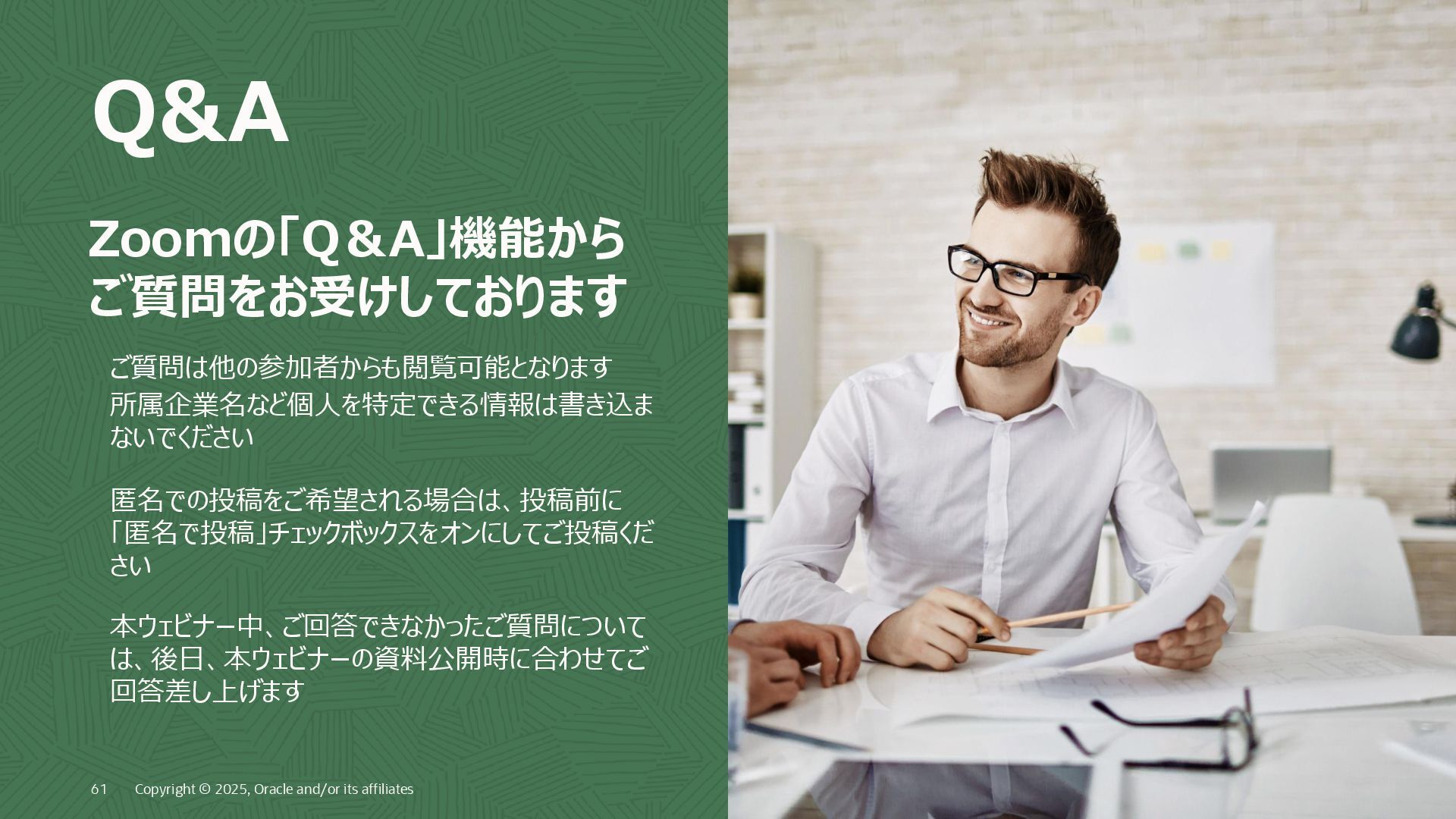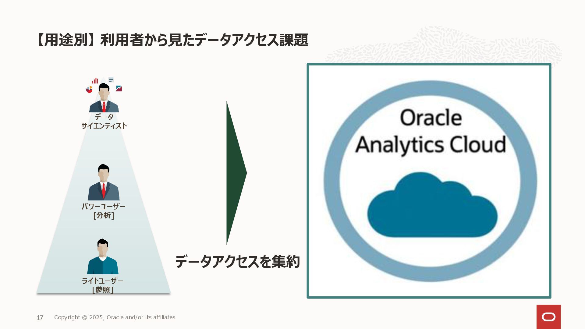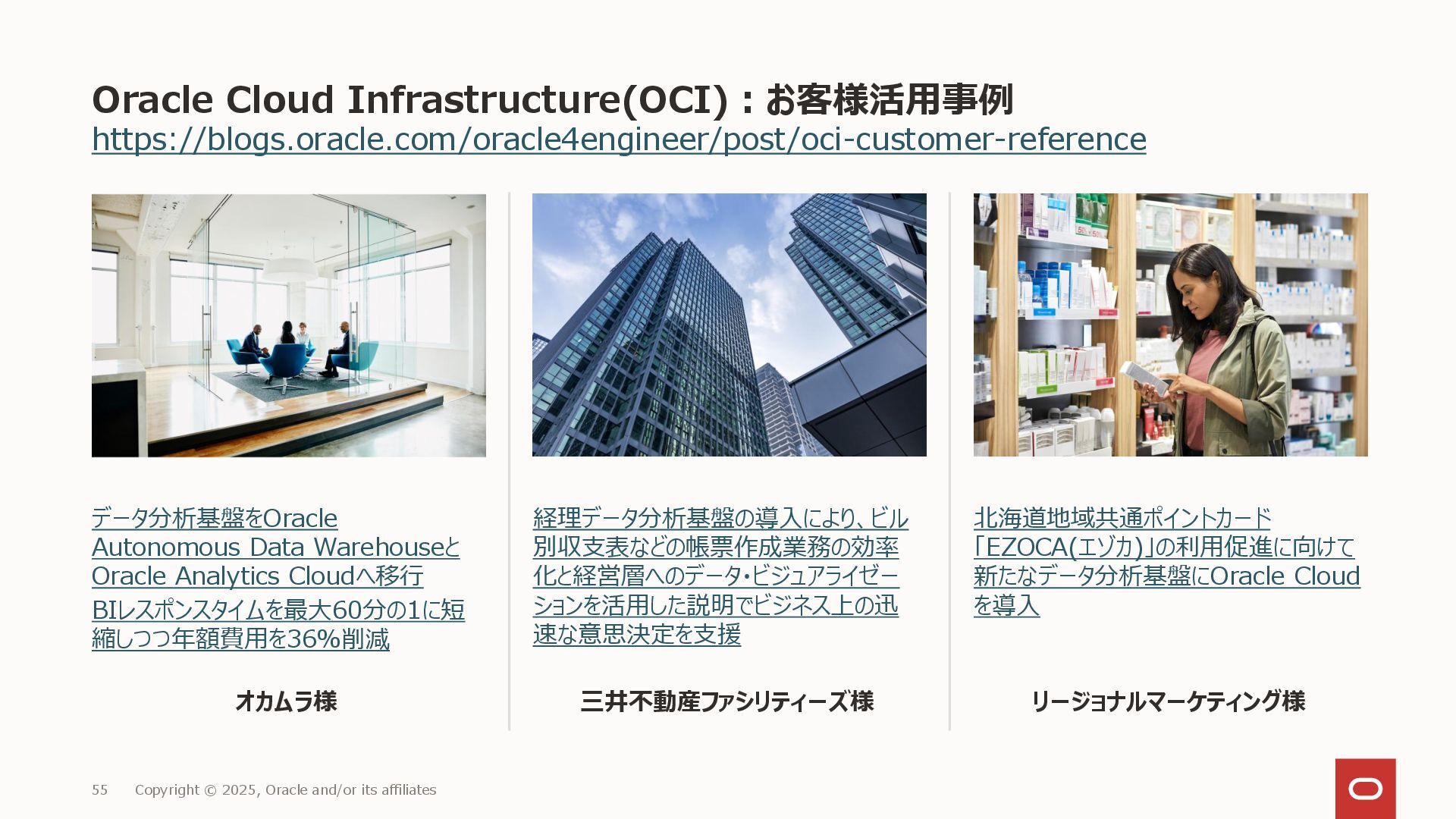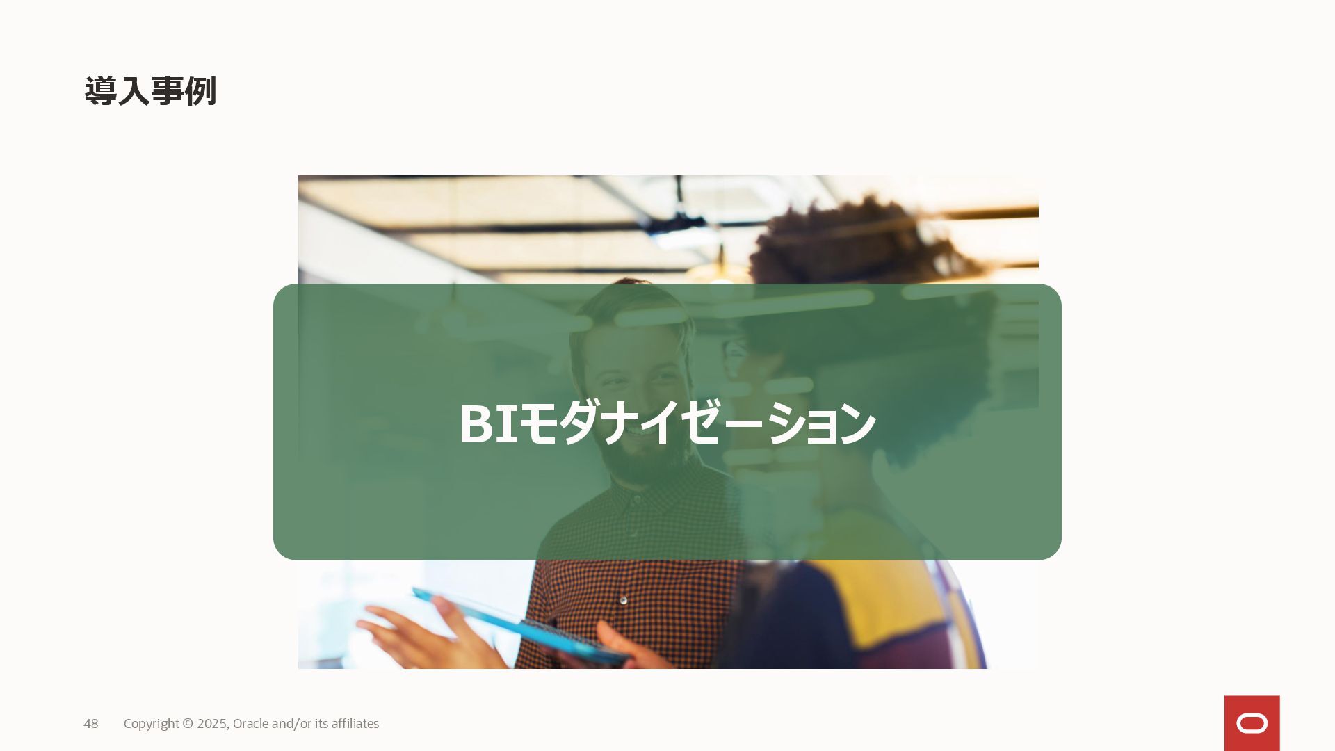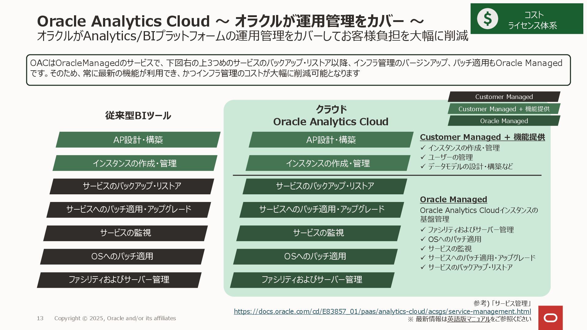 ユーザーライセンス) (設定シナリオ) • サイジングの諸条件 (ユースケースなど) を割愛し、シンプルにユーザー数 (10/25/50/100/200/300) でコスト比較した場合 • Professionalエディション • Annual Flex • CPUライセンスは本番: 2OCUP • CPUライセンスの月換算時間: 24時間 x 31日間 = 744時間 46 Copyright © 2025, Oracle and/or its affiliates ユーザー数 CPUライセンス (OCPU Per Hour – 本番: 2OCPU) ユーザーライセンス (User Per Month※) 10 ¥248,007.192 ¥24,800 25 ¥248,007.192 ¥62,000 50 ¥248,007.192 ¥124,000 100 ¥248,007.192 ¥248,000 200 ¥248,007.192 ¥496,000 300 ¥248,007.192 ¥744,000 【月額コスト】 ユーザー数が少ない場合、 ユーザーライセンスがお得 ユーザー数が多い場合、 CPUライセンスがお得 ※ User Per Monthにて内部的に割り当てられているOCPU数は非公開。なお、構成制限は以下URLをご参照ください 参考) 「サービスを使用すると予想されるユーザーの数」 https://docs.oracle.com/cd/E83857_01/paas/analytics-cloud/acoci/what-sizing-options-are-available-you.html#GUID-7D6DB4EE-8DD5-44C5-9B6E- 9FA847463A5F__USERS ※ 最新情報は英語版マニュアルをご参照ください