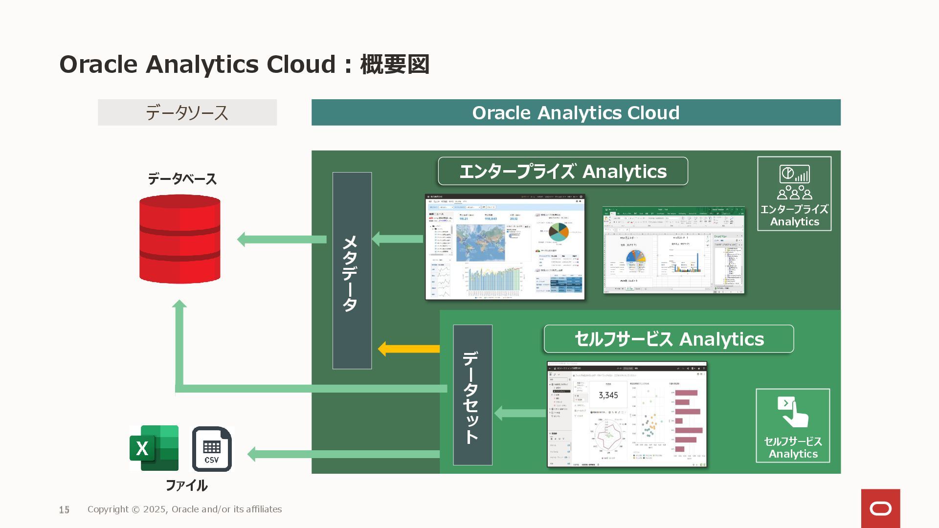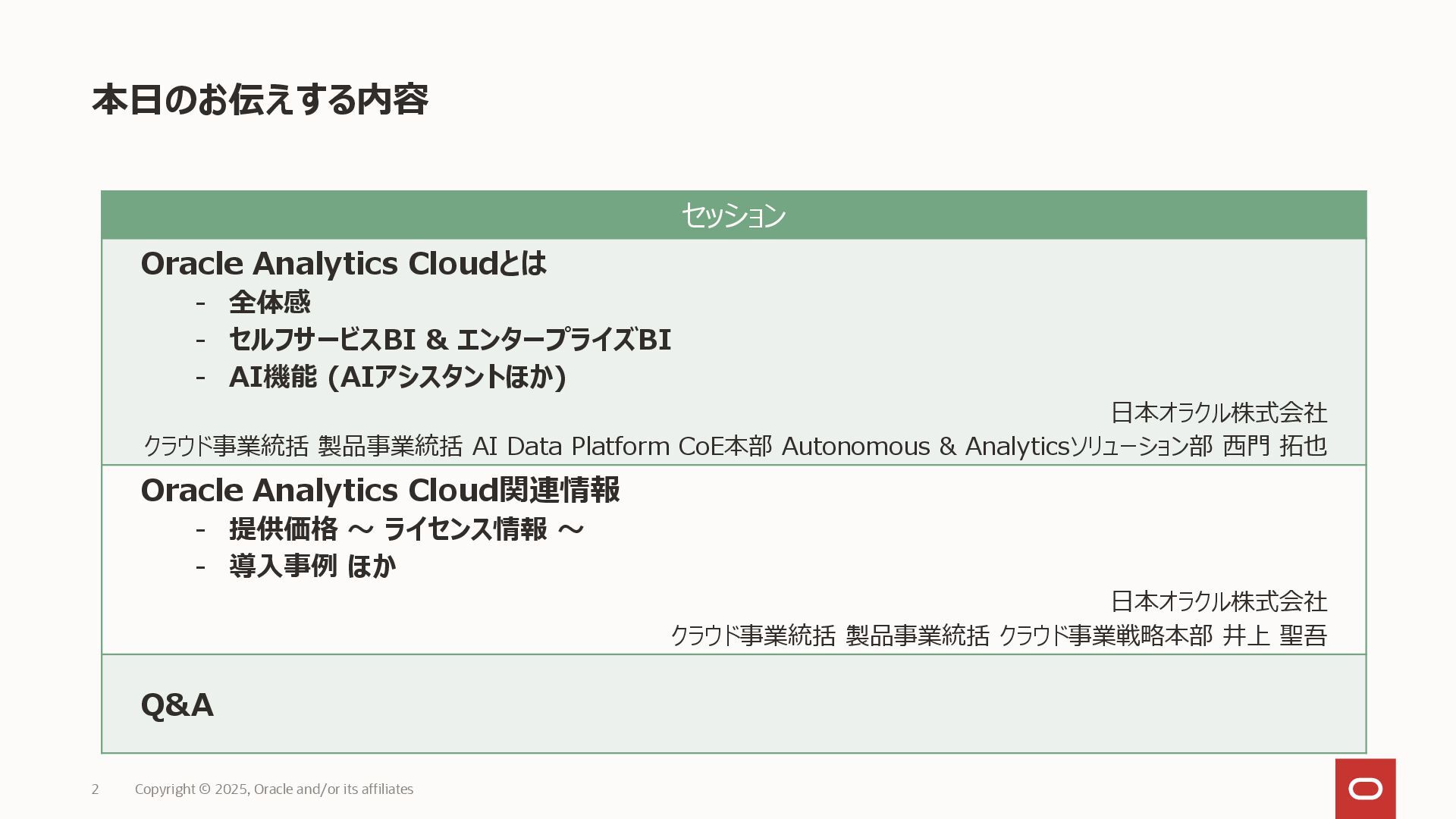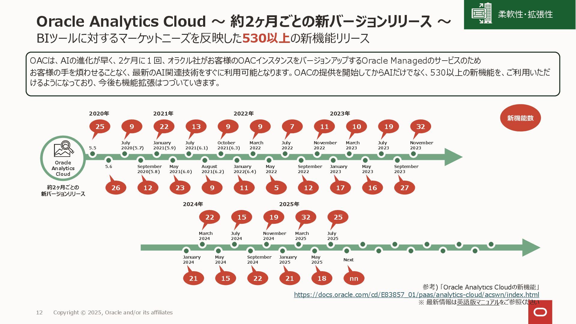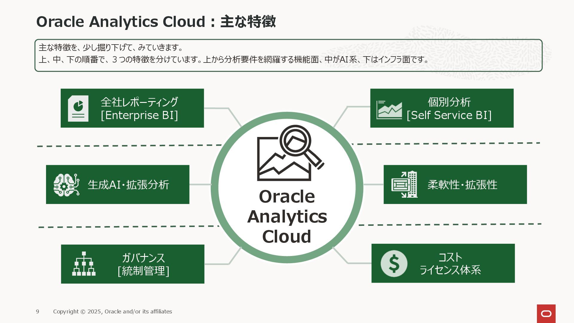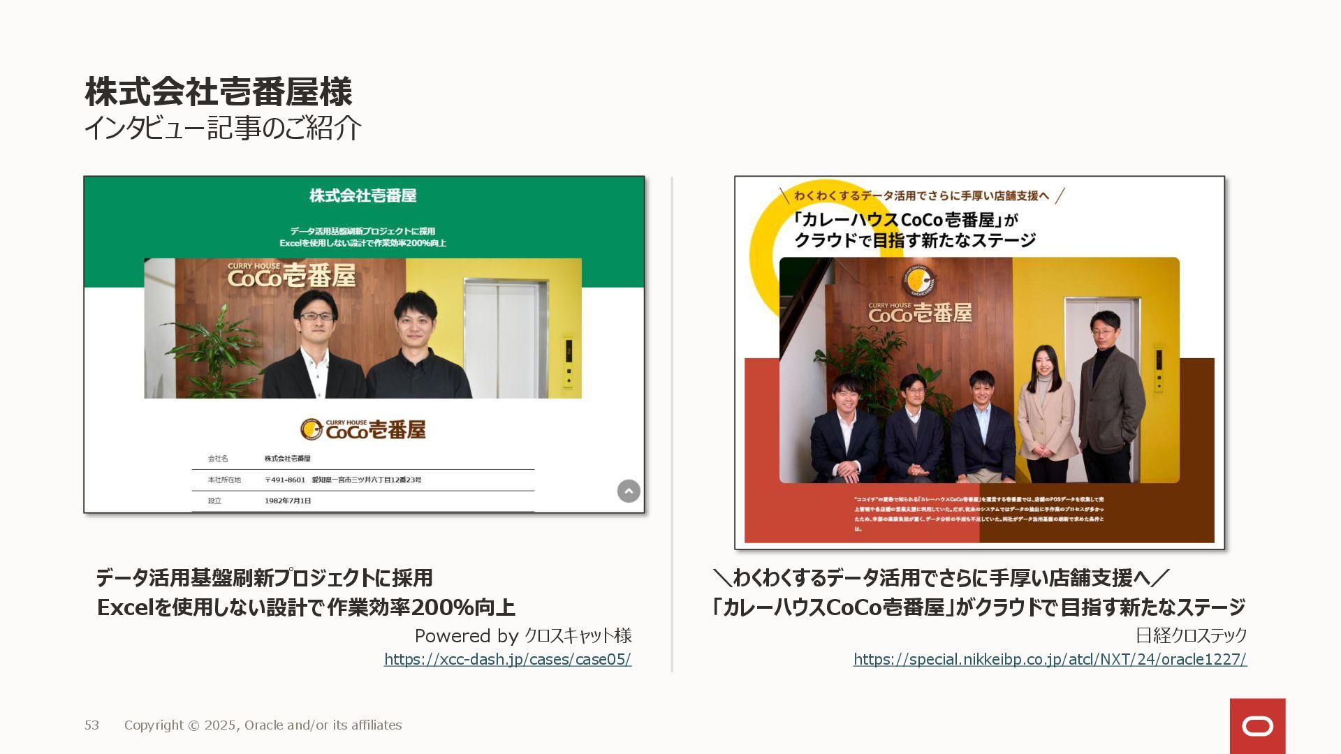 ユーザーライセンス) (設定シナリオ) • サイジングの諸条件 (ユースケースなど) を割愛し、シンプルにユーザー数 (10/25/50/100/200/300) でコスト比較した場合 • Professionalエディション • Annual Flex • CPUライセンスは本番: 2OCUP • CPUライセンスの月換算時間: 24時間 x 31日間 = 744時間 46 Copyright © 2025, Oracle and/or its affiliates ユーザー数 CPUライセンス (OCPU Per Hour – 本番: 2OCPU) ユーザーライセンス (User Per Month※) 10 ¥248,007.192 ¥24,800 25 ¥248,007.192 ¥62,000 50 ¥248,007.192 ¥124,000 100 ¥248,007.192 ¥248,000 200 ¥248,007.192 ¥496,000 300 ¥248,007.192 ¥744,000 【月額コスト】 ユーザー数が少ない場合、 ユーザーライセンスがお得 ユーザー数が多い場合、 CPUライセンスがお得 ※ User Per Monthにて内部的に割り当てられているOCPU数は非公開。なお、構成制限は以下URLをご参照ください 参考) 「サービスを使用すると予想されるユーザーの数」 https://docs.oracle.com/cd/E83857_01/paas/analytics-cloud/acoci/what-sizing-options-are-available-you.html#GUID-7D6DB4EE-8DD5-44C5-9B6E- 9FA847463A5F__USERS ※ 最新情報は英語版マニュアルをご参照ください