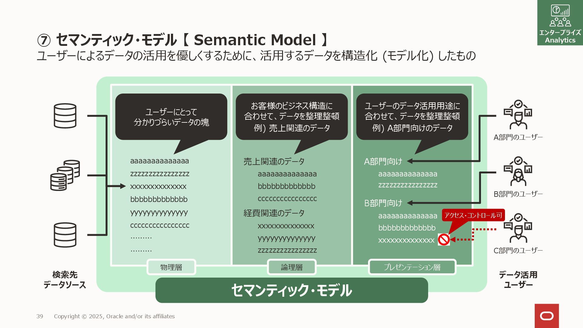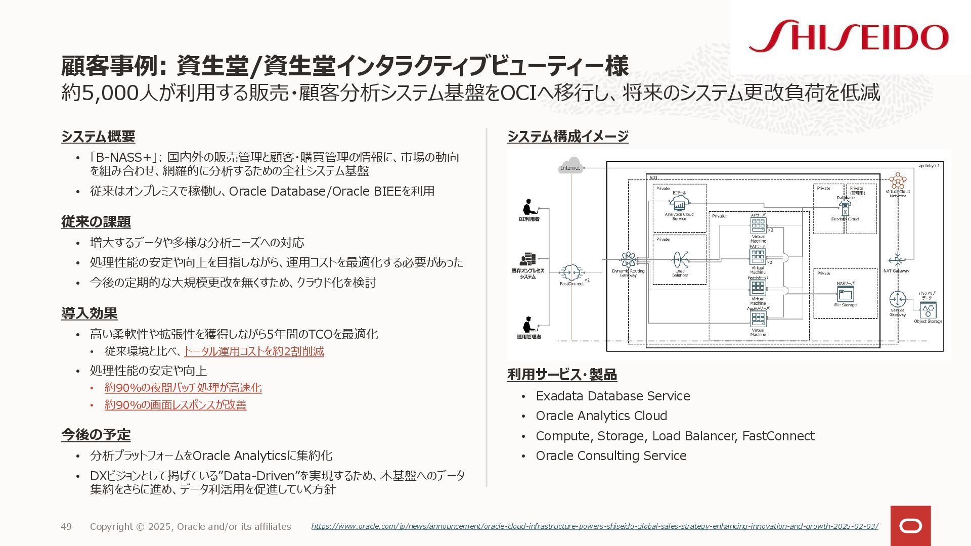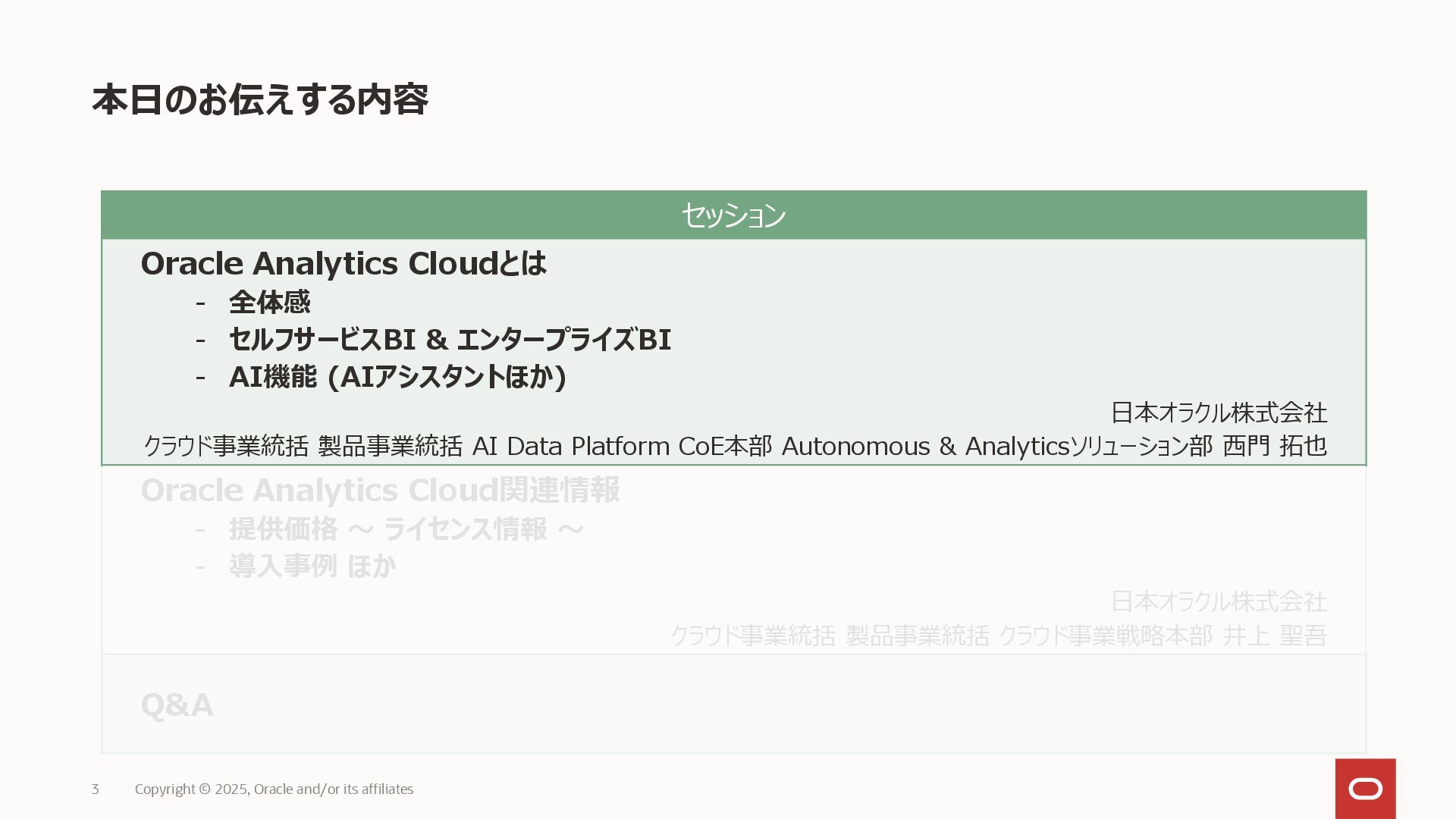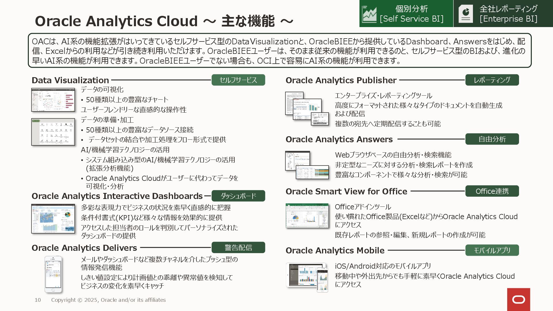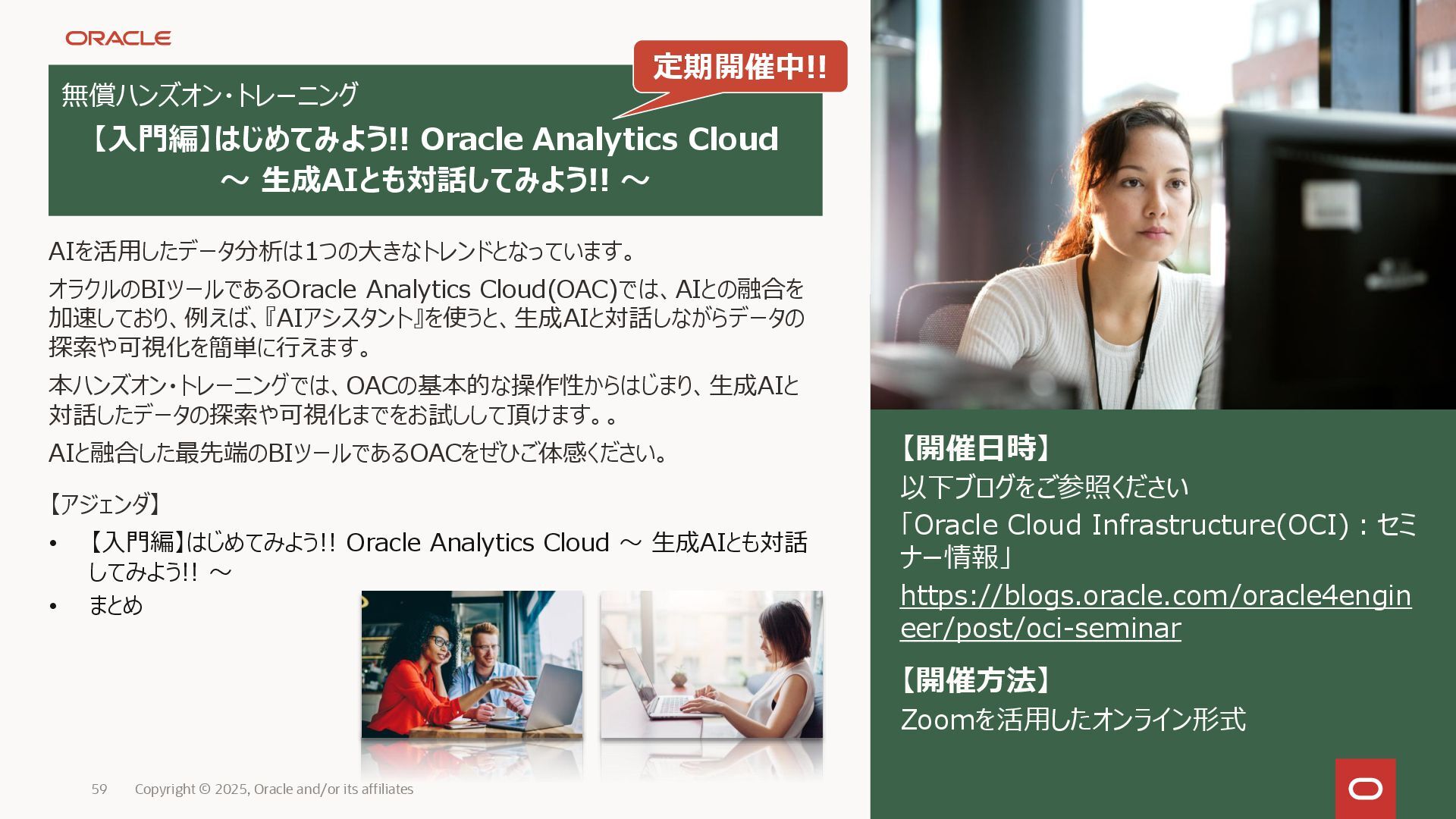 ユーザーライセンス) (設定シナリオ) • サイジングの諸条件 (ユースケースなど) を割愛し、シンプルにユーザー数 (10/25/50/100/200/300) でコスト比較した場合 • Professionalエディション • Annual Flex • CPUライセンスは本番: 2OCUP • CPUライセンスの月換算時間: 24時間 x 31日間 = 744時間 46 Copyright © 2025, Oracle and/or its affiliates ユーザー数 CPUライセンス (OCPU Per Hour – 本番: 2OCPU) ユーザーライセンス (User Per Month※) 10 ¥248,007.192 ¥24,800 25 ¥248,007.192 ¥62,000 50 ¥248,007.192 ¥124,000 100 ¥248,007.192 ¥248,000 200 ¥248,007.192 ¥496,000 300 ¥248,007.192 ¥744,000 【月額コスト】 ユーザー数が少ない場合、 ユーザーライセンスがお得 ユーザー数が多い場合、 CPUライセンスがお得 ※ User Per Monthにて内部的に割り当てられているOCPU数は非公開。なお、構成制限は以下URLをご参照ください 参考) 「サービスを使用すると予想されるユーザーの数」 https://docs.oracle.com/cd/E83857_01/paas/analytics-cloud/acoci/what-sizing-options-are-available-you.html#GUID-7D6DB4EE-8DD5-44C5-9B6E- 9FA847463A5F__USERS ※ 最新情報は英語版マニュアルをご参照ください