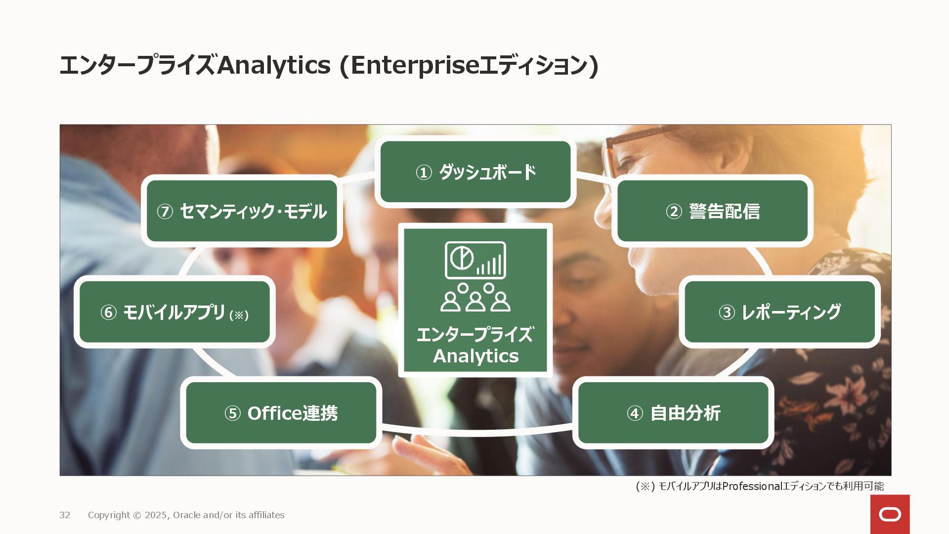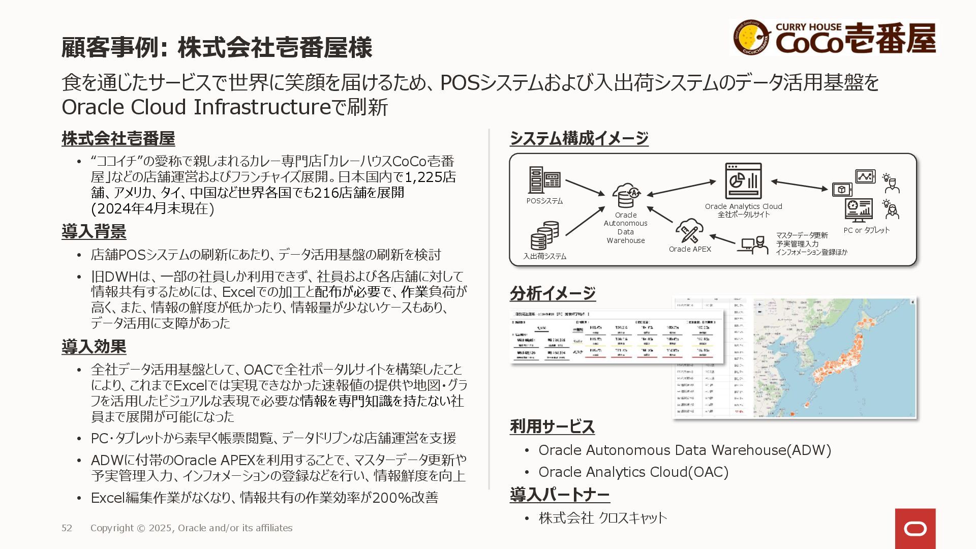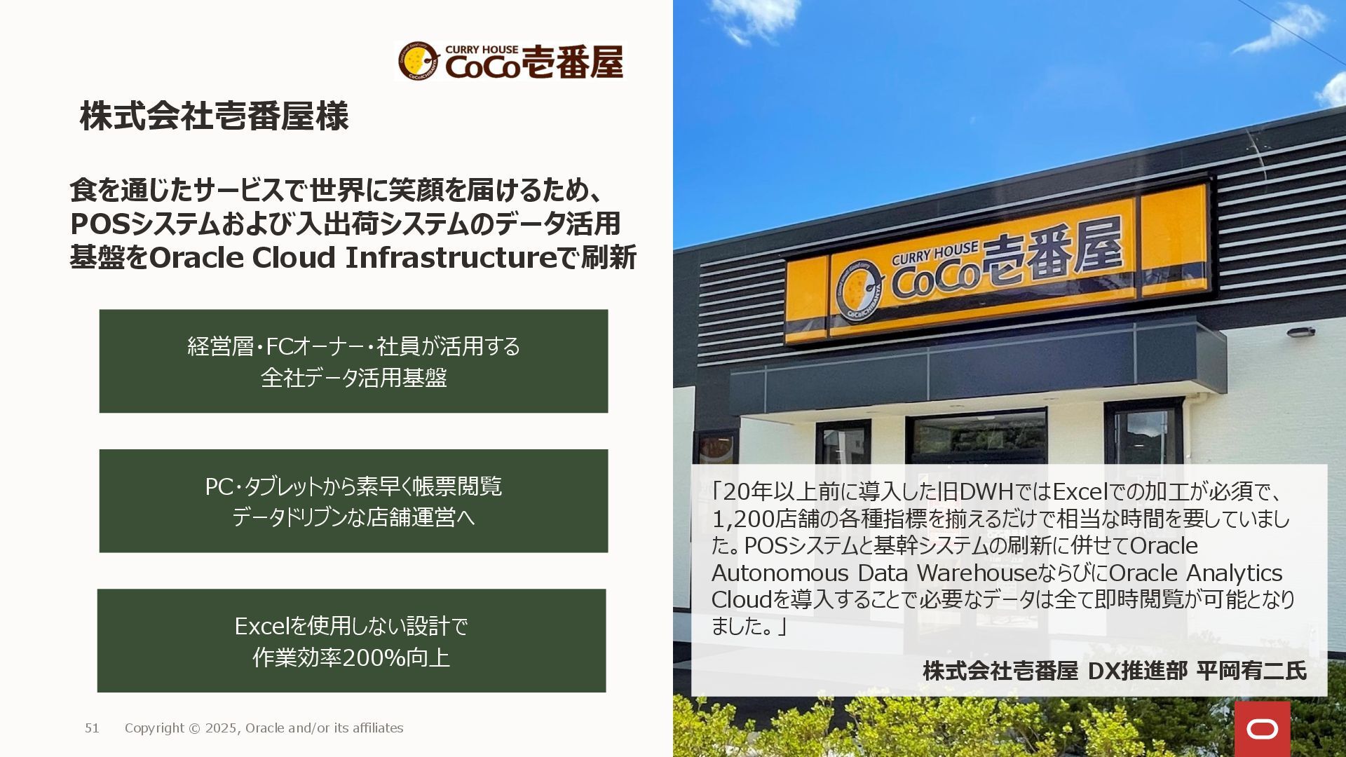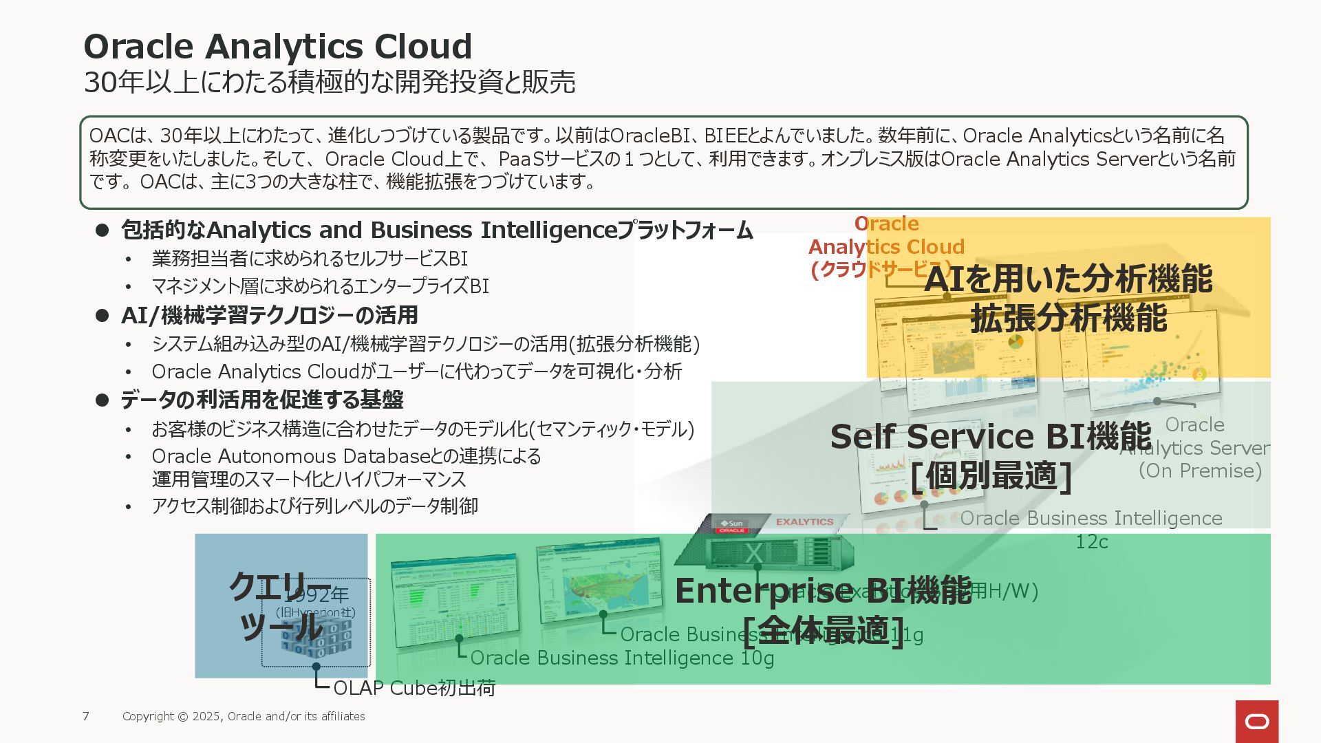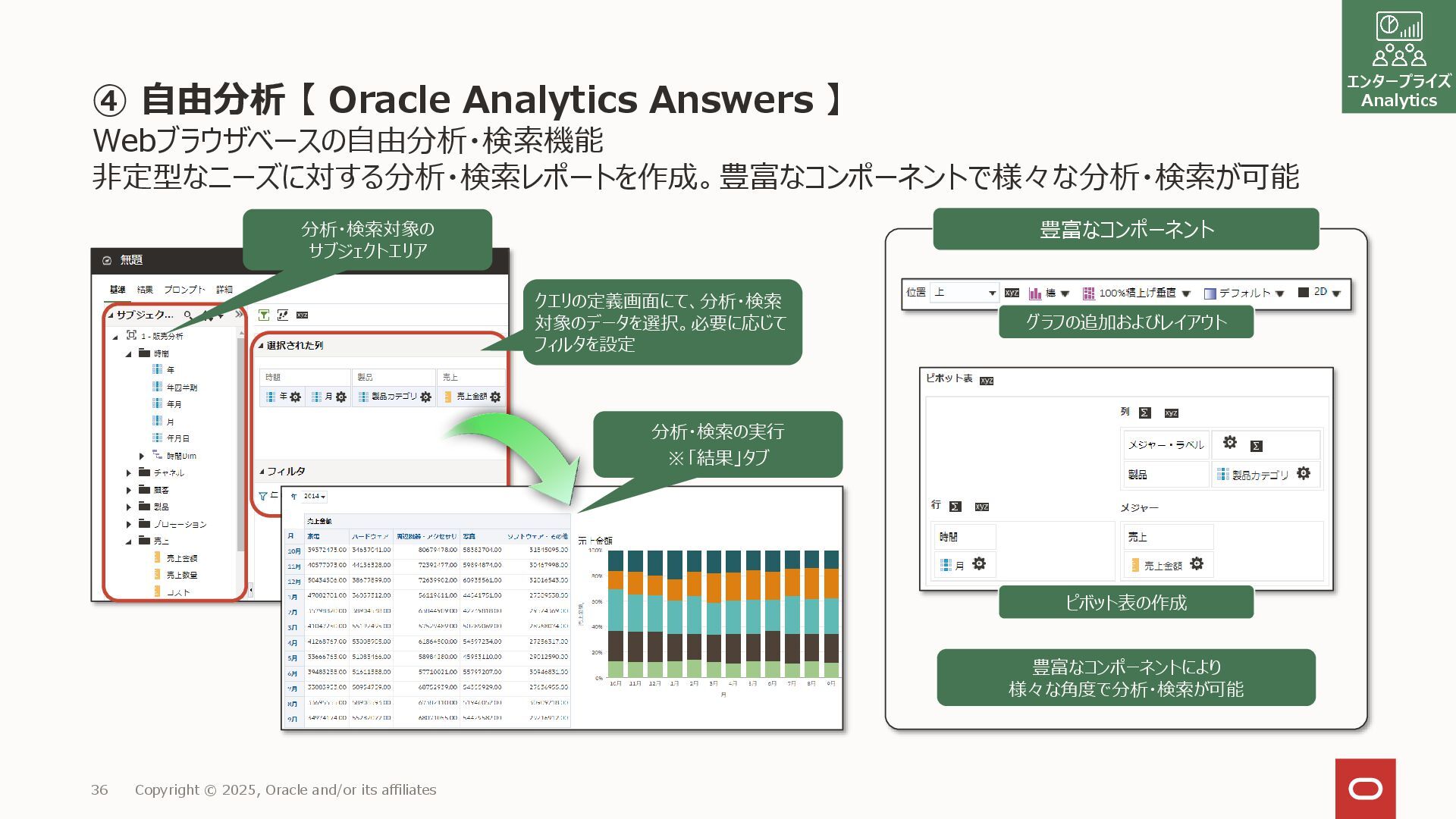 ユーザーライセンス) (設定シナリオ) • サイジングの諸条件 (ユースケースなど) を割愛し、シンプルにユーザー数 (10/25/50/100/200/300) でコスト比較した場合 • Professionalエディション • Annual Flex • CPUライセンスは本番: 2OCUP • CPUライセンスの月換算時間: 24時間 x 31日間 = 744時間 46 Copyright © 2025, Oracle and/or its affiliates ユーザー数 CPUライセンス (OCPU Per Hour – 本番: 2OCPU) ユーザーライセンス (User Per Month※) 10 ¥248,007.192 ¥24,800 25 ¥248,007.192 ¥62,000 50 ¥248,007.192 ¥124,000 100 ¥248,007.192 ¥248,000 200 ¥248,007.192 ¥496,000 300 ¥248,007.192 ¥744,000 【月額コスト】 ユーザー数が少ない場合、 ユーザーライセンスがお得 ユーザー数が多い場合、 CPUライセンスがお得 ※ User Per Monthにて内部的に割り当てられているOCPU数は非公開。なお、構成制限は以下URLをご参照ください 参考) 「サービスを使用すると予想されるユーザーの数」 https://docs.oracle.com/cd/E83857_01/paas/analytics-cloud/acoci/what-sizing-options-are-available-you.html#GUID-7D6DB4EE-8DD5-44C5-9B6E- 9FA847463A5F__USERS ※ 最新情報は英語版マニュアルをご参照ください