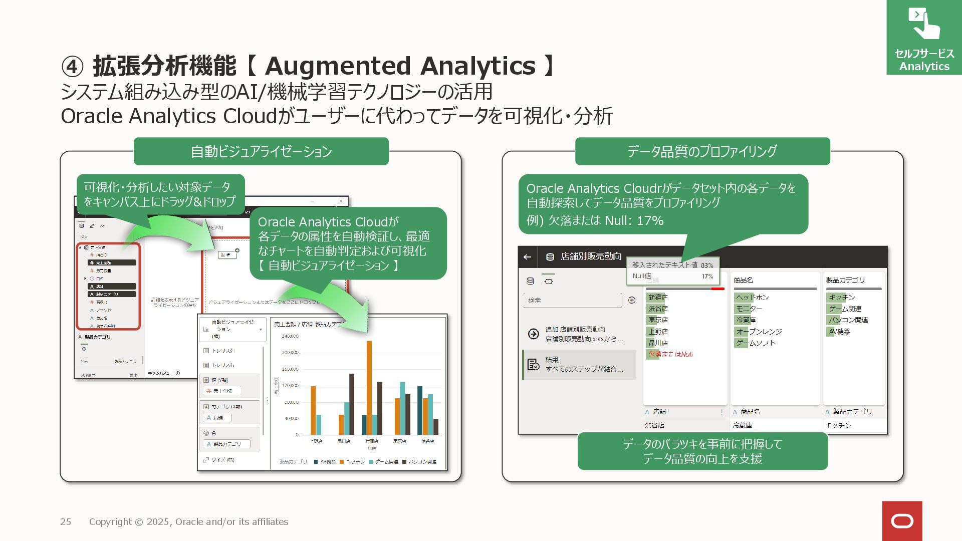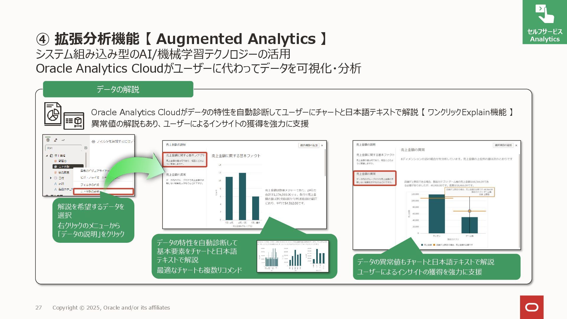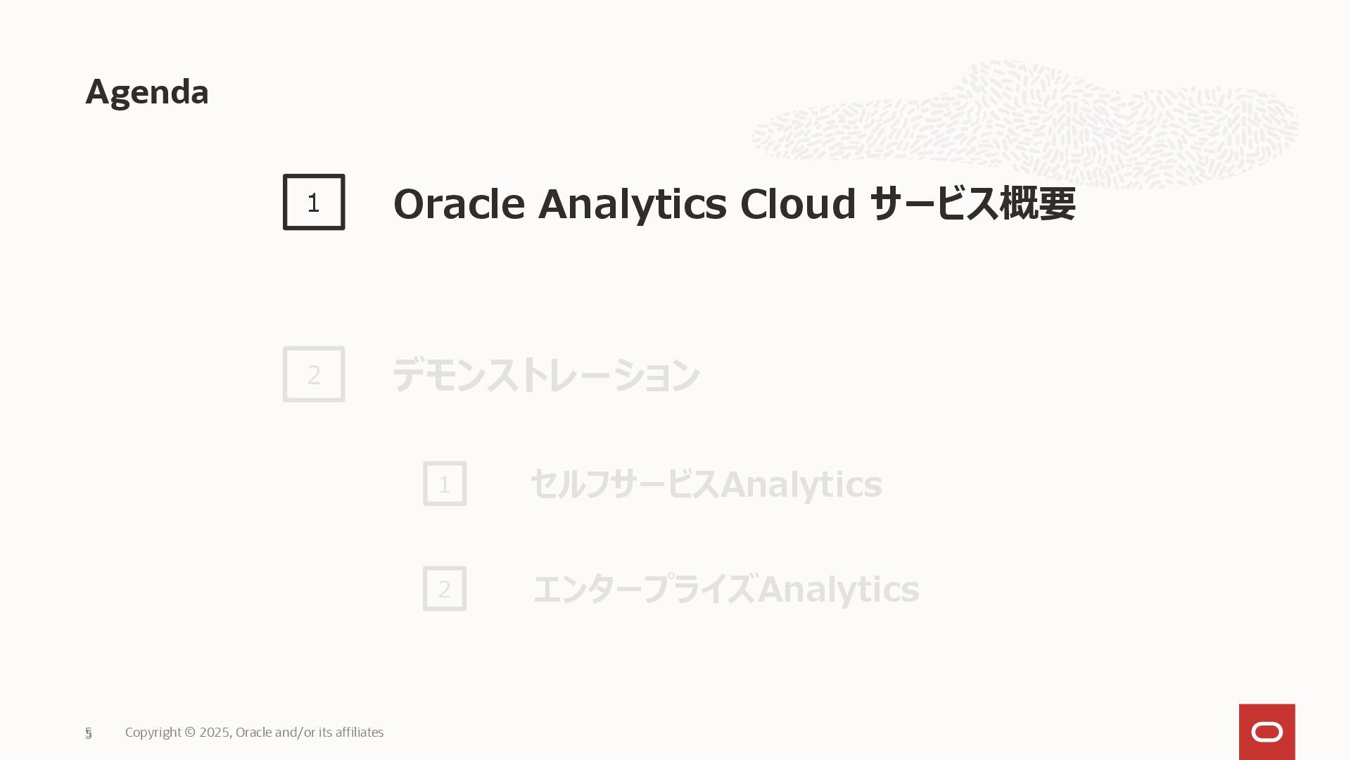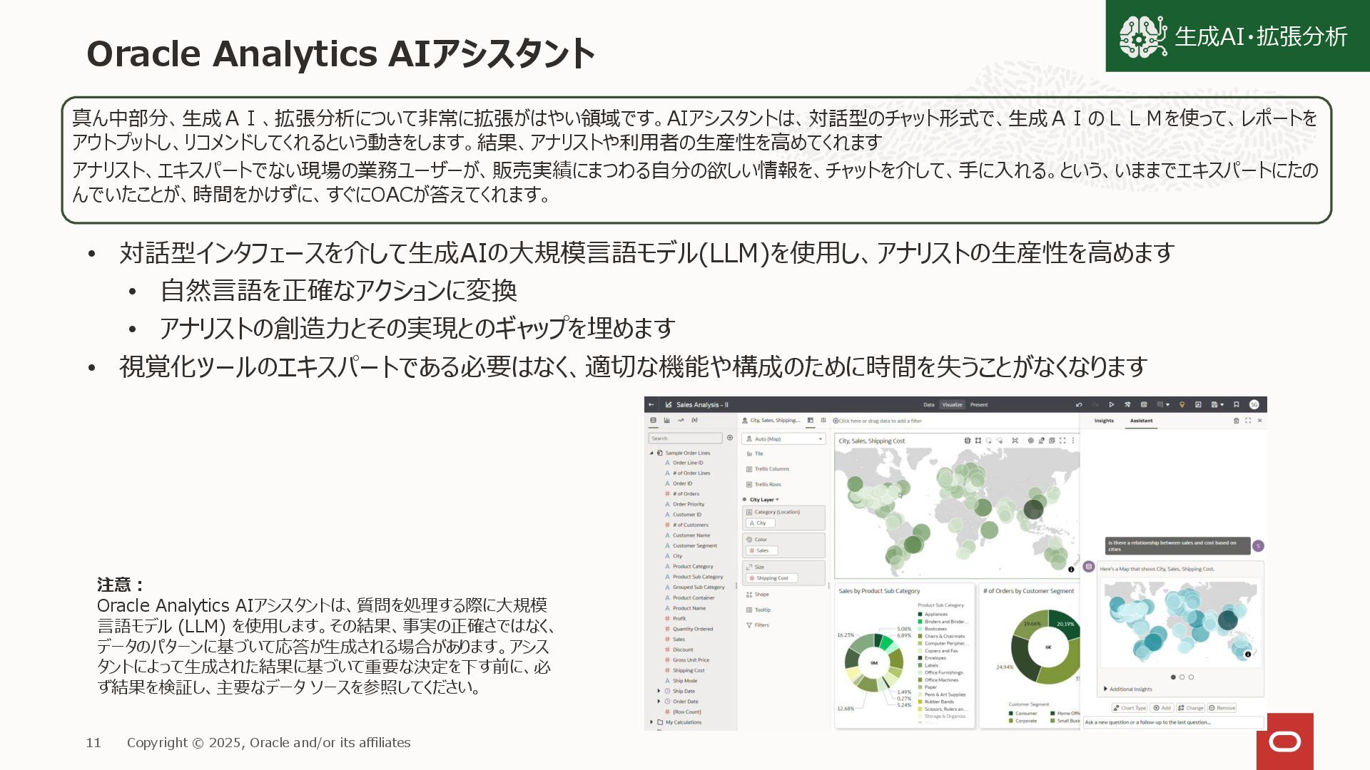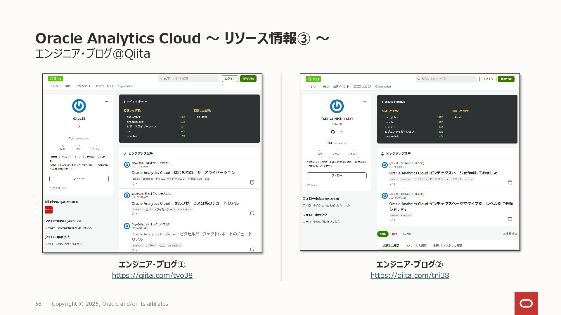 ユーザーライセンス) (設定シナリオ) • サイジングの諸条件 (ユースケースなど) を割愛し、シンプルにユーザー数 (10/25/50/100/200/300) でコスト比較した場合 • Professionalエディション • Annual Flex • CPUライセンスは本番: 2OCUP • CPUライセンスの月換算時間: 24時間 x 31日間 = 744時間 46 Copyright © 2025, Oracle and/or its affiliates ユーザー数 CPUライセンス (OCPU Per Hour – 本番: 2OCPU) ユーザーライセンス (User Per Month※) 10 ¥248,007.192 ¥24,800 25 ¥248,007.192 ¥62,000 50 ¥248,007.192 ¥124,000 100 ¥248,007.192 ¥248,000 200 ¥248,007.192 ¥496,000 300 ¥248,007.192 ¥744,000 【月額コスト】 ユーザー数が少ない場合、 ユーザーライセンスがお得 ユーザー数が多い場合、 CPUライセンスがお得 ※ User Per Monthにて内部的に割り当てられているOCPU数は非公開。なお、構成制限は以下URLをご参照ください 参考) 「サービスを使用すると予想されるユーザーの数」 https://docs.oracle.com/cd/E83857_01/paas/analytics-cloud/acoci/what-sizing-options-are-available-you.html#GUID-7D6DB4EE-8DD5-44C5-9B6E- 9FA847463A5F__USERS ※ 最新情報は英語版マニュアルをご参照ください