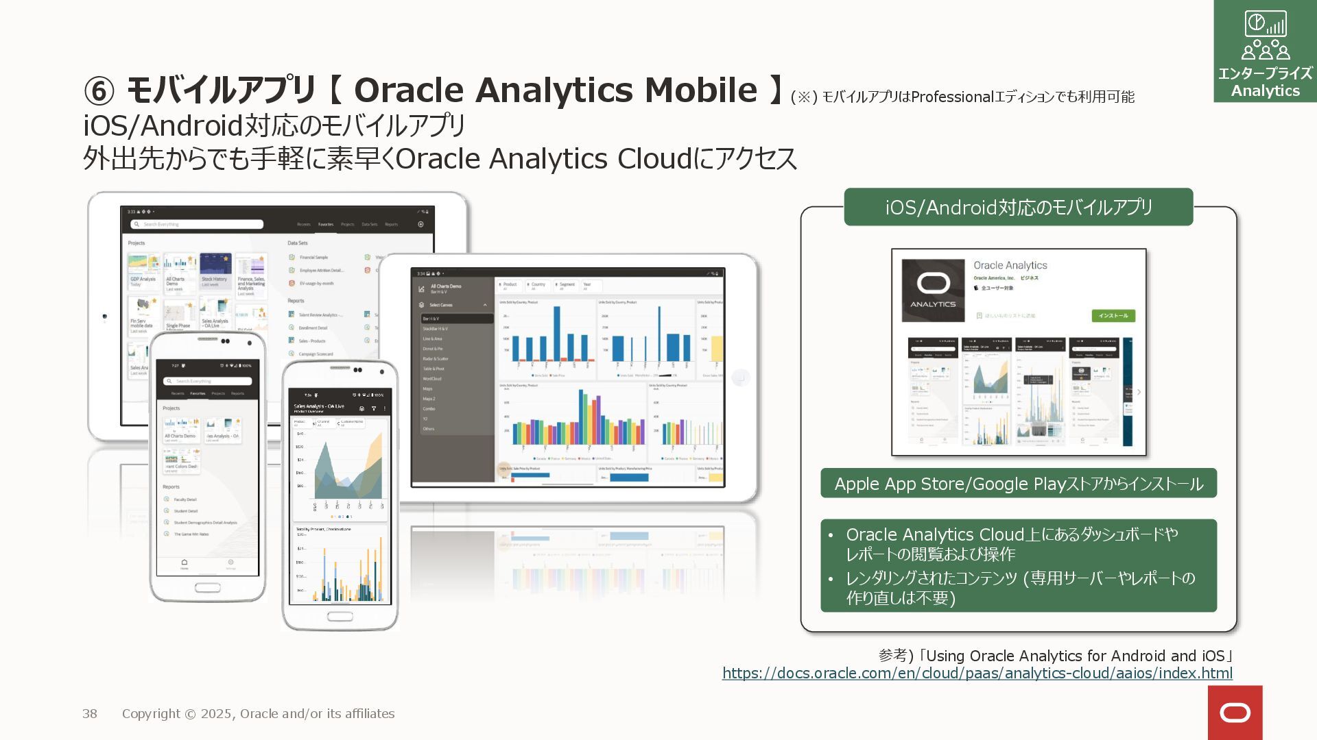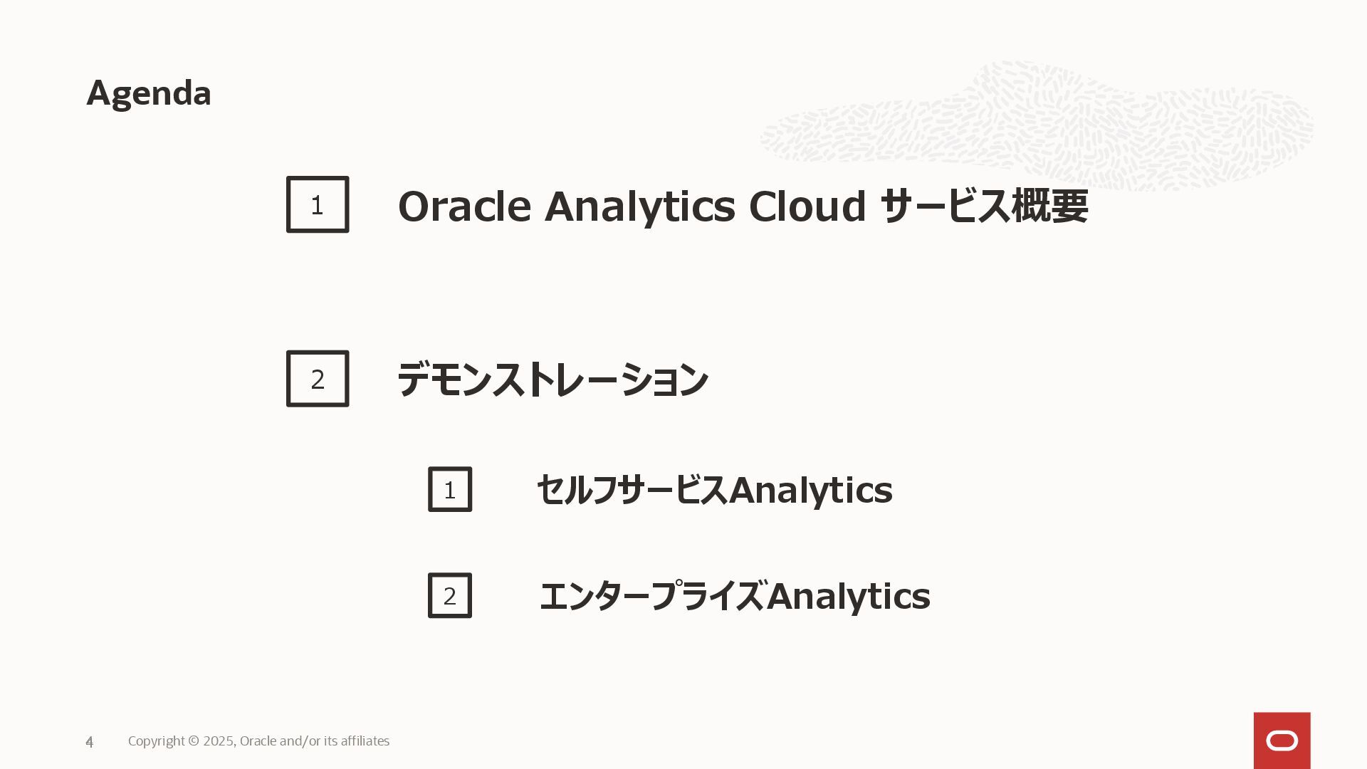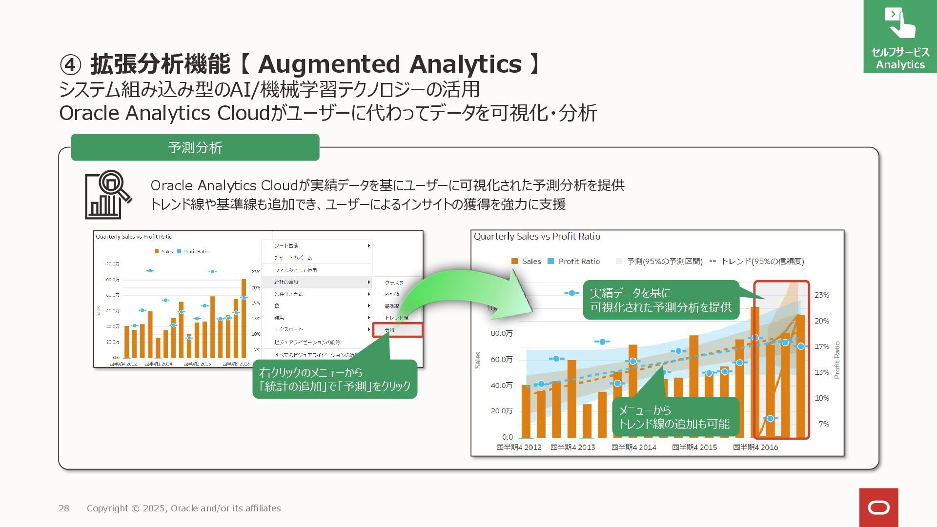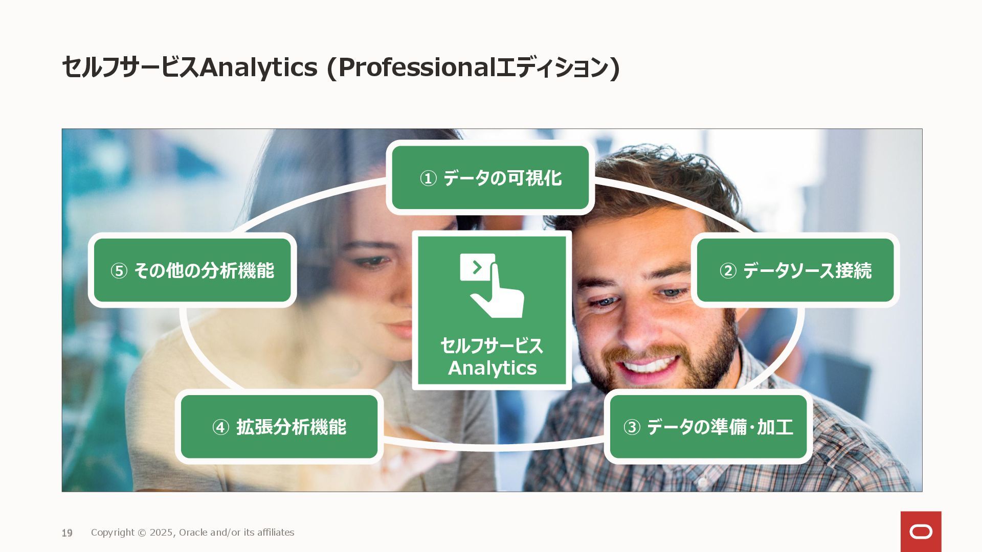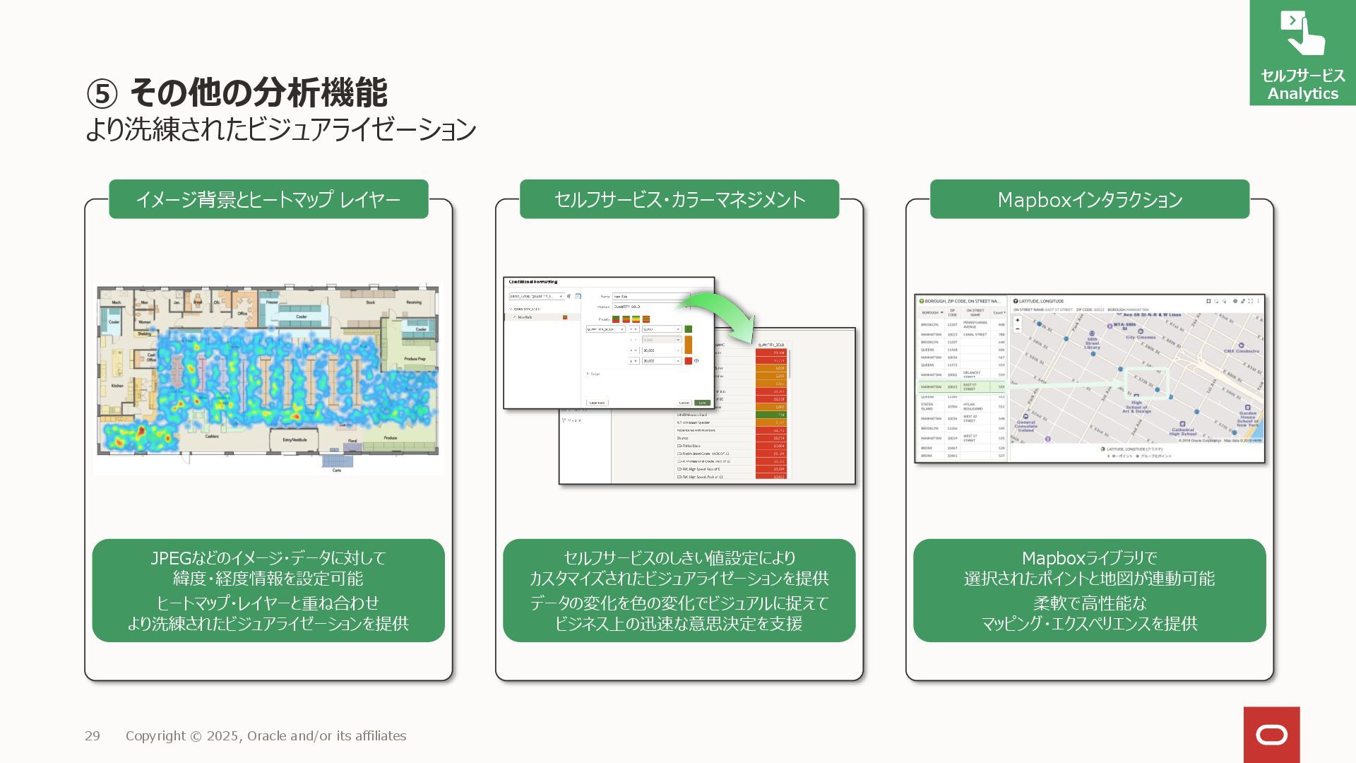 ユーザーライセンス) (設定シナリオ) • サイジングの諸条件 (ユースケースなど) を割愛し、シンプルにユーザー数 (10/25/50/100/200/300) でコスト比較した場合 • Professionalエディション • Annual Flex • CPUライセンスは本番: 2OCUP • CPUライセンスの月換算時間: 24時間 x 31日間 = 744時間 46 Copyright © 2025, Oracle and/or its affiliates ユーザー数 CPUライセンス (OCPU Per Hour – 本番: 2OCPU) ユーザーライセンス (User Per Month※) 10 ¥248,007.192 ¥24,800 25 ¥248,007.192 ¥62,000 50 ¥248,007.192 ¥124,000 100 ¥248,007.192 ¥248,000 200 ¥248,007.192 ¥496,000 300 ¥248,007.192 ¥744,000 【月額コスト】 ユーザー数が少ない場合、 ユーザーライセンスがお得 ユーザー数が多い場合、 CPUライセンスがお得 ※ User Per Monthにて内部的に割り当てられているOCPU数は非公開。なお、構成制限は以下URLをご参照ください 参考) 「サービスを使用すると予想されるユーザーの数」 https://docs.oracle.com/cd/E83857_01/paas/analytics-cloud/acoci/what-sizing-options-are-available-you.html#GUID-7D6DB4EE-8DD5-44C5-9B6E- 9FA847463A5F__USERS ※ 最新情報は英語版マニュアルをご参照ください