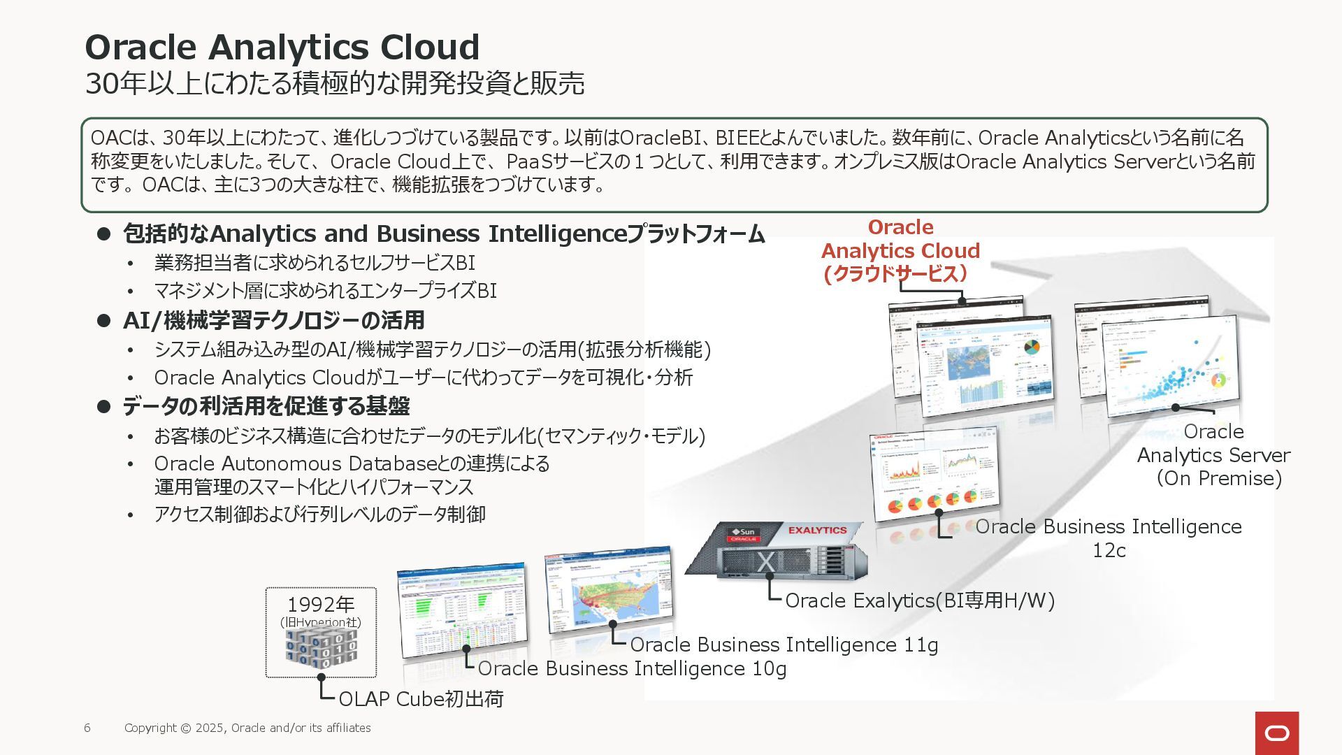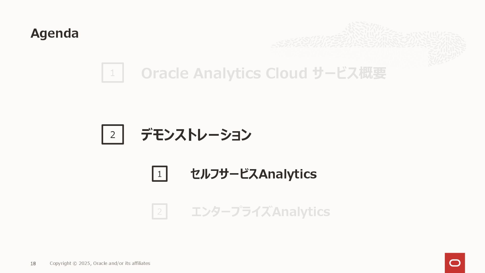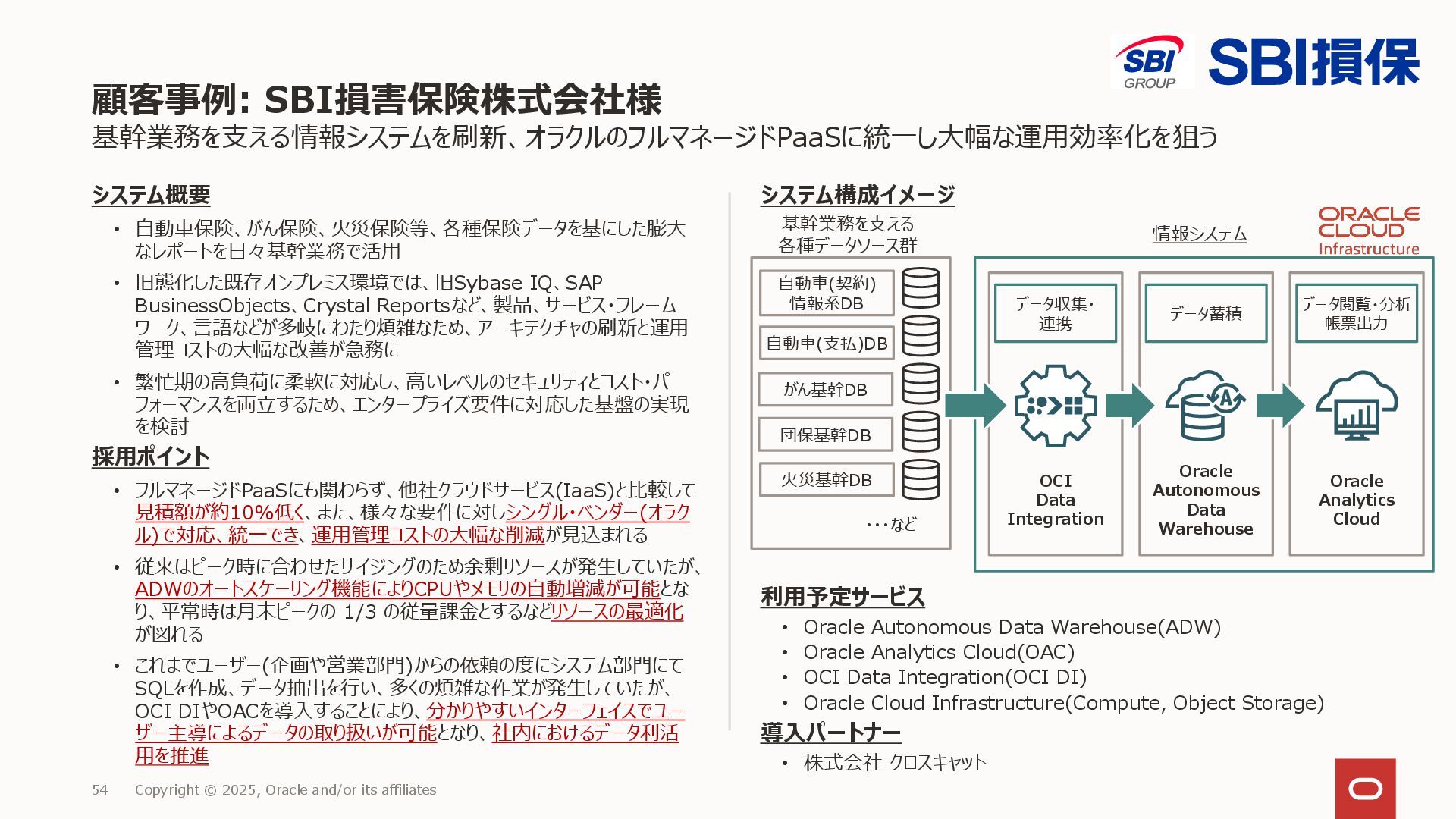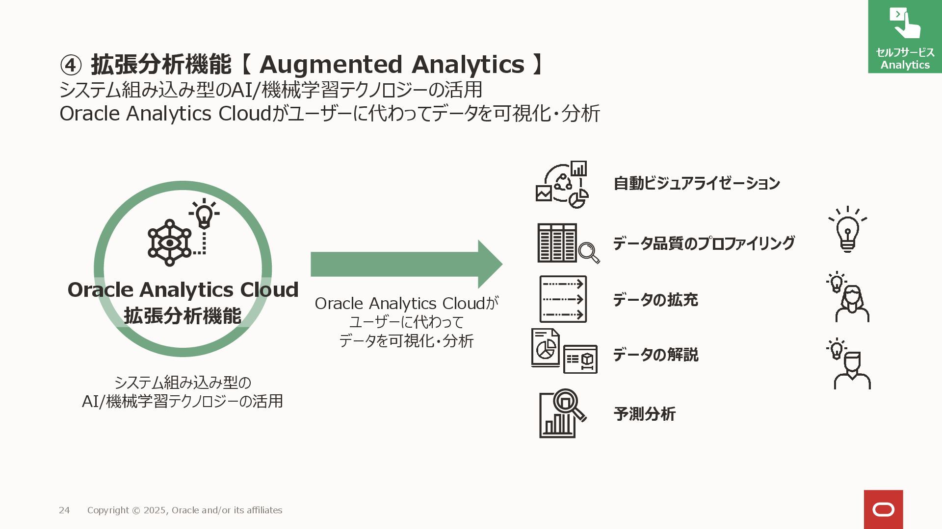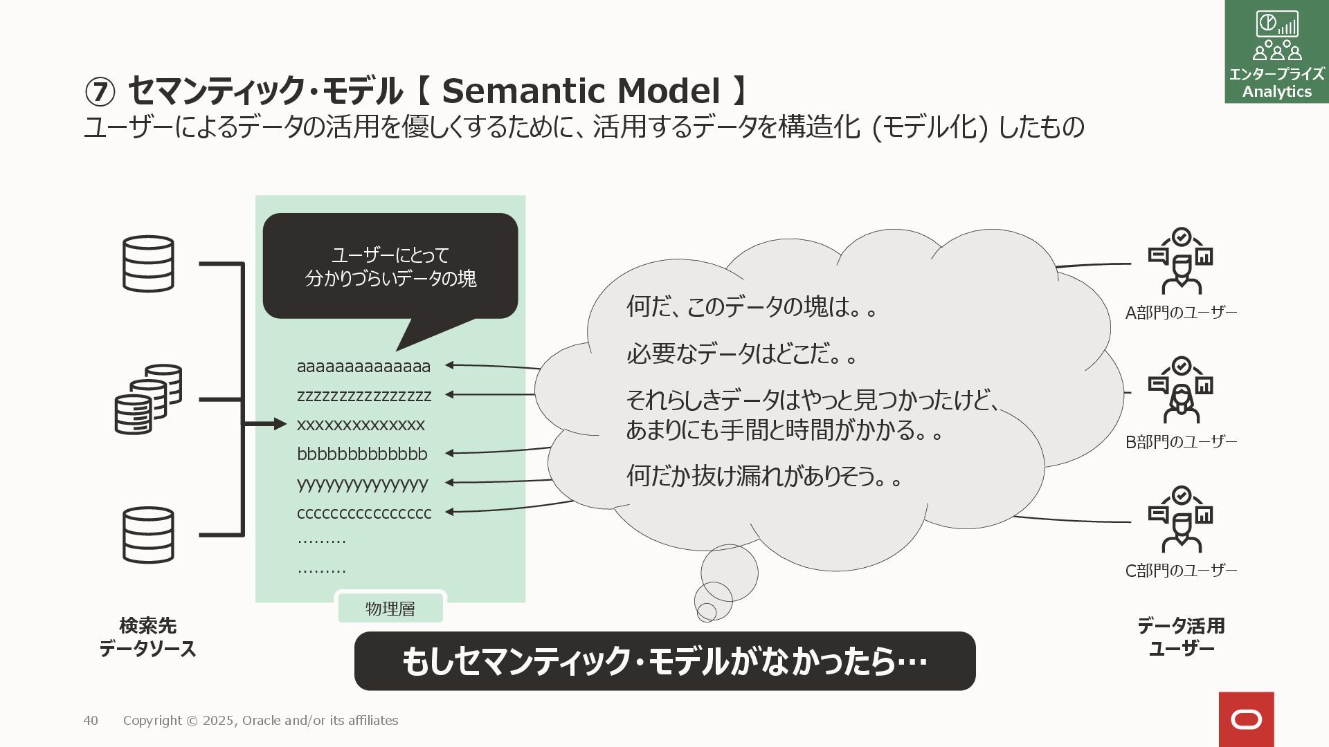 ユーザーライセンス) (設定シナリオ) • サイジングの諸条件 (ユースケースなど) を割愛し、シンプルにユーザー数 (10/25/50/100/200/300) でコスト比較した場合 • Professionalエディション • Annual Flex • CPUライセンスは本番: 2OCUP • CPUライセンスの月換算時間: 24時間 x 31日間 = 744時間 46 Copyright © 2025, Oracle and/or its affiliates ユーザー数 CPUライセンス (OCPU Per Hour – 本番: 2OCPU) ユーザーライセンス (User Per Month※) 10 ¥248,007.192 ¥24,800 25 ¥248,007.192 ¥62,000 50 ¥248,007.192 ¥124,000 100 ¥248,007.192 ¥248,000 200 ¥248,007.192 ¥496,000 300 ¥248,007.192 ¥744,000 【月額コスト】 ユーザー数が少ない場合、 ユーザーライセンスがお得 ユーザー数が多い場合、 CPUライセンスがお得 ※ User Per Monthにて内部的に割り当てられているOCPU数は非公開。なお、構成制限は以下URLをご参照ください 参考) 「サービスを使用すると予想されるユーザーの数」 https://docs.oracle.com/cd/E83857_01/paas/analytics-cloud/acoci/what-sizing-options-are-available-you.html#GUID-7D6DB4EE-8DD5-44C5-9B6E- 9FA847463A5F__USERS ※ 最新情報は英語版マニュアルをご参照ください