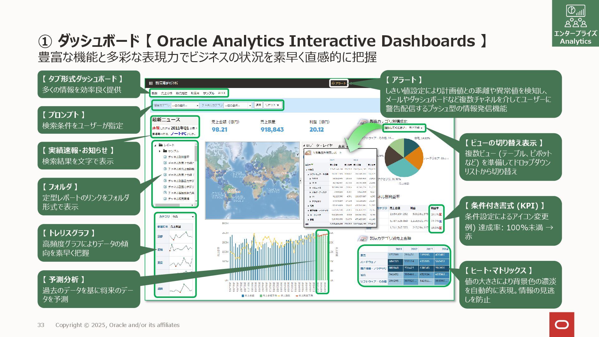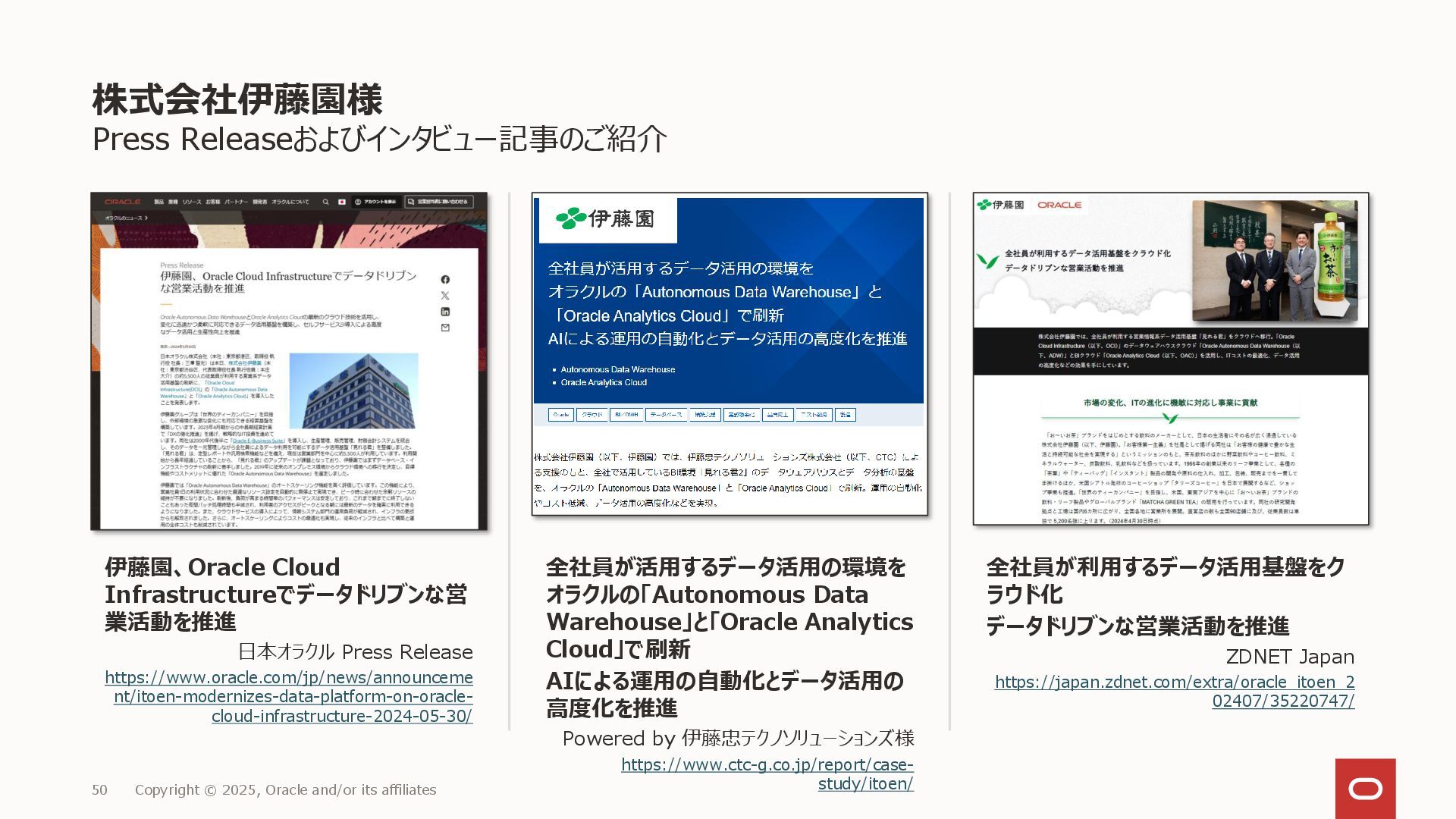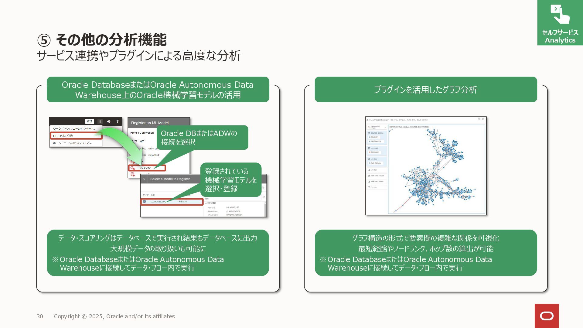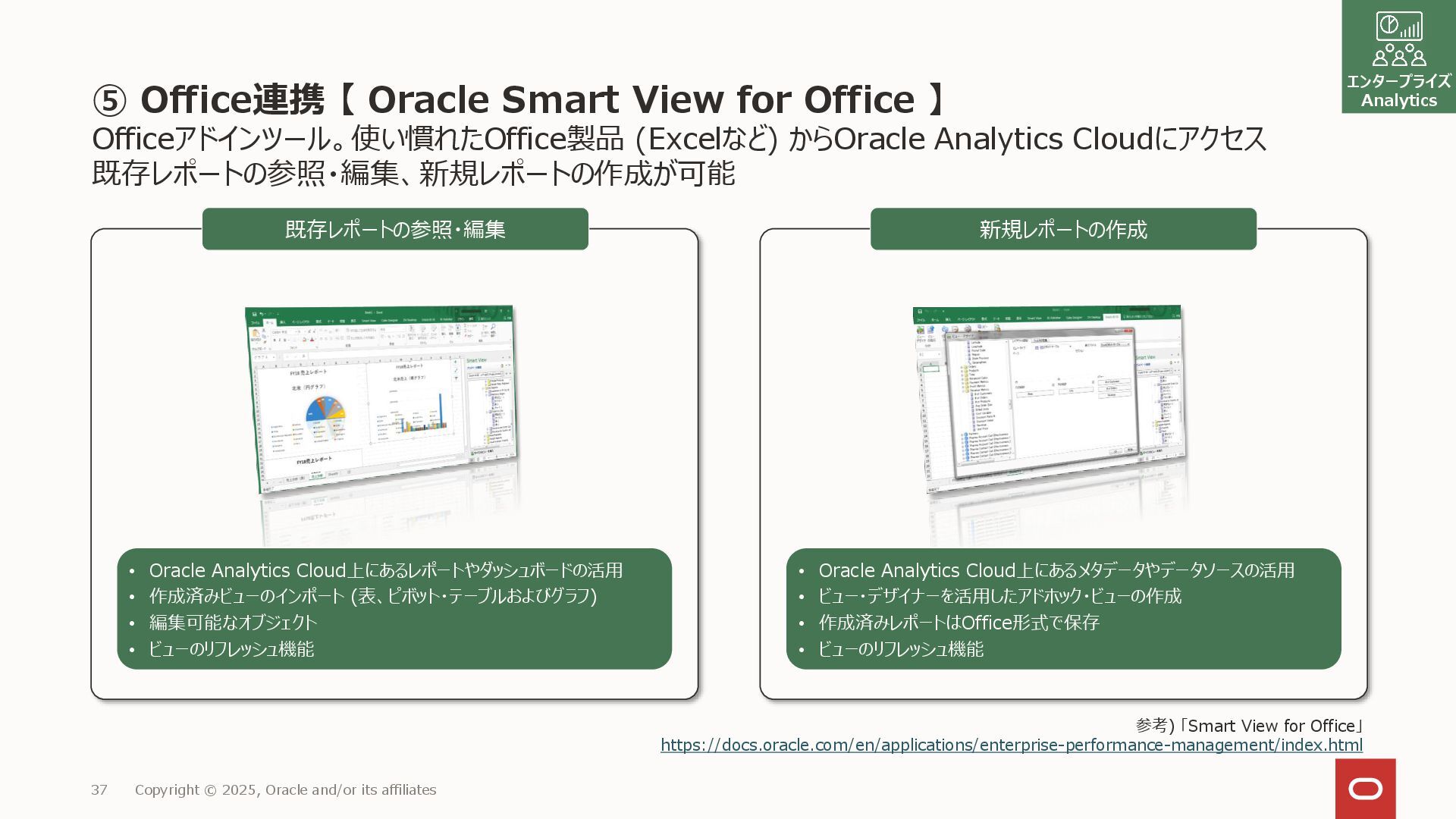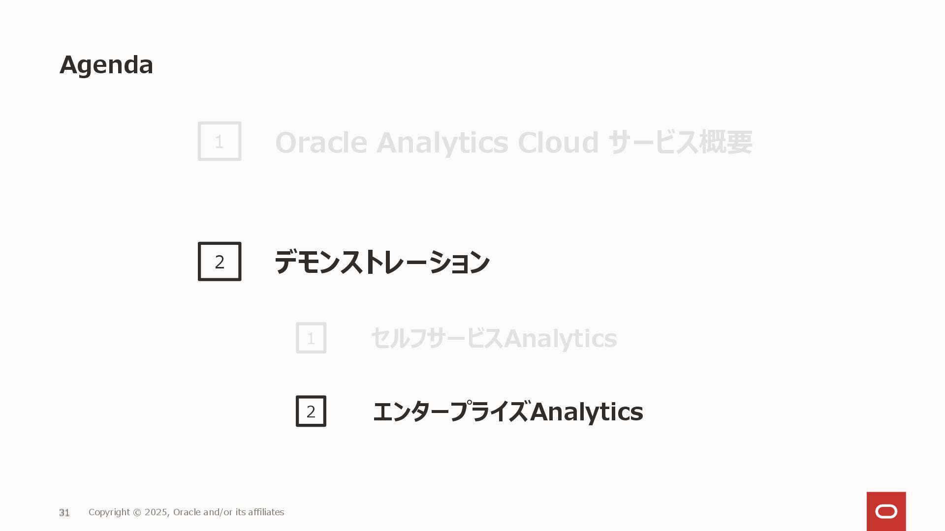 ユーザーライセンス) (設定シナリオ) • サイジングの諸条件 (ユースケースなど) を割愛し、シンプルにユーザー数 (10/25/50/100/200/300) でコスト比較した場合 • Professionalエディション • Annual Flex • CPUライセンスは本番: 2OCUP • CPUライセンスの月換算時間: 24時間 x 31日間 = 744時間 46 Copyright © 2025, Oracle and/or its affiliates ユーザー数 CPUライセンス (OCPU Per Hour – 本番: 2OCPU) ユーザーライセンス (User Per Month※) 10 ¥248,007.192 ¥24,800 25 ¥248,007.192 ¥62,000 50 ¥248,007.192 ¥124,000 100 ¥248,007.192 ¥248,000 200 ¥248,007.192 ¥496,000 300 ¥248,007.192 ¥744,000 【月額コスト】 ユーザー数が少ない場合、 ユーザーライセンスがお得 ユーザー数が多い場合、 CPUライセンスがお得 ※ User Per Monthにて内部的に割り当てられているOCPU数は非公開。なお、構成制限は以下URLをご参照ください 参考) 「サービスを使用すると予想されるユーザーの数」 https://docs.oracle.com/cd/E83857_01/paas/analytics-cloud/acoci/what-sizing-options-are-available-you.html#GUID-7D6DB4EE-8DD5-44C5-9B6E- 9FA847463A5F__USERS ※ 最新情報は英語版マニュアルをご参照ください