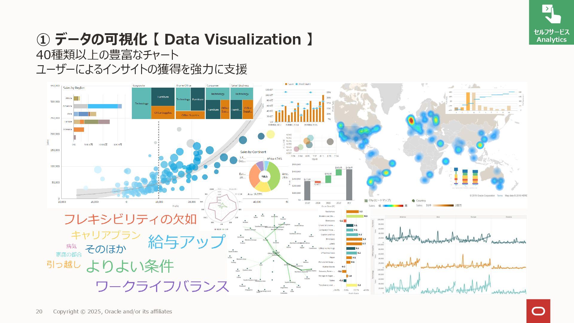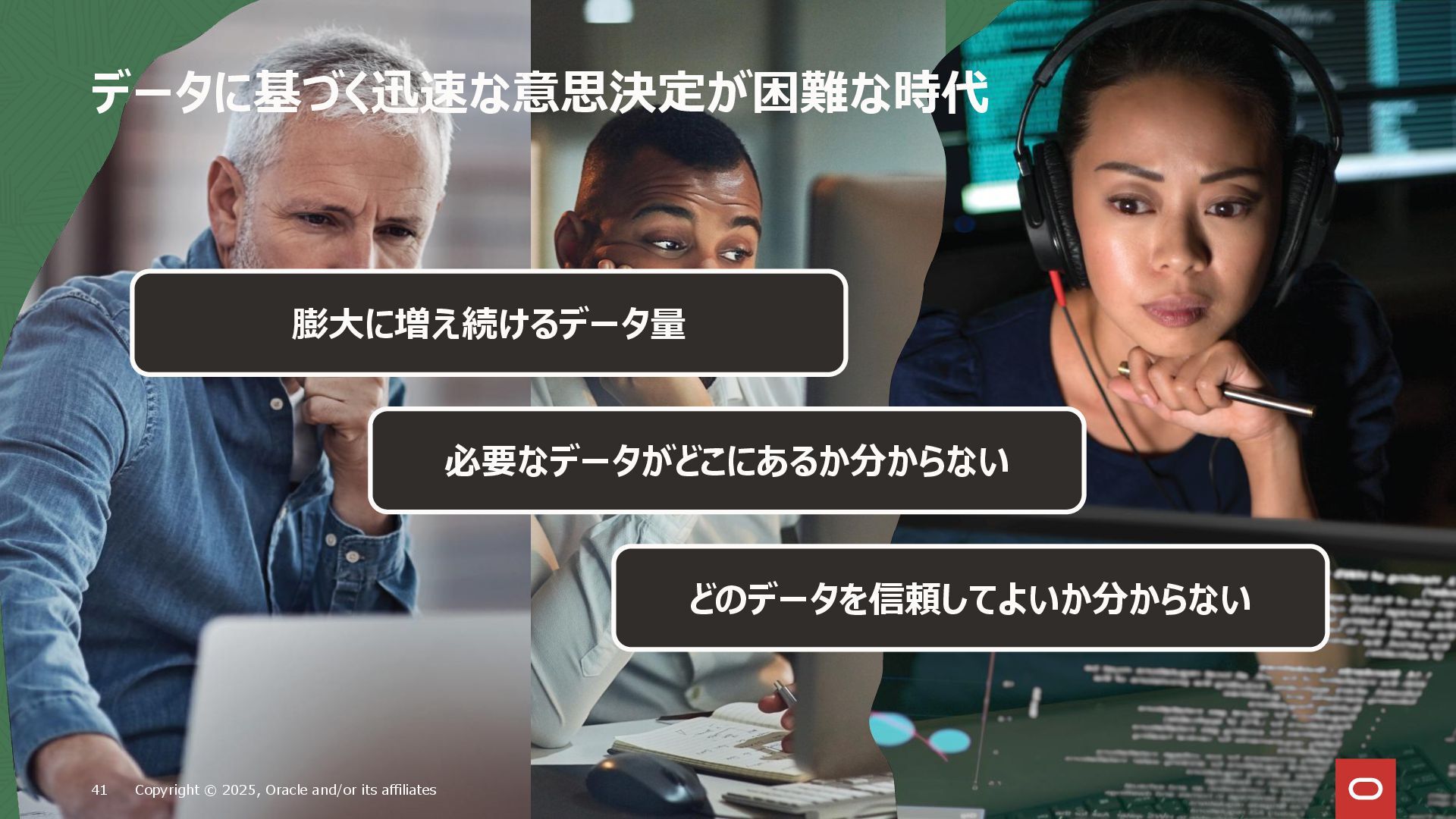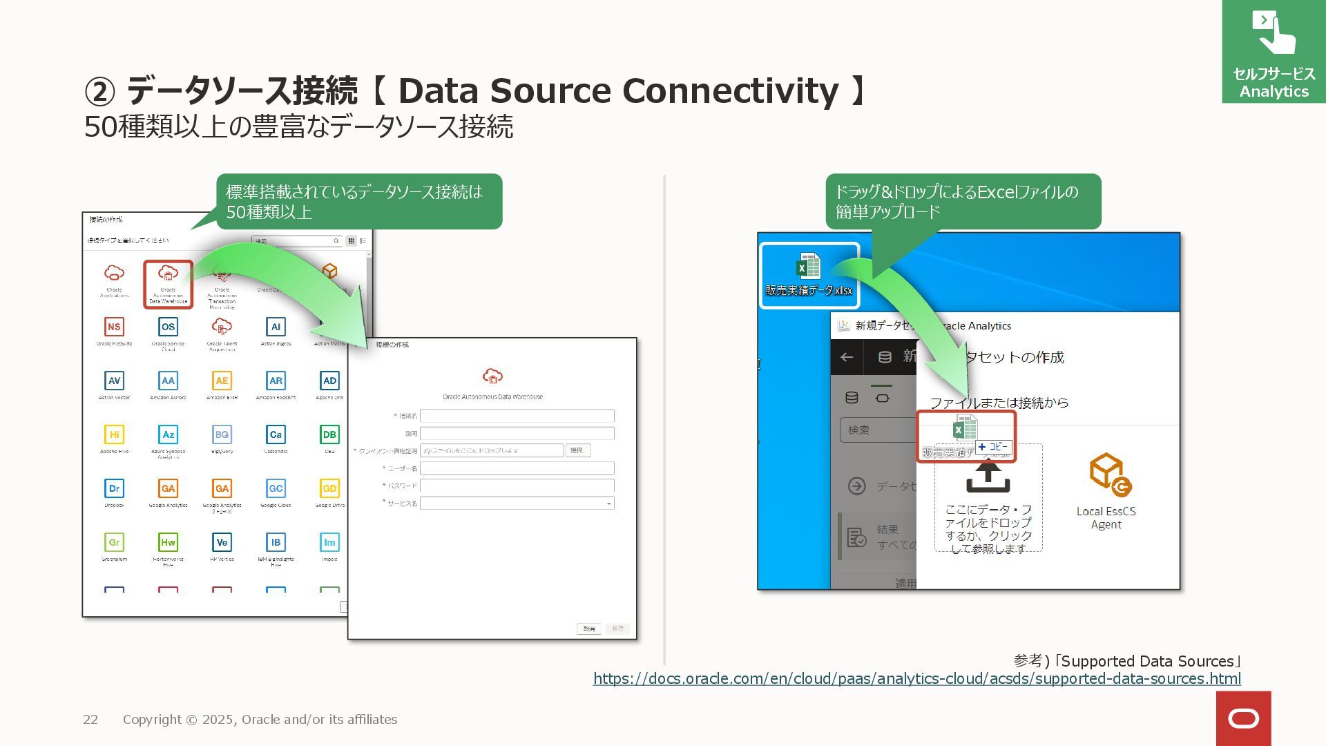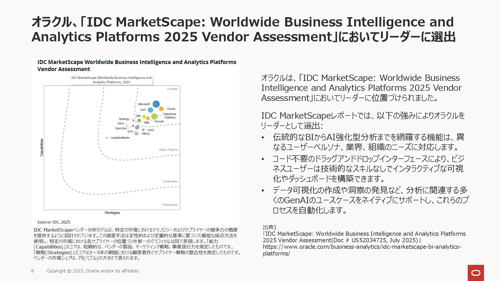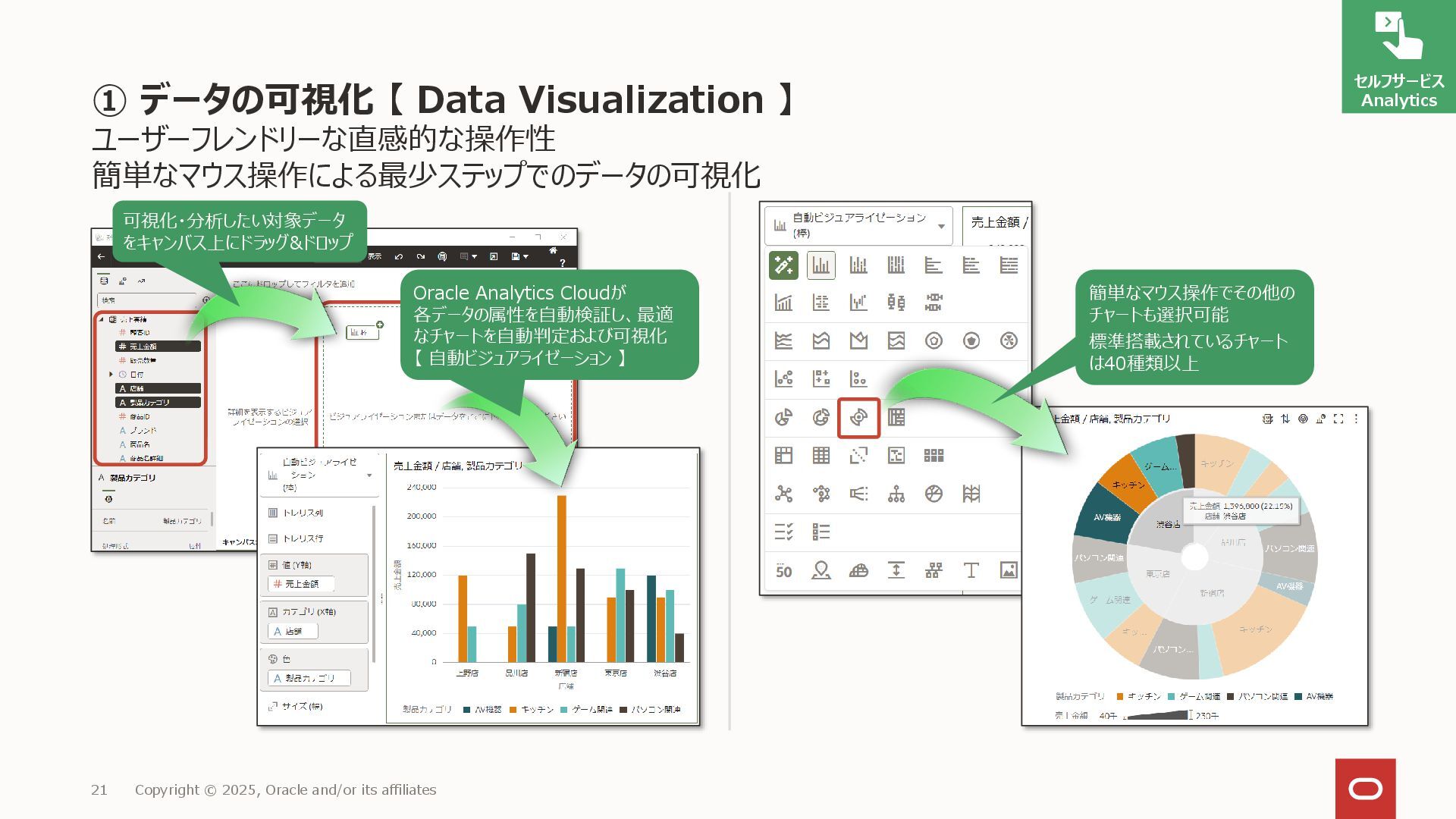 ユーザーライセンス) (設定シナリオ) • サイジングの諸条件 (ユースケースなど) を割愛し、シンプルにユーザー数 (10/25/50/100/200/300) でコスト比較した場合 • Professionalエディション • Annual Flex • CPUライセンスは本番: 2OCUP • CPUライセンスの月換算時間: 24時間 x 31日間 = 744時間 46 Copyright © 2025, Oracle and/or its affiliates ユーザー数 CPUライセンス (OCPU Per Hour – 本番: 2OCPU) ユーザーライセンス (User Per Month※) 10 ¥248,007.192 ¥24,800 25 ¥248,007.192 ¥62,000 50 ¥248,007.192 ¥124,000 100 ¥248,007.192 ¥248,000 200 ¥248,007.192 ¥496,000 300 ¥248,007.192 ¥744,000 【月額コスト】 ユーザー数が少ない場合、 ユーザーライセンスがお得 ユーザー数が多い場合、 CPUライセンスがお得 ※ User Per Monthにて内部的に割り当てられているOCPU数は非公開。なお、構成制限は以下URLをご参照ください 参考) 「サービスを使用すると予想されるユーザーの数」 https://docs.oracle.com/cd/E83857_01/paas/analytics-cloud/acoci/what-sizing-options-are-available-you.html#GUID-7D6DB4EE-8DD5-44C5-9B6E- 9FA847463A5F__USERS ※ 最新情報は英語版マニュアルをご参照ください