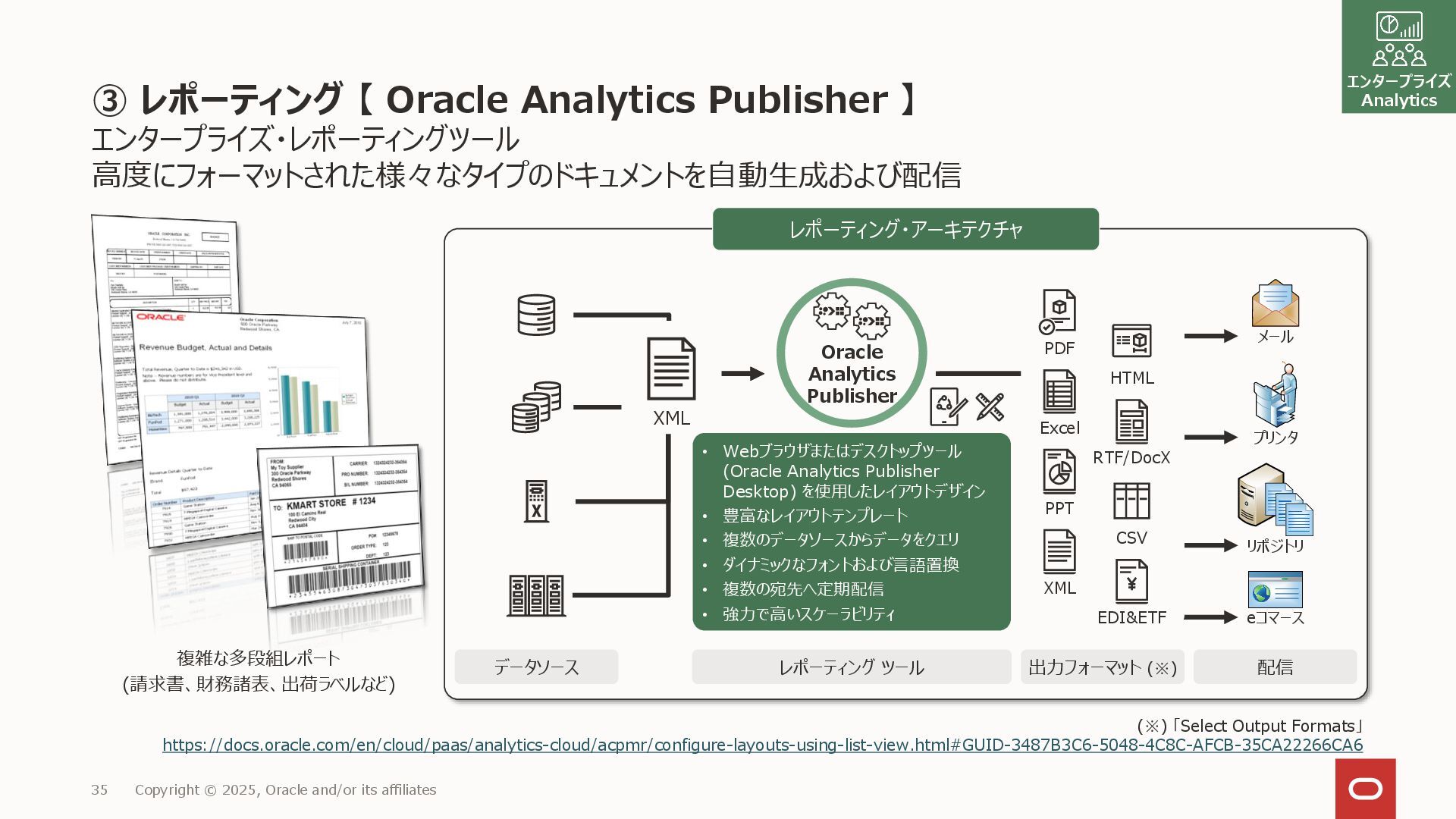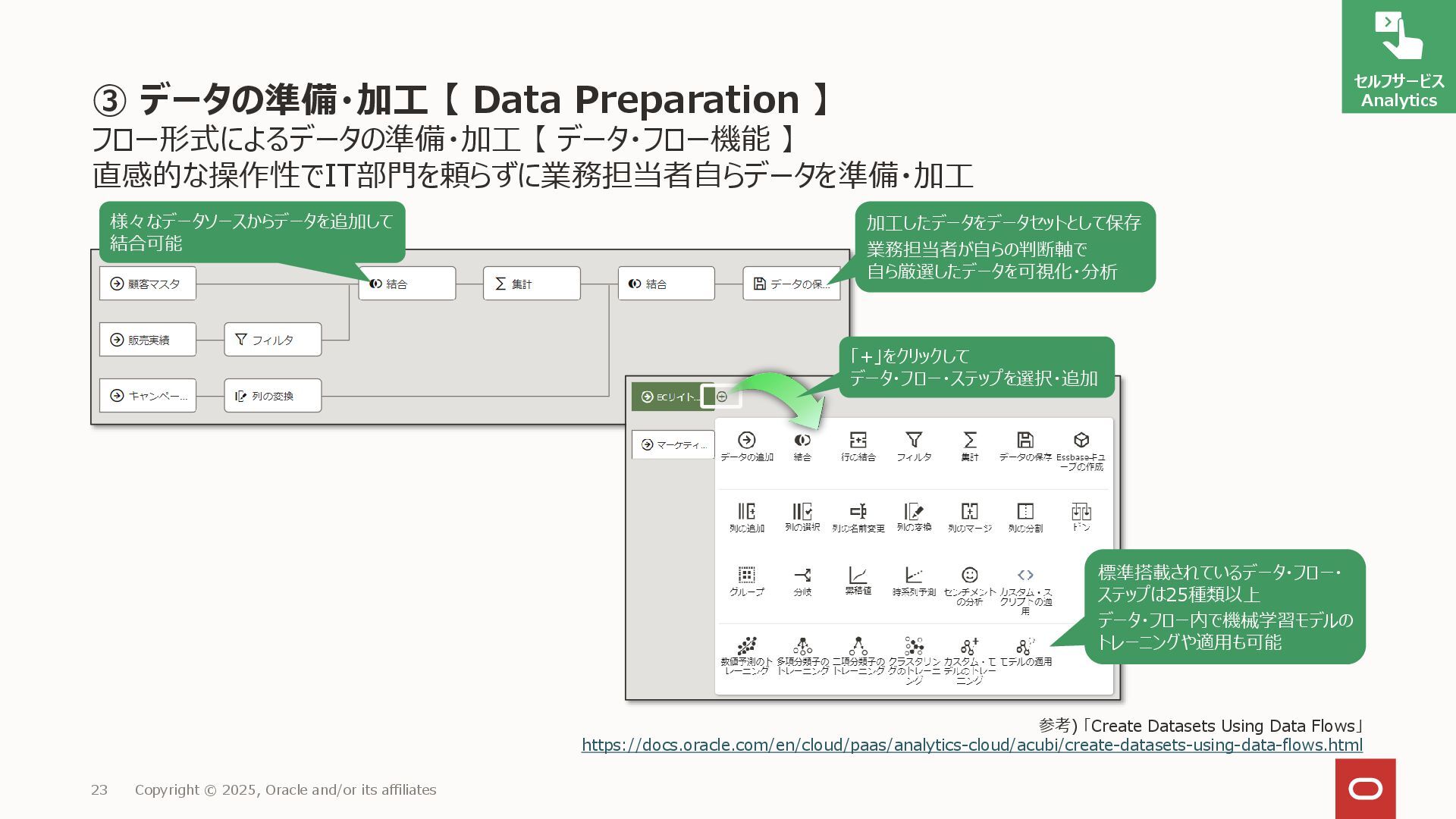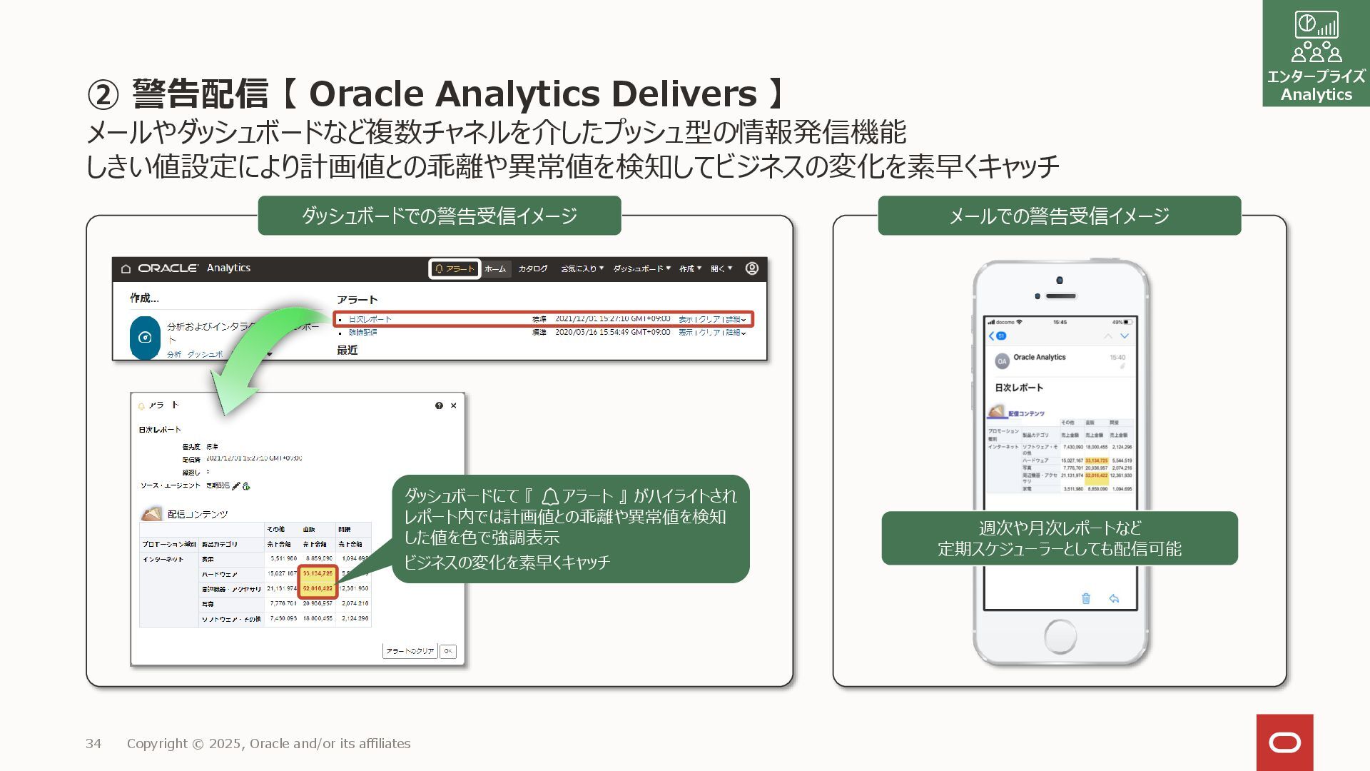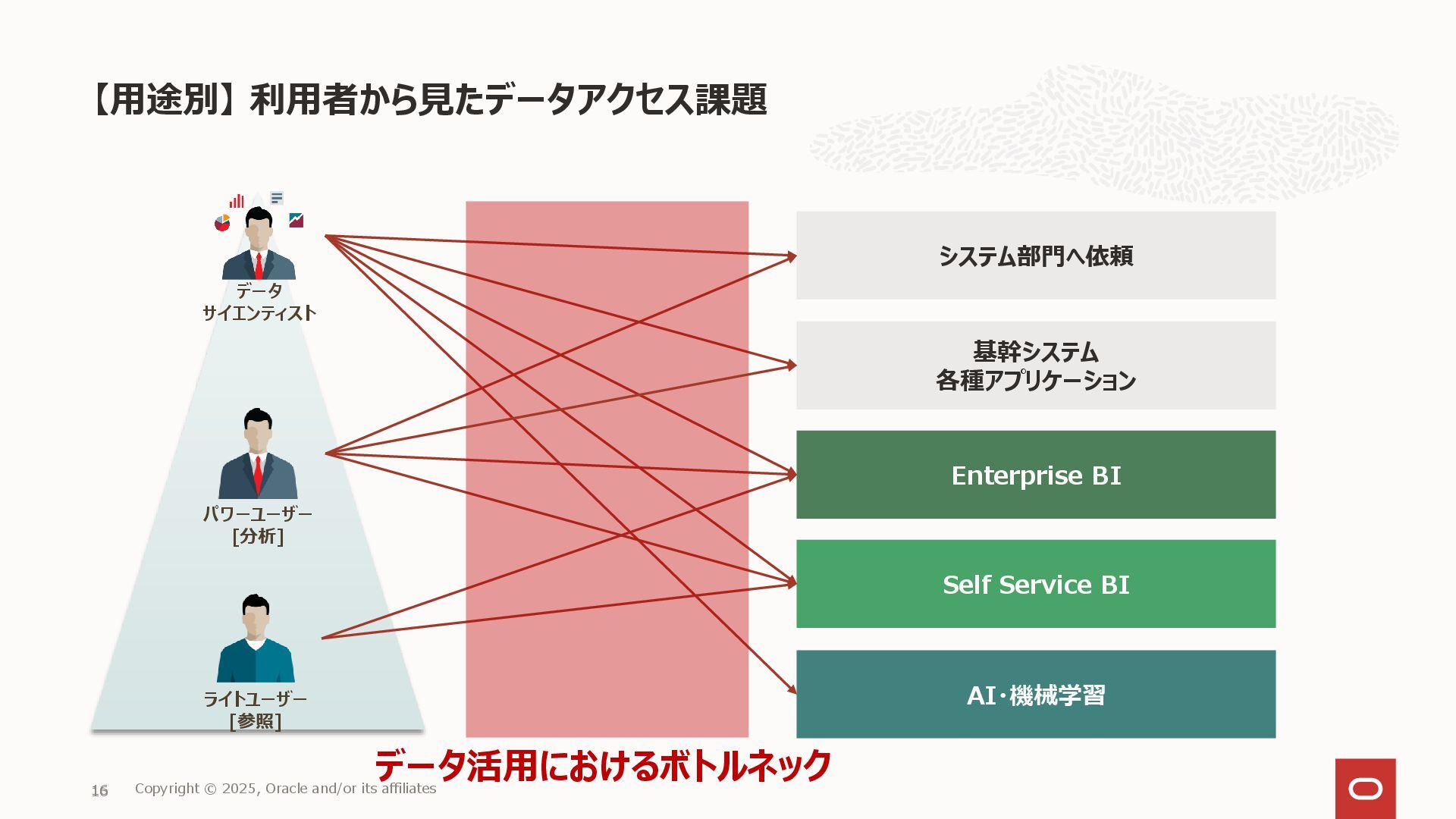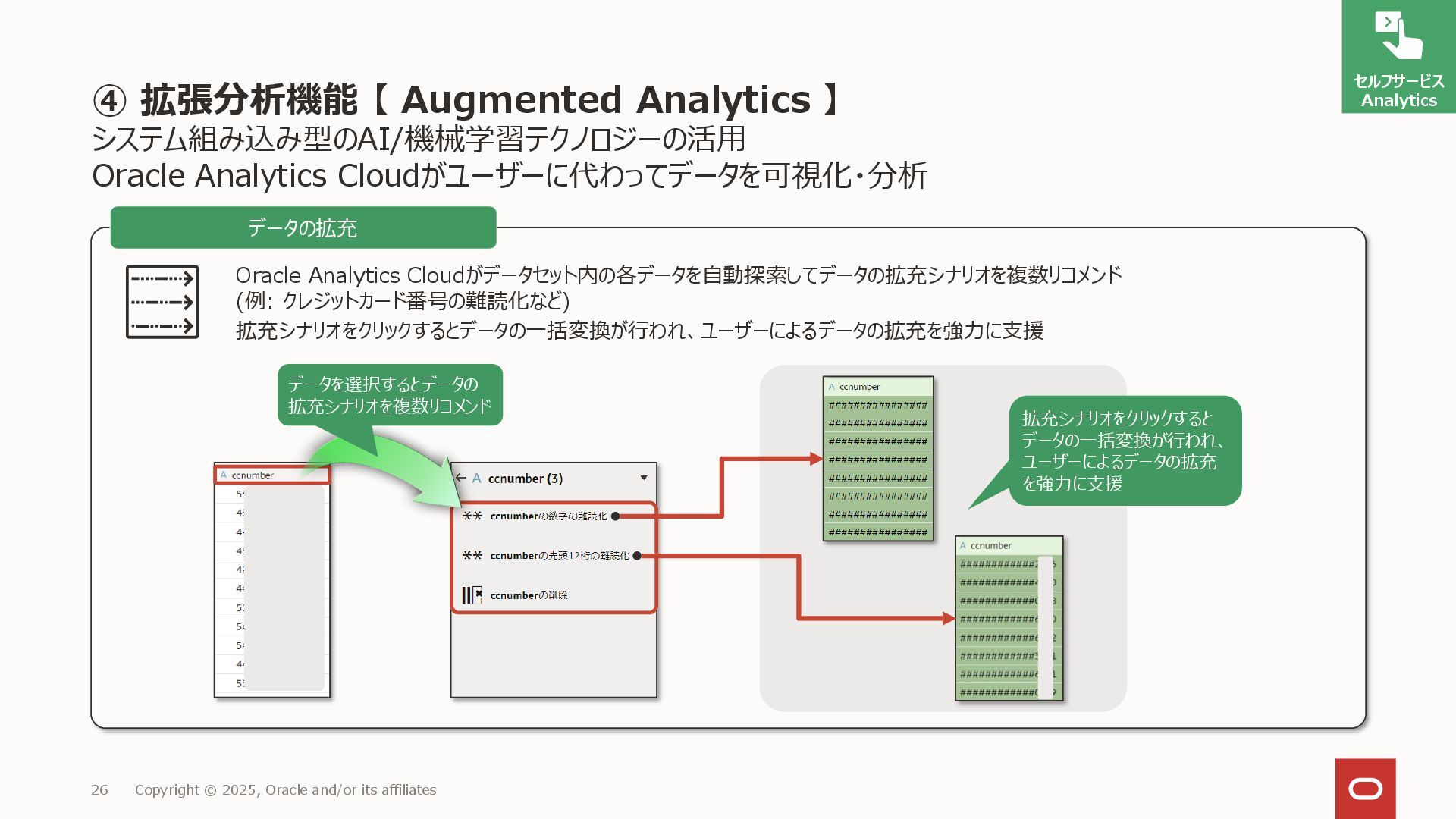 ユーザーライセンス) (設定シナリオ) • サイジングの諸条件 (ユースケースなど) を割愛し、シンプルにユーザー数 (10/25/50/100/200/300) でコスト比較した場合 • Professionalエディション • Annual Flex • CPUライセンスは本番: 2OCUP • CPUライセンスの月換算時間: 24時間 x 31日間 = 744時間 46 Copyright © 2025, Oracle and/or its affiliates ユーザー数 CPUライセンス (OCPU Per Hour – 本番: 2OCPU) ユーザーライセンス (User Per Month※) 10 ¥248,007.192 ¥24,800 25 ¥248,007.192 ¥62,000 50 ¥248,007.192 ¥124,000 100 ¥248,007.192 ¥248,000 200 ¥248,007.192 ¥496,000 300 ¥248,007.192 ¥744,000 【月額コスト】 ユーザー数が少ない場合、 ユーザーライセンスがお得 ユーザー数が多い場合、 CPUライセンスがお得 ※ User Per Monthにて内部的に割り当てられているOCPU数は非公開。なお、構成制限は以下URLをご参照ください 参考) 「サービスを使用すると予想されるユーザーの数」 https://docs.oracle.com/cd/E83857_01/paas/analytics-cloud/acoci/what-sizing-options-are-available-you.html#GUID-7D6DB4EE-8DD5-44C5-9B6E- 9FA847463A5F__USERS ※ 最新情報は英語版マニュアルをご参照ください