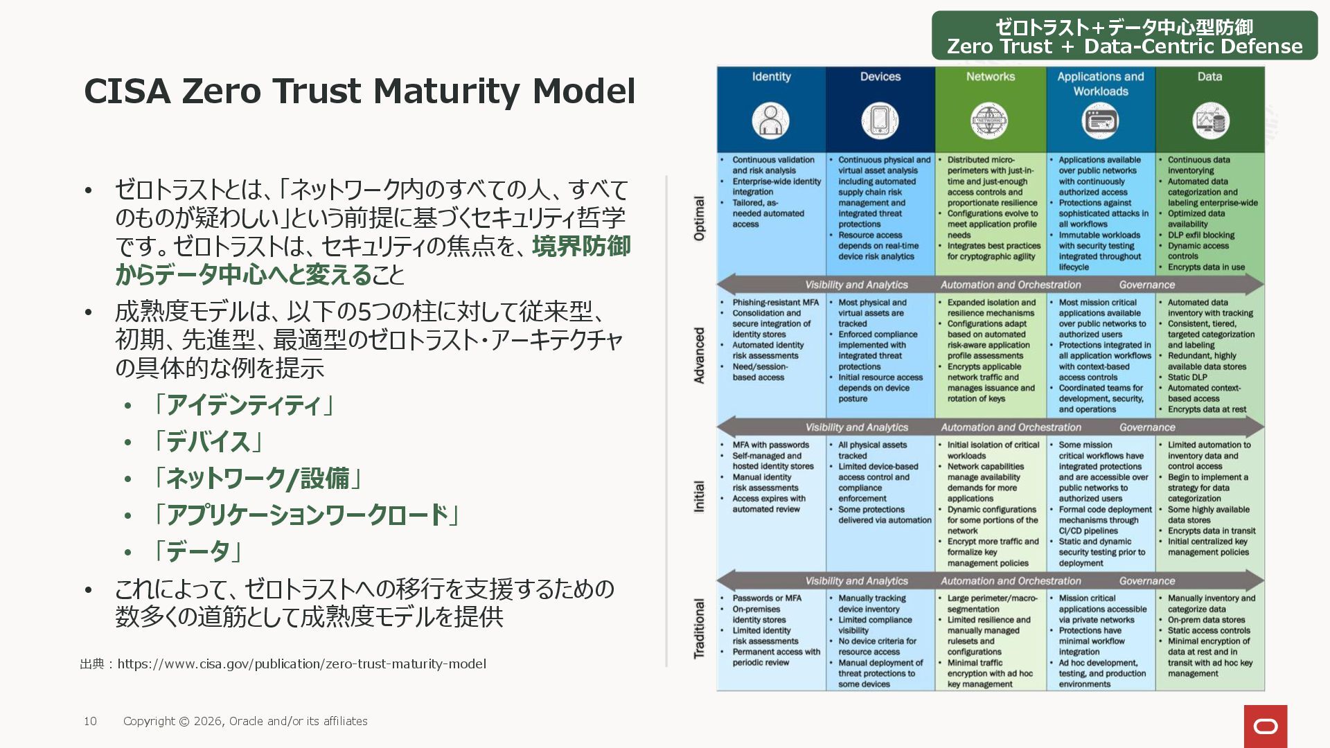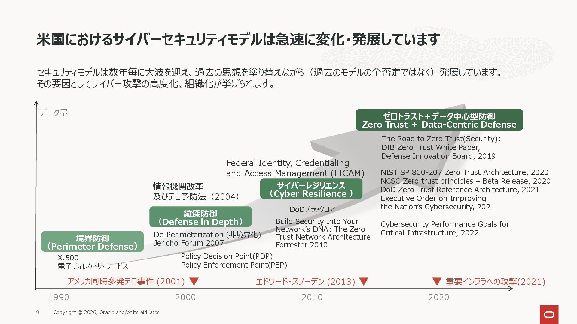 2010 2020 データ量 境界防御 (Perimeter Defense) 縦深防御 (Defense in Depth) サイバーレジリエンス (Cyber Resilience ) ゼロトラスト+データ中心型防御 Zero Trust + Data-Centric Defense Build Security Into Your Network’s DNA: The Zero Trust Network Architecture Forrester 2010 Policy Decision Point(PDP) Policy Enforcement Point(PEP) X.500 電子ディレクトリ・サービス 情報機関改革 及びテロ予防法(2004) Federal Identity, Credentialing and Access Management (FICAM) De-Perimeterization (非境界化) Jericho Forum 2007 NIST SP 800-207 Zero Trust Architecture, 2020 NCSC Zero trust principles – Beta Release, 2020 DoD Zero Trust Reference Architecture, 2021 Executive Order on Improving the Nation’s Cybersecurity, 2021 Cybersecurity Performance Goals for Critical Infrastructure, 2022 DoDブラックコア The Road to Zero Trust(Security): DIB Zero Trust White Paper, Defense Innovation Board, 2019 エドワード・スノーデン (2013) アメリカ同時多発テロ事件 (2001) 重要インフラへの攻撃(2021) セキュリティモデルは数年毎に大波を迎え、過去の思想を塗り替えながら(過去のモデルの全否定ではなく)発展しています。 その要因としてサイバー攻撃の高度化、組織化が挙げられます。 9