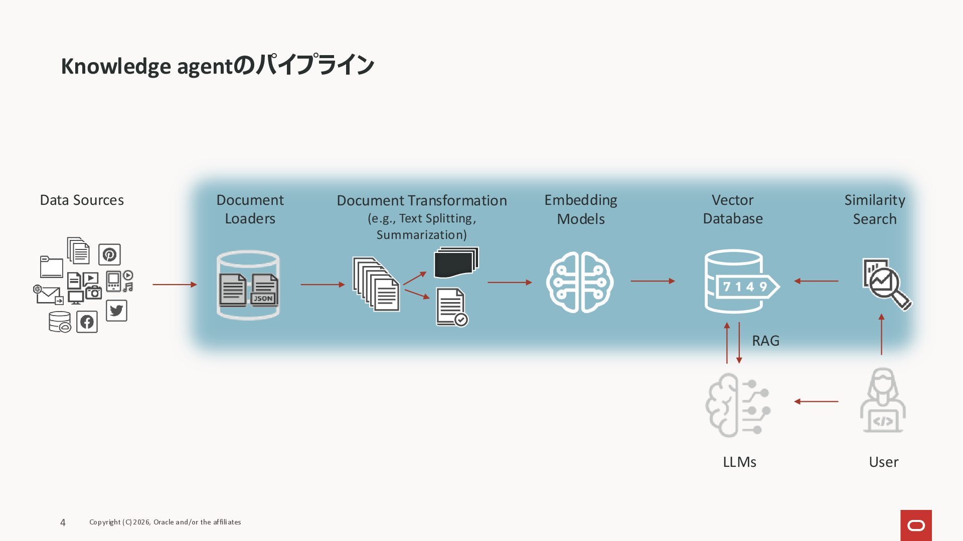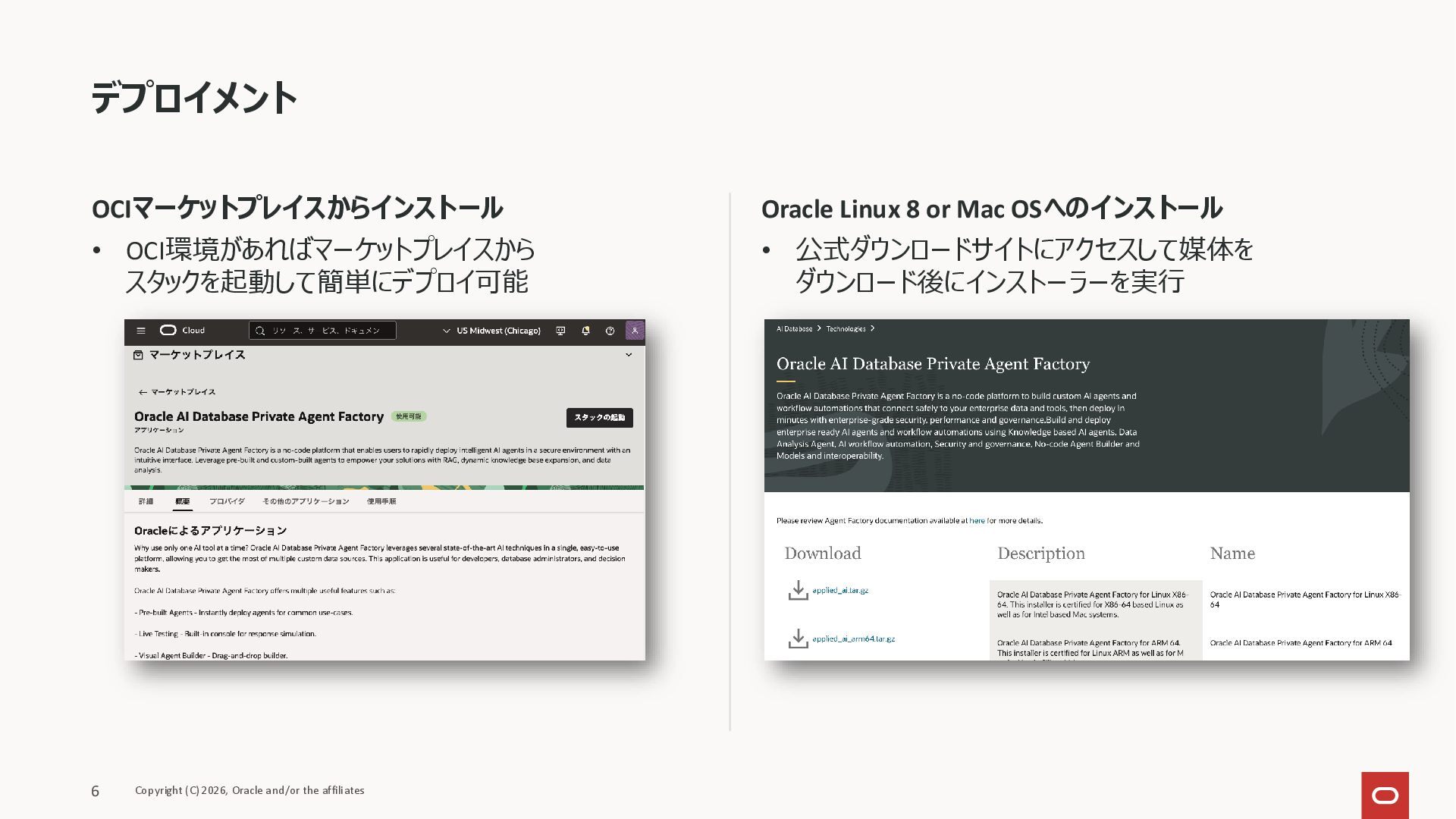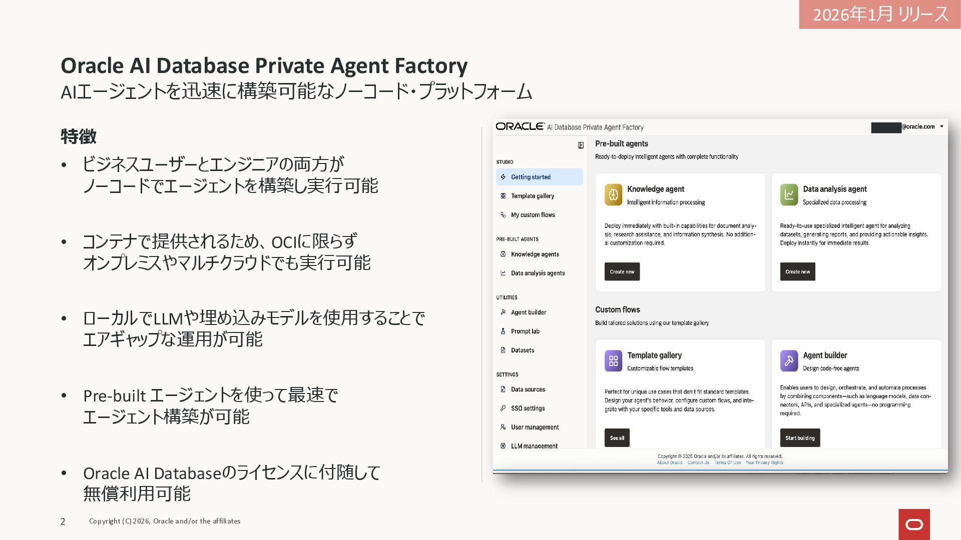 • コンテナで提供されるため、OCIに限らず オンプレミスやマルチクラウドでも実行可能 • ローカルでLLMや埋め込みモデルを使用することで エアギャップな運用が可能 • Pre-built エージェントを使って最速で エージェント構築が可能 • Oracle AI Databaseのライセンスに付随して 無償利用可能 AIエージェントを迅速に構築可能なノーコード・プラットフォーム 2026年1月 リリース Copyright (C) 2026, Oracle and/or the affiliates 2