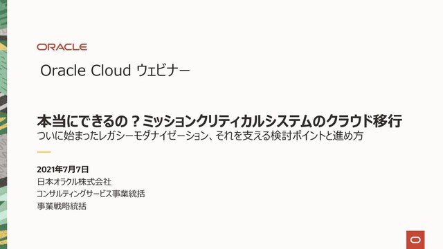 ü より⾼性能なリソースも提 供可能 ¥61.25/時 Compute (VM.Standard2.8; 16vCPU, 120GB, Linux) ¥119.94/時 仮想マシン (16vCPU, 64GB, Linux) Storage ü 他社標準ストレージ価格 で、⾼性能ストレージを 提供 ü IOPS設定+SLA ¥5,100/⽉ Block Volume (1TB, 25K IOPS) ¥239,040/⽉ ブロック・ストレージ (1TB, 25K IOPS) Network ü AD間無償 ü 10TB/⽉まで無償 ü 閉域網接続時はデータ 転送無償 ¥18,972/⽉ FastConnect (1Gbps, 100TB) *閉域網接続 ¥517,445/⽉ 接続サービス (1Gbps, 100TB) *閉域網接続 ¥ 49% 低価格 ¥ 97% 低価格 ¥ 96% 低価格 Compute: 同⼀リソースを低価格で提供(メモリは約2倍) Storage/Network: トランザクションやデータ転送量による料⾦変動を低減する料⾦体系 * as of July 2021, Tokyo Region コスト 8 Copyright © 2021, Oracle and/or its affiliates 24