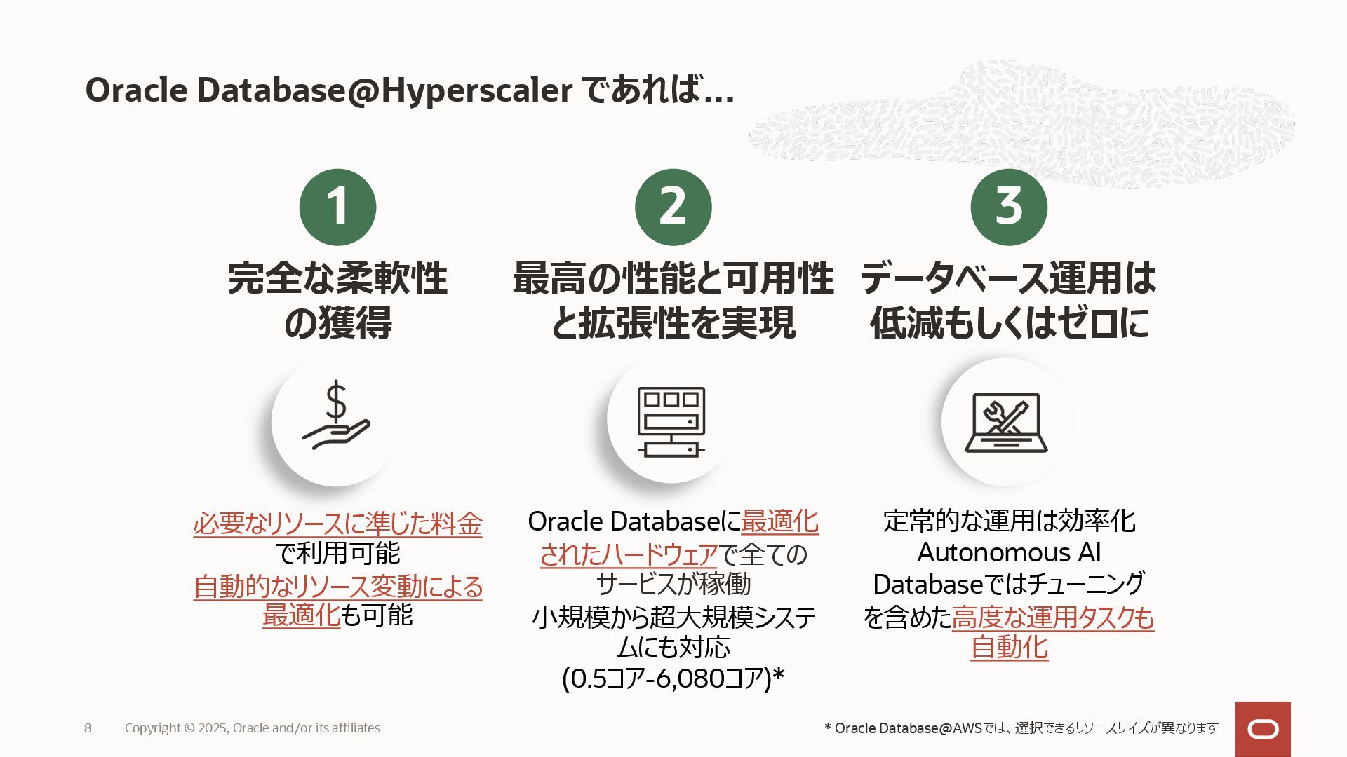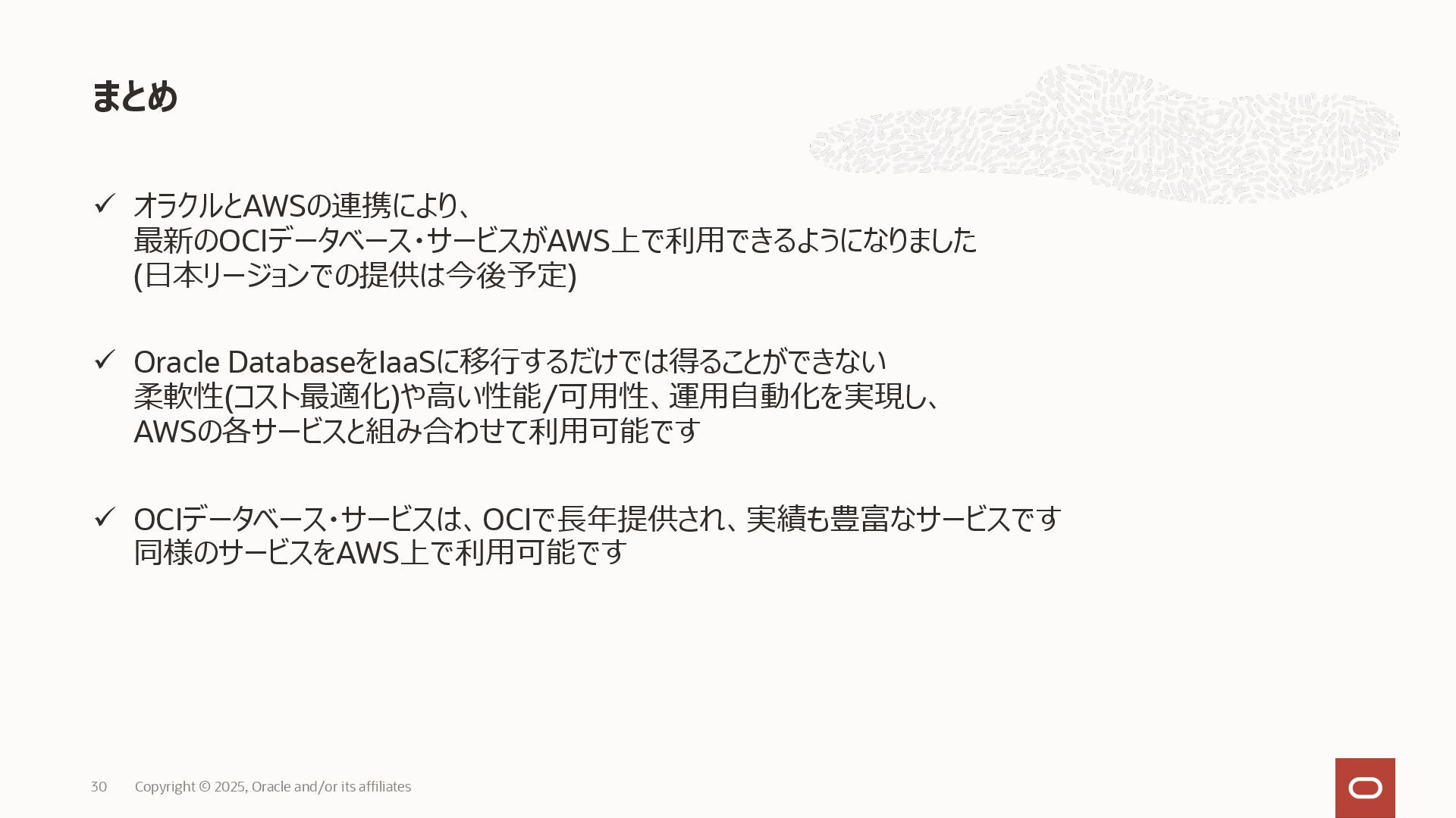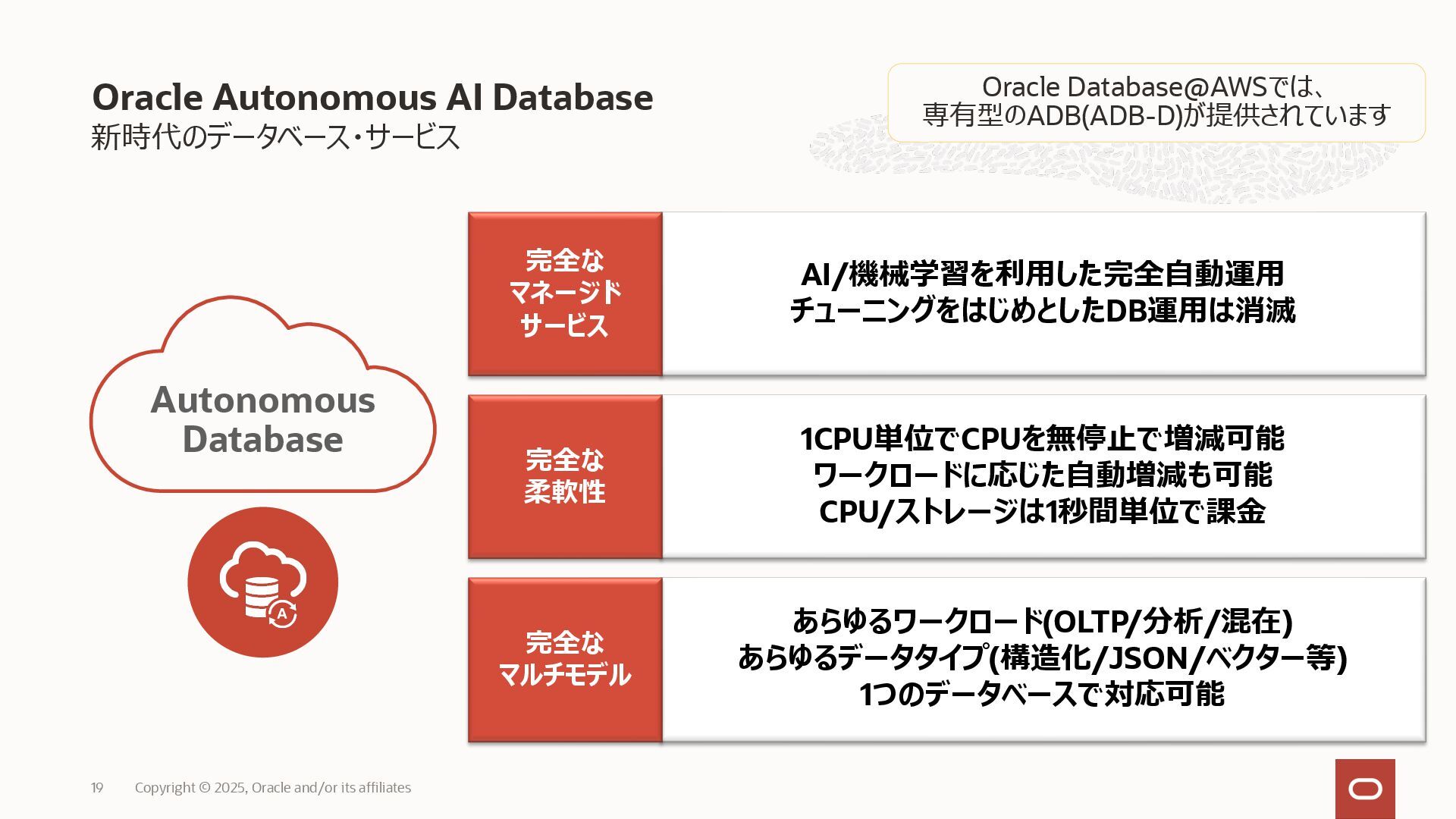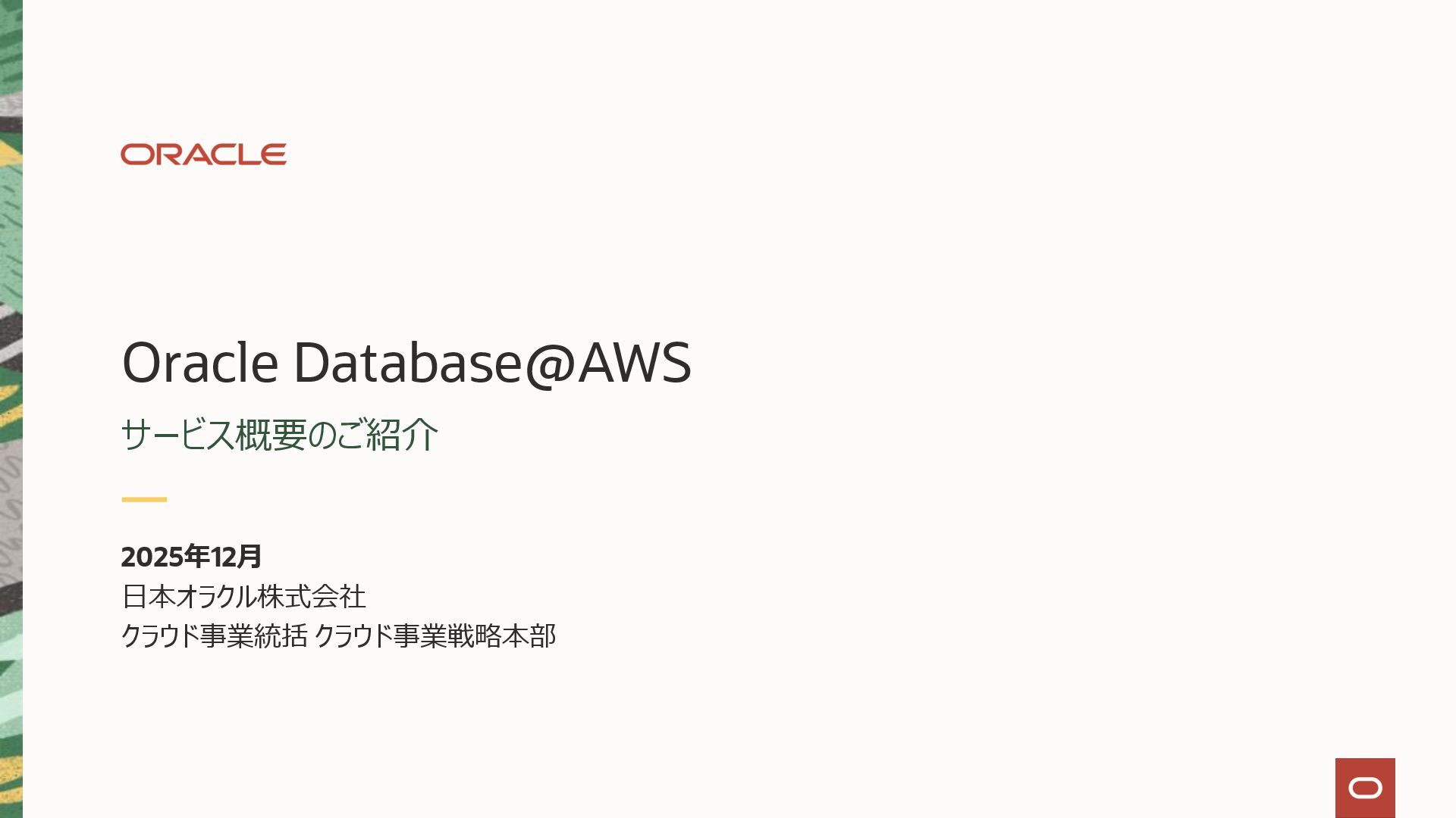 https://www.oracle.com/jp/cloud/aws/ Amazon Web Services(AWS)のOracle Cloud Infrastructure(OCI)上で稼働するOracle AI Databaseサービスにより、クラウドの移行とイノベーションを加速します。Oracle AI DatabaseのAI Vector SearchやAmazon Bedrockなどの機能を使用して、アプリケーションを迅速に構築し、最新化できます。