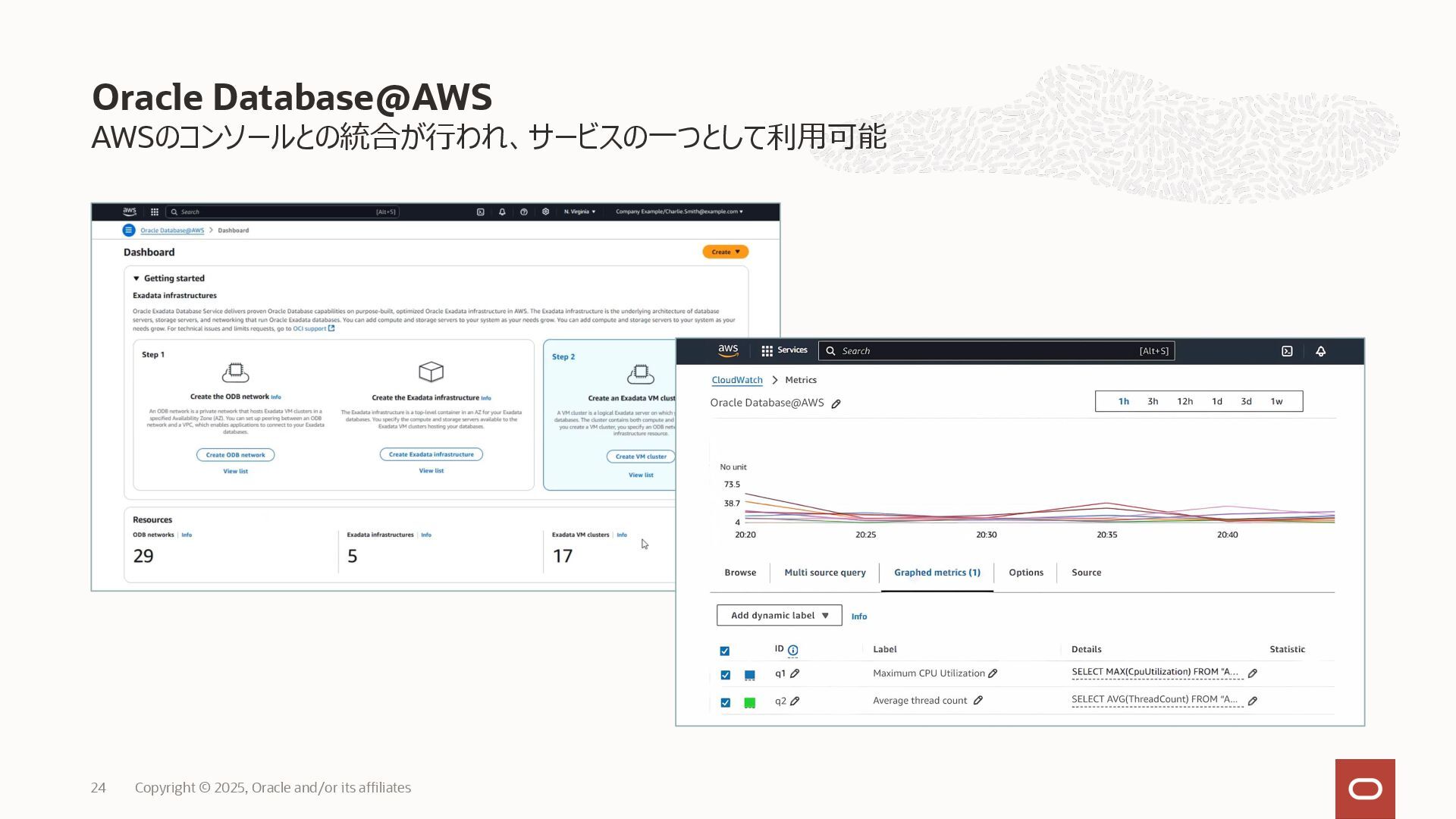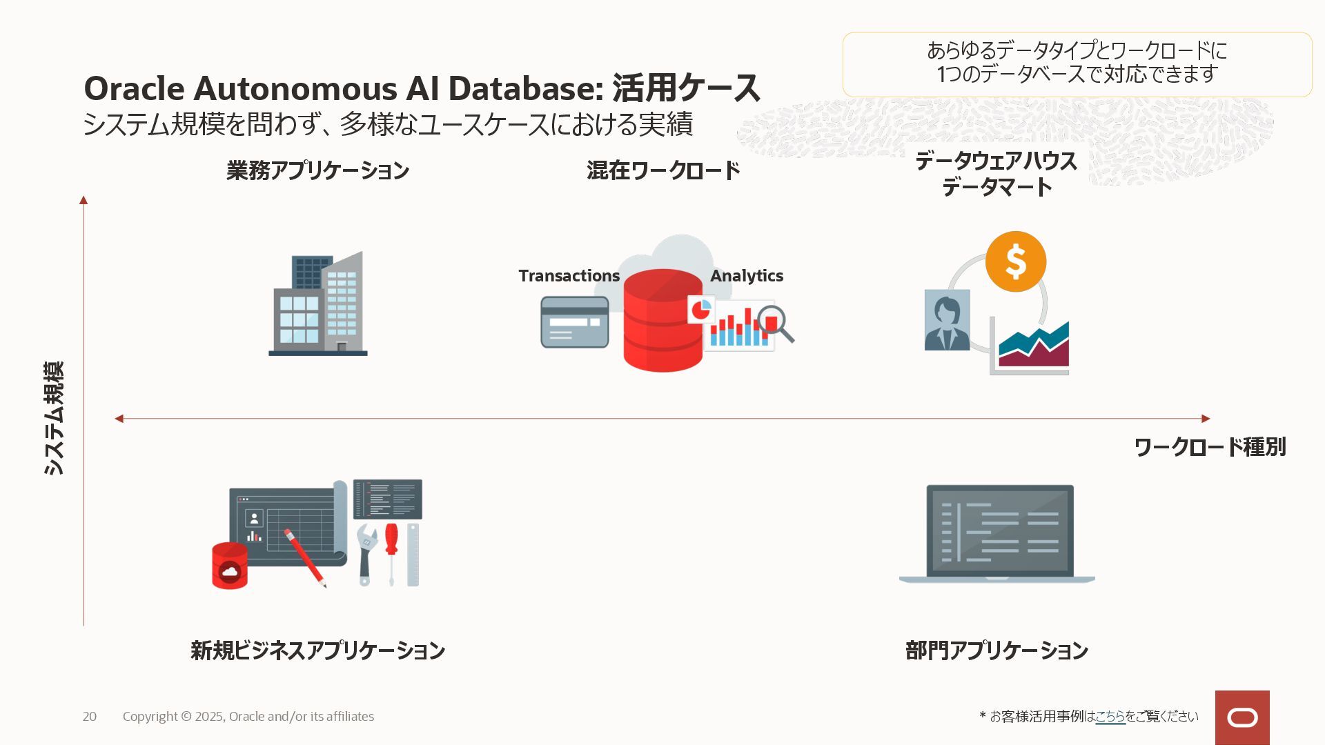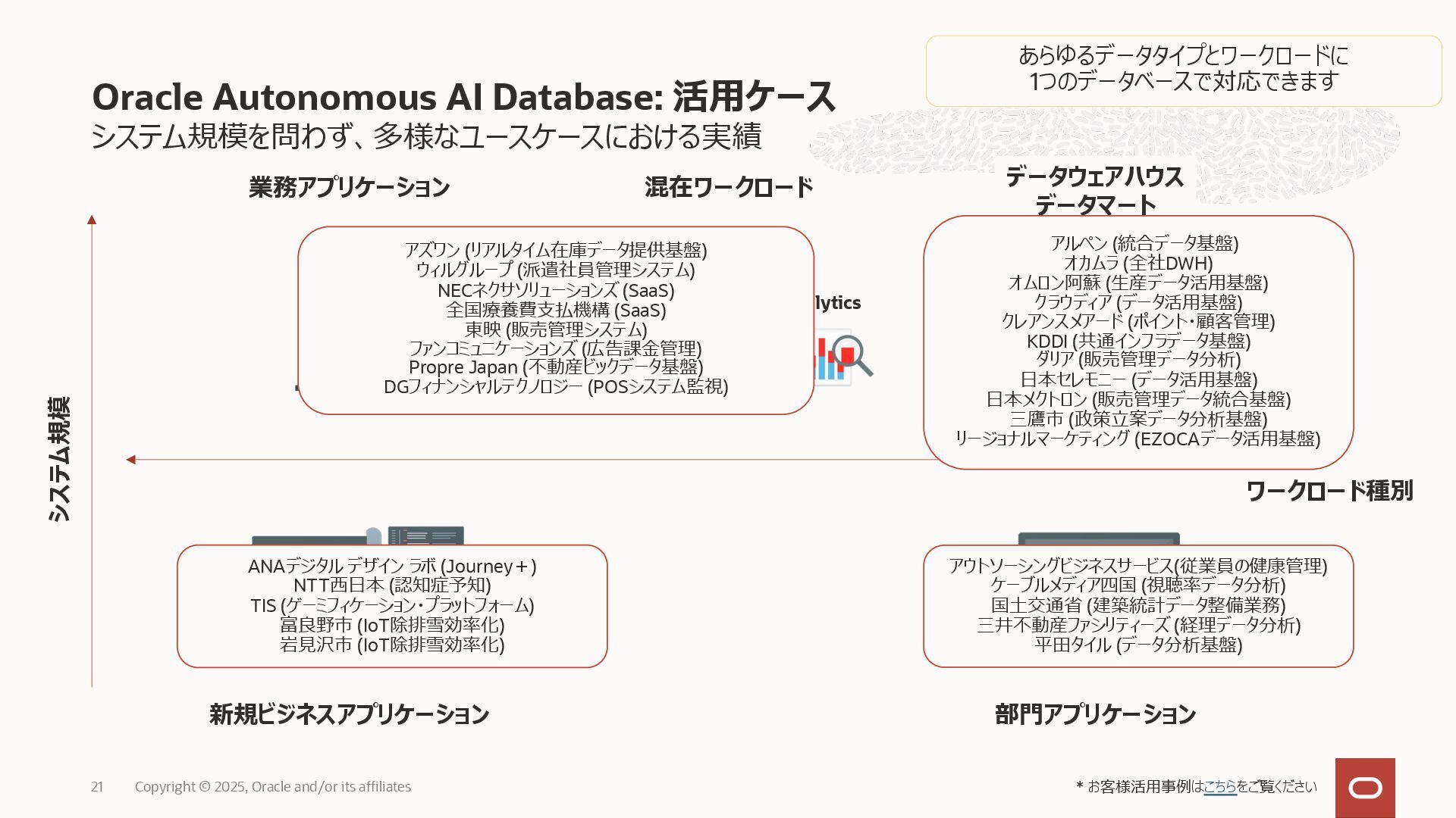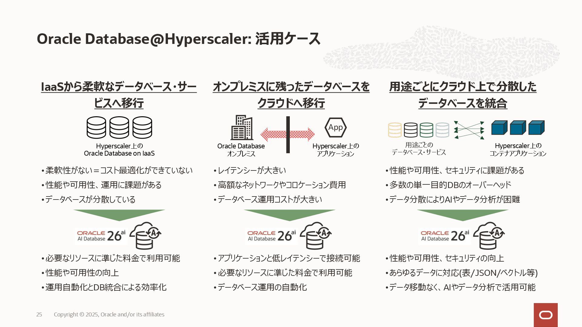 https://www.oracle.com/jp/cloud/aws/ Amazon Web Services(AWS)のOracle Cloud Infrastructure(OCI)上で稼働するOracle AI Databaseサービスにより、クラウドの移行とイノベーションを加速します。Oracle AI DatabaseのAI Vector SearchやAmazon Bedrockなどの機能を使用して、アプリケーションを迅速に構築し、最新化できます。