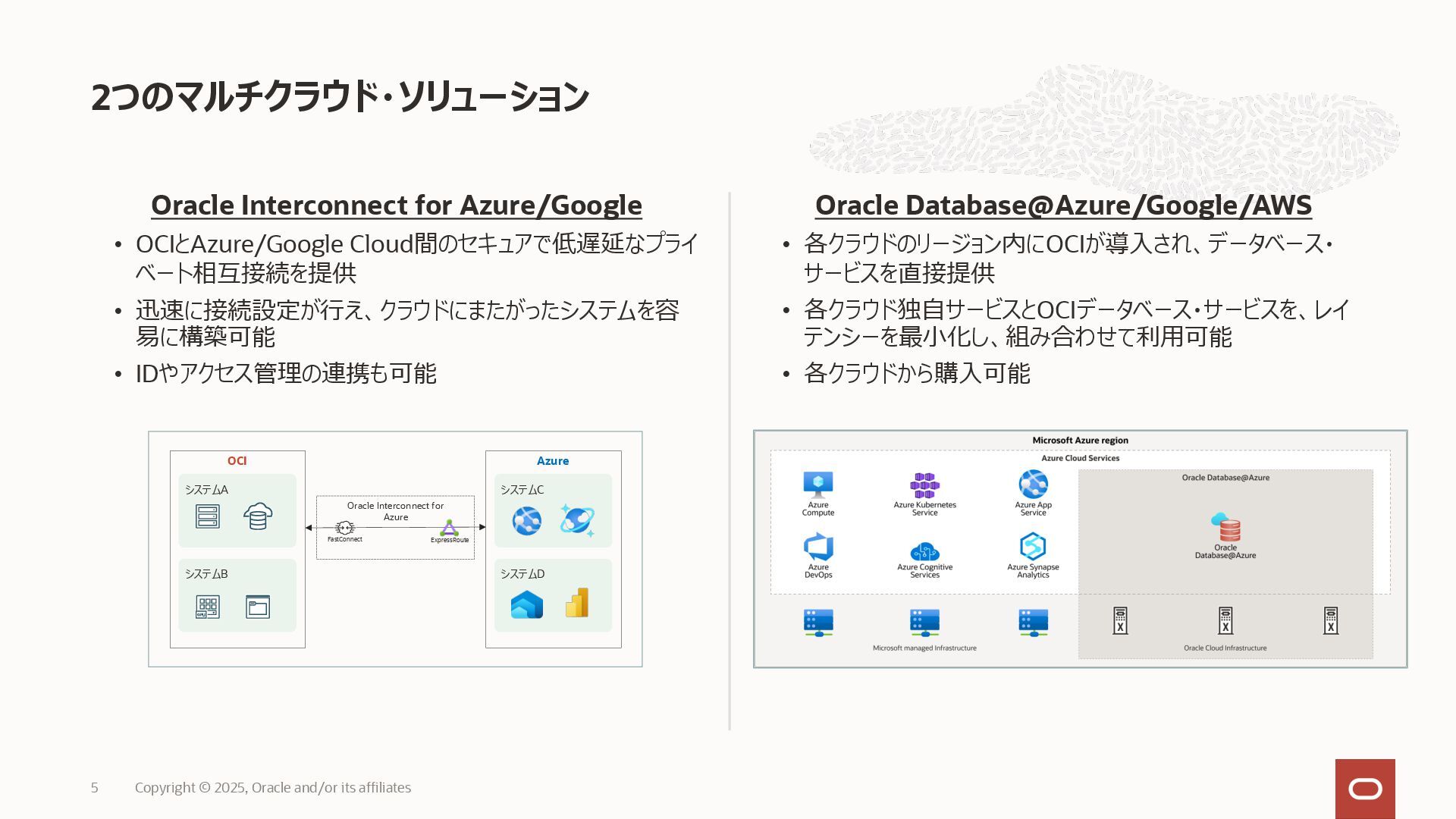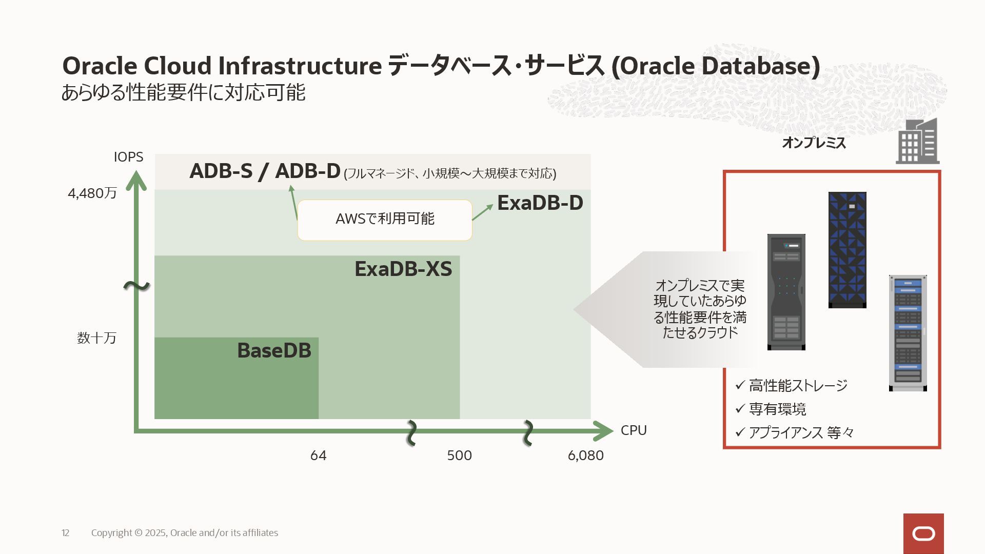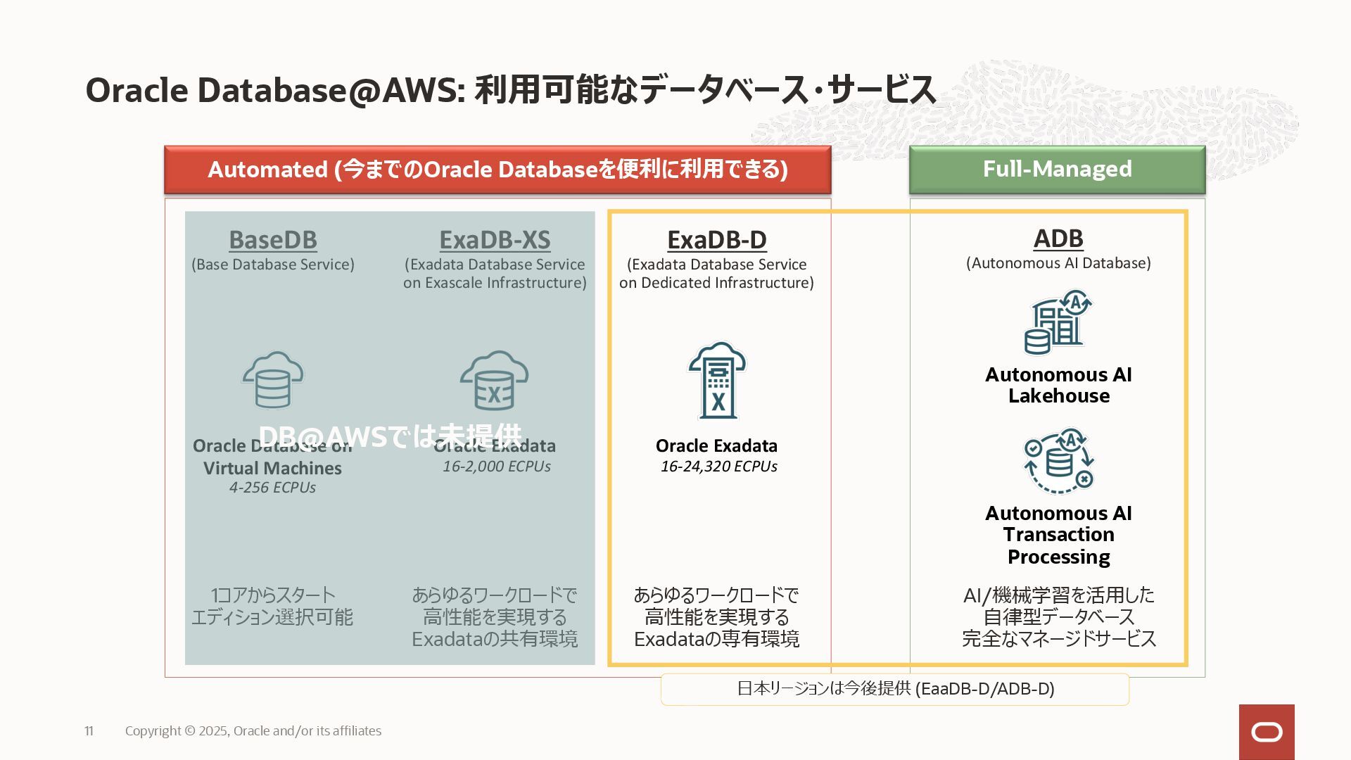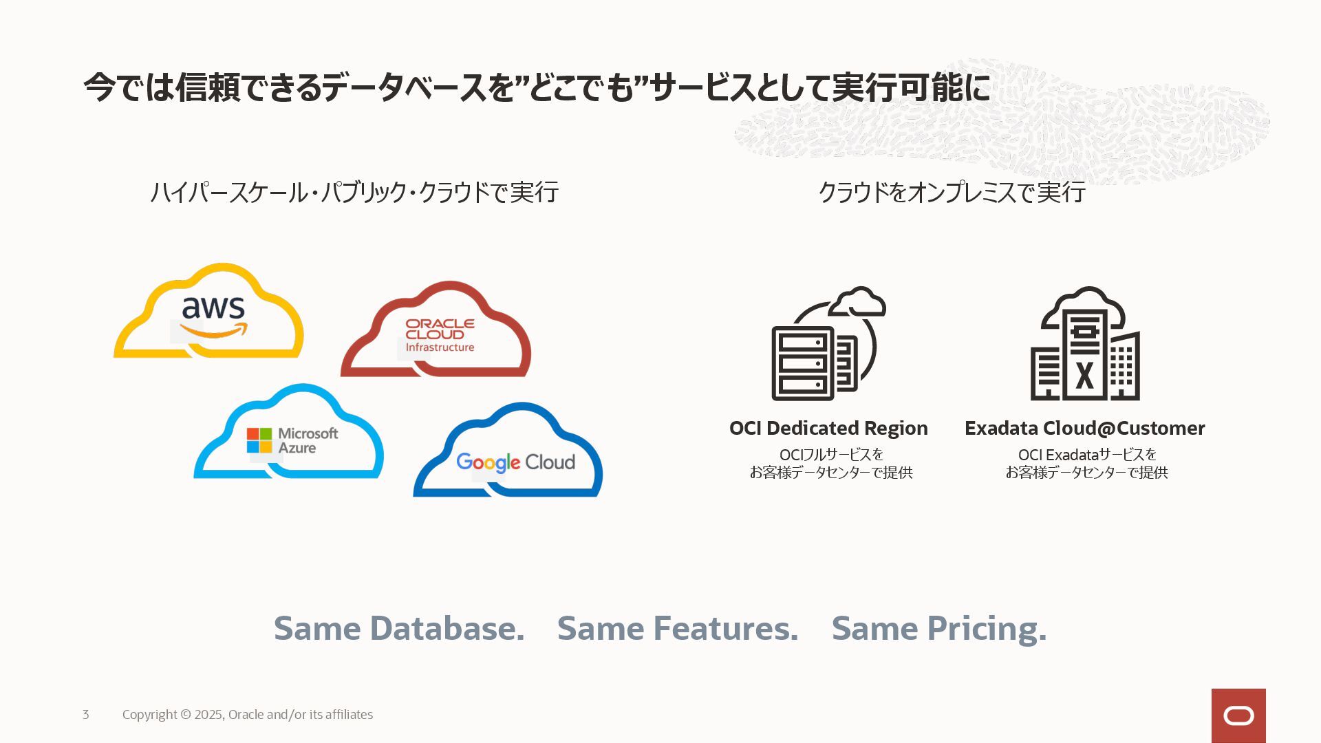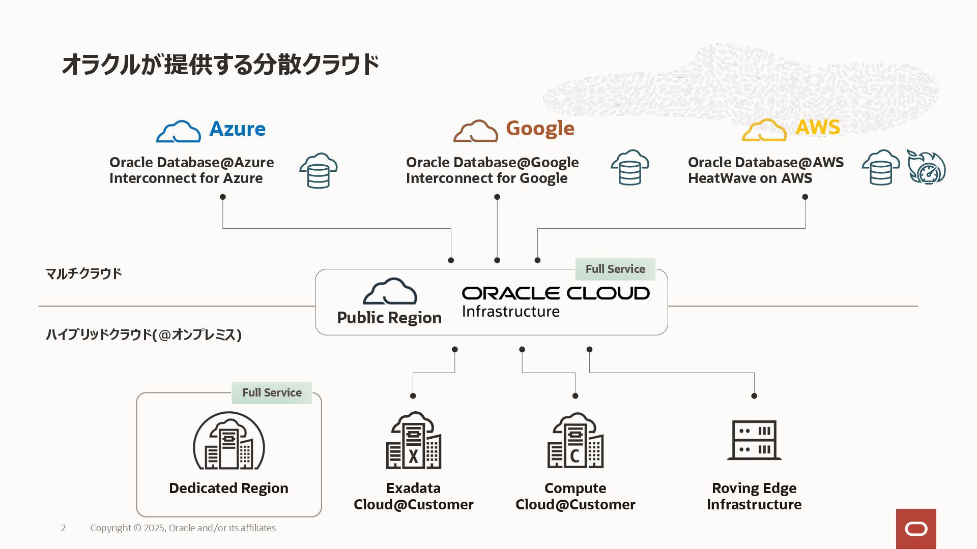 Edge Infrastructure Dedicated Region Exadata Cloud@Customer Compute Cloud@Customer ハイブリッドクラウド(@オンプレミス) AWS Azure Google Oracle Database@Azure Interconnect for Azure Oracle Database@Google Interconnect for Google Oracle Database@AWS HeatWave on AWS マルチクラウド Public Region Full Service Full Service