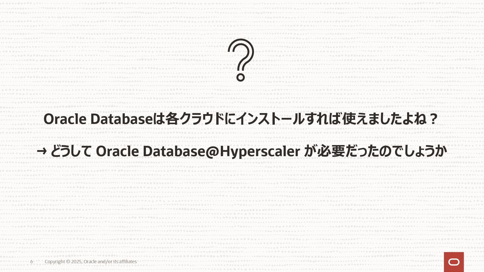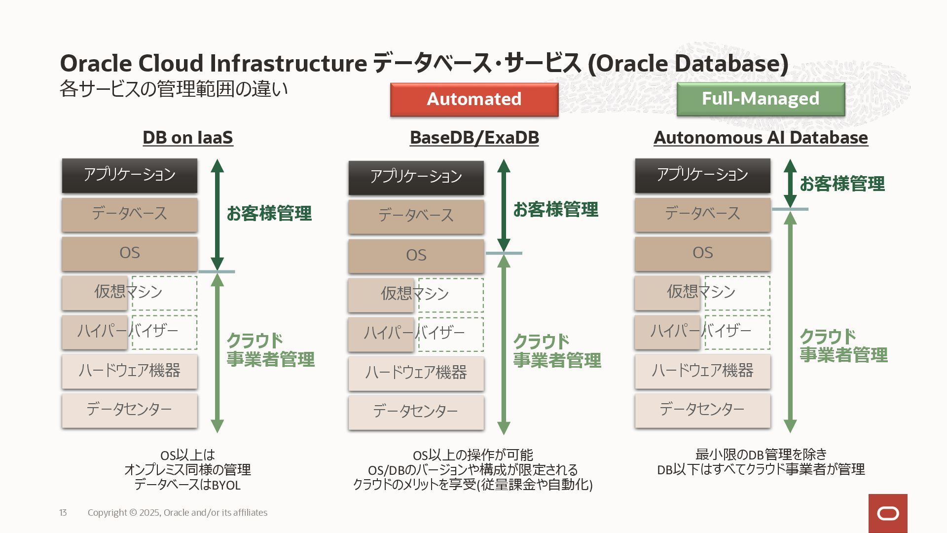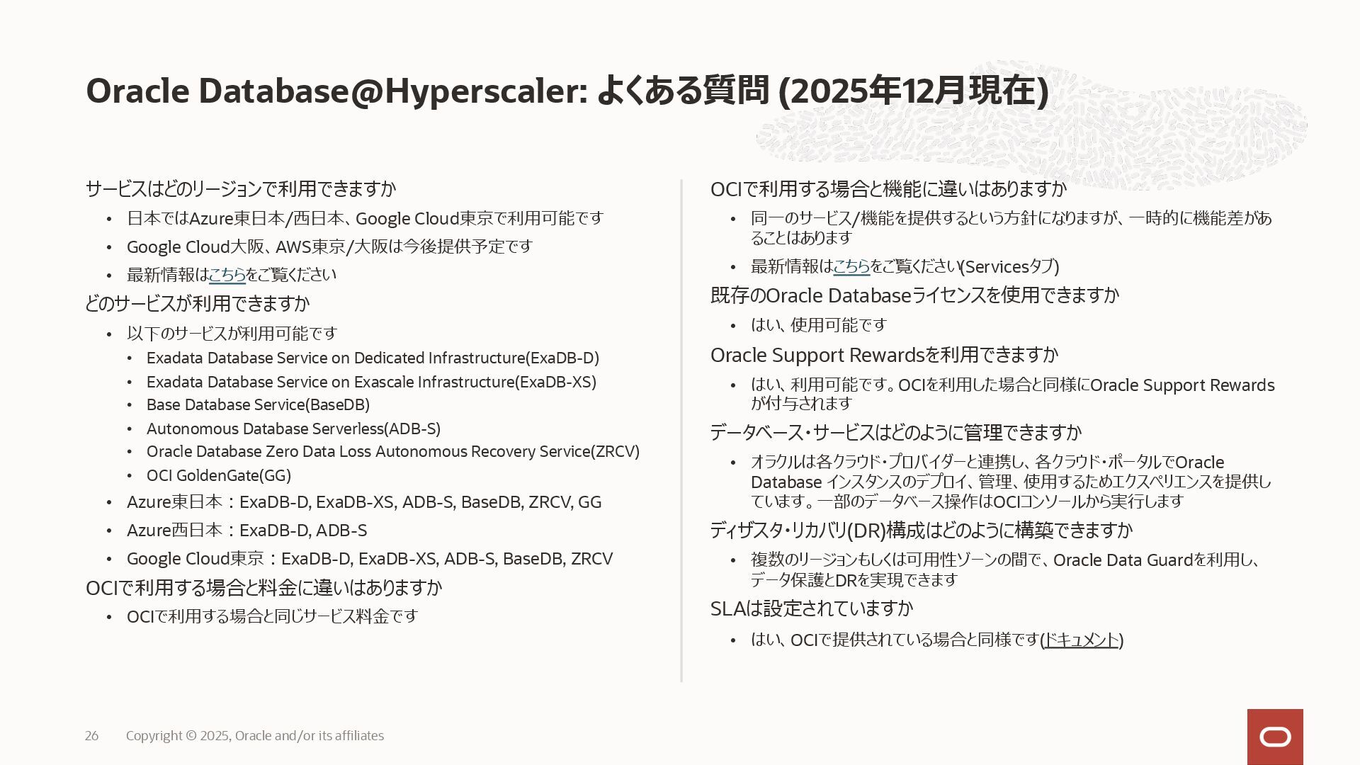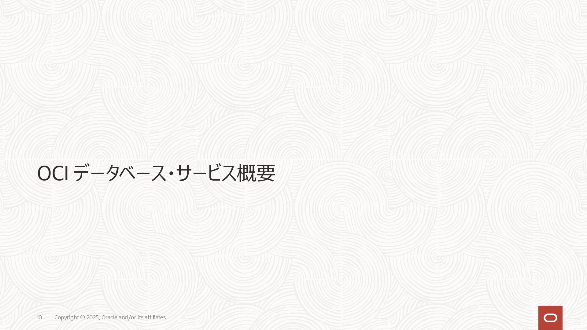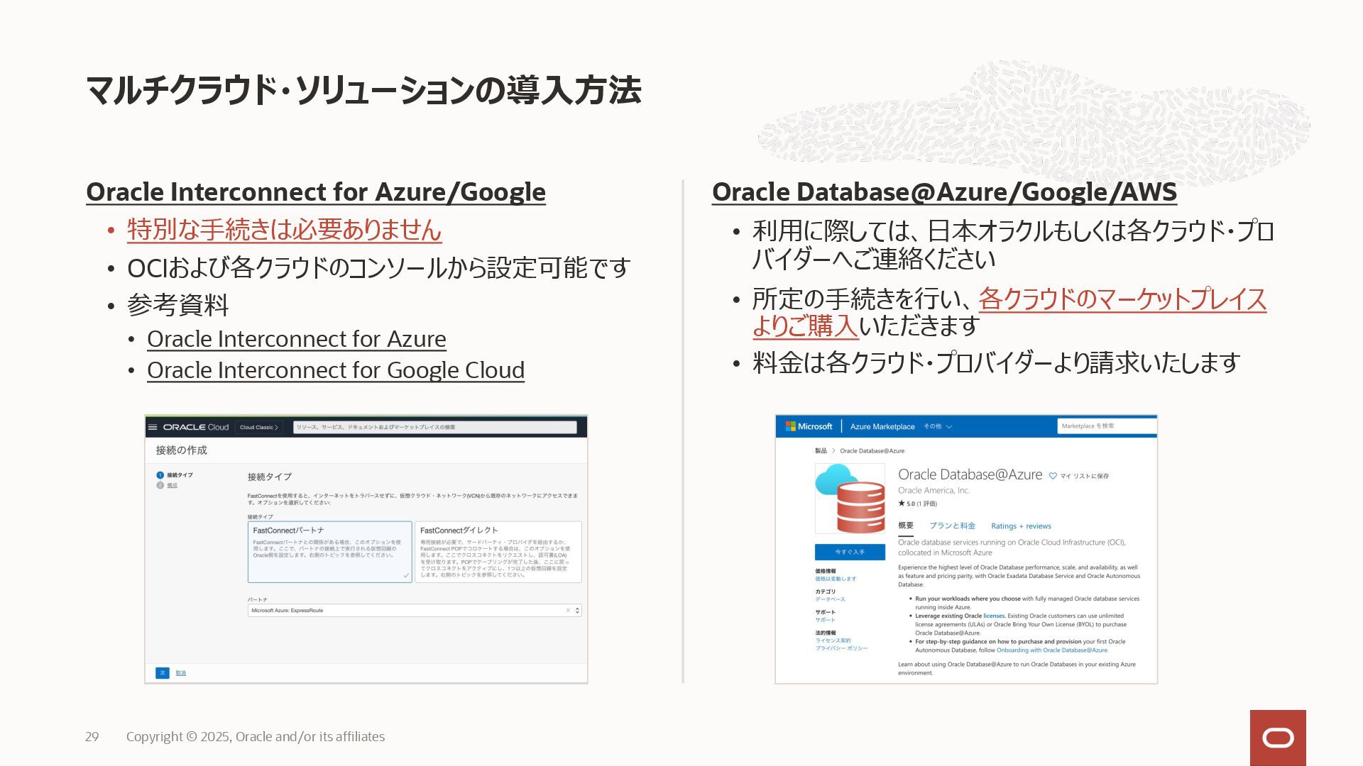Edge Infrastructure Dedicated Region Exadata Cloud@Customer Compute Cloud@Customer ハイブリッドクラウド(@オンプレミス) AWS Azure Google Oracle Database@Azure Interconnect for Azure Oracle Database@Google Interconnect for Google Oracle Database@AWS HeatWave on AWS マルチクラウド Public Region Full Service Full Service