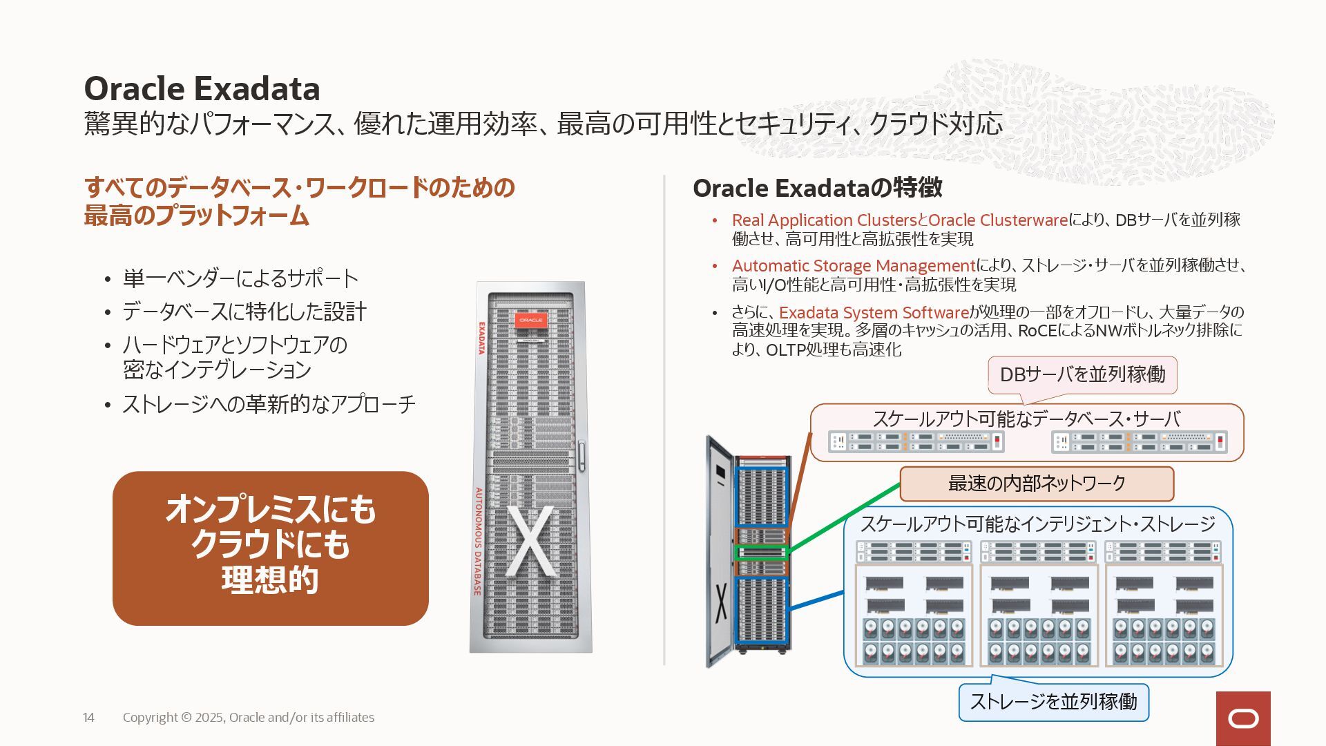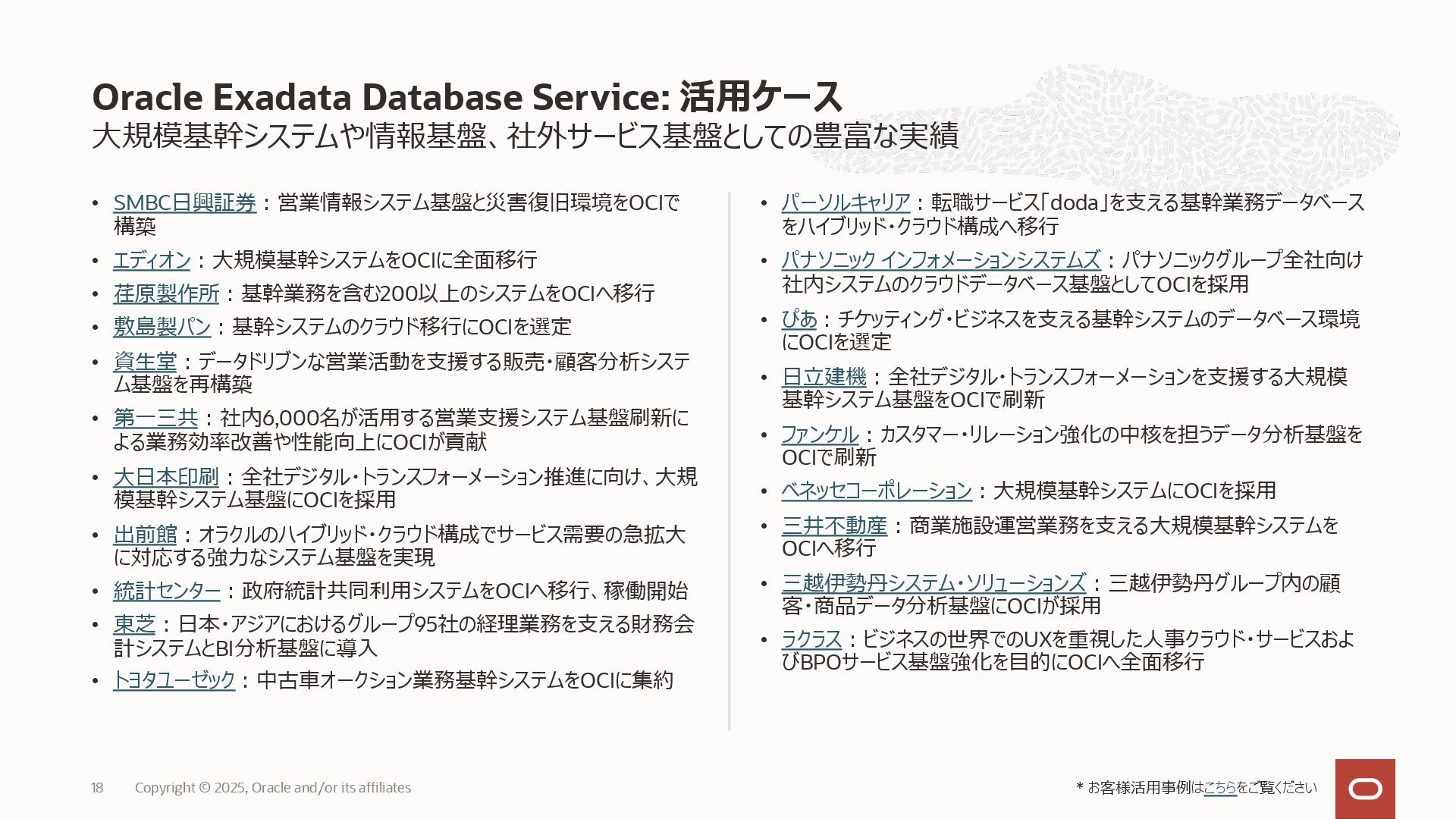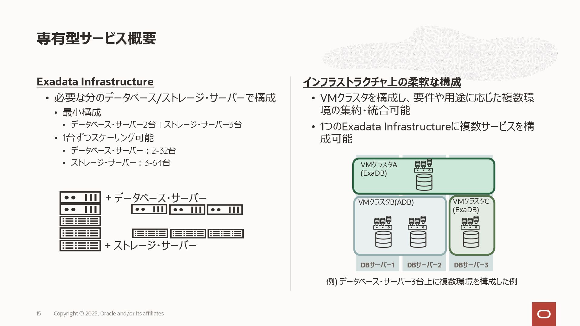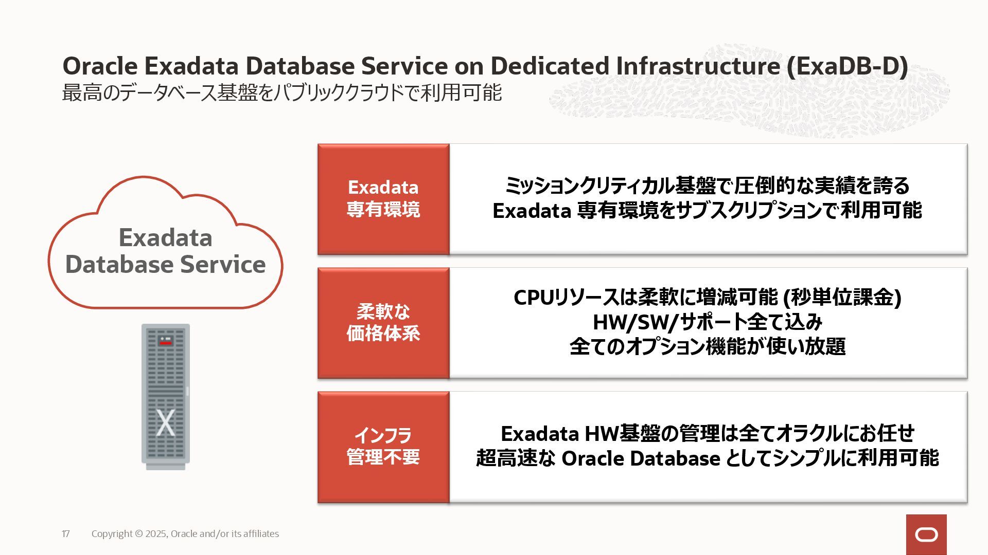 クラウドをオンプレミスで実⾏ Same Database. Same Features. Same Pricing. Exadata Cloud@Customer OCI Dedicated Region OCIフルサービスを お客様データセンターで提供 OCI Exadataサービスを お客様データセンターで提供