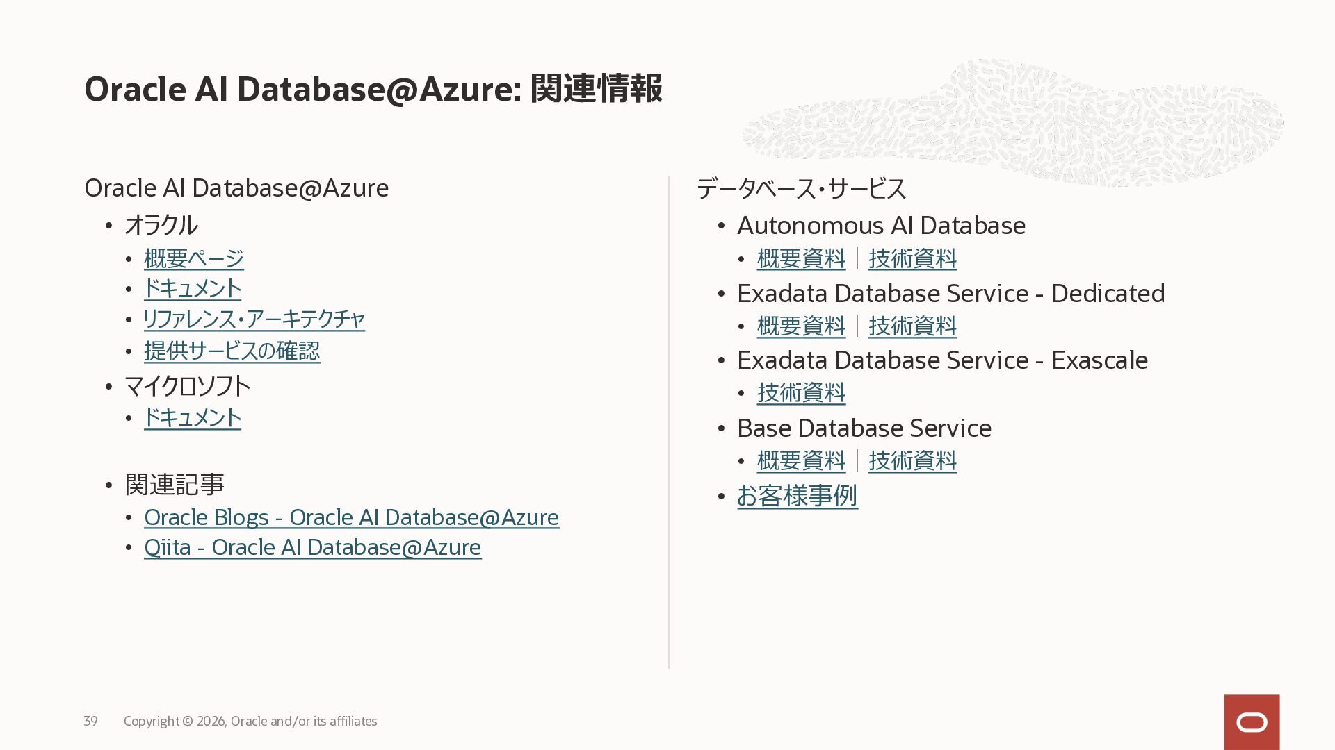 • Exadata Database Service on Dedicated Infrastructure(ExaDB-D) • Exadata Database Service on Exascale Infrastructure(ExaDB-XS) • Base Database Service(BaseDB) • Autonomous AI Database Serverless(ADB-S) • Autonomous AI Database on Dedicated Infrastructure(ADB-D) • Oracle Database Zero Data Loss Autonomous Recovery Service(ZRCV) • OCI GoldenGate(GG) • Azure東⽇本︓ExaDB-D, ExaDB-XS, ADB-D, ADB-S, BaseDB, ZRCV, GG • Azure⻄⽇本︓ExaDB-D, ExaDB-XS, ADB-D, ADB-S, BaseDB, ZRCV, GG • Google Cloud東京︓ExaDB-D, ExaDB-XS, ADB-S, BaseDB, ZRCV • Google Cloud⼤阪︓ExaDB-D, ADB-S • AWS東京︓ExaDB-D, ADB-D, ZRCV OCIで利⽤する場合と料⾦に違いはありますか • OCIで利⽤する場合と同じサービス料⾦です OCIで利⽤する場合と機能に違いはありますか • 同⼀のサービス/機能を提供するという⽅針になりますが、⼀時的に機能差があ ることはあります。詳細はこちらをご覧ください(Servicesタブ) 既存のOracle Databaseライセンスを使⽤できますか • はい、使⽤可能です Oracle Support Rewardsを利⽤できますか • はい、利⽤可能です データベース・サービスはどのように管理できますか • オラクルは各クラウド・プロバイダーと連携し、各クラウド・ポータルでOracle Database インスタンスのデプロイ、管理、使⽤するためエクスペリエンスを提供し ています。⼀部のデータベース操作はOCIコンソールから実⾏します ディザスタ・リカバリ(DR)構成はどのように構築できますか • 複数のリージョンもしくは可⽤性ゾーンの間で、Oracle Data Guardを利⽤し、 データ保護とDRを実現できます SLAは設定されていますか • はい、OCIで提供されている場合と同様です(ドキュメント) Oracle AI Database@Hyperscaler: よくある質問 (2026年4⽉現在) Copyright © 2026, Oracle and/or its affiliates 29