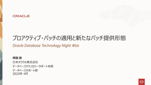 プロアクティブ・パッチの適用と新たなパッチ提供形態 Oracle Database Technology Night #66 栁田 悠 日本オラクル株式会社 データベーステクノロジーサポート本部