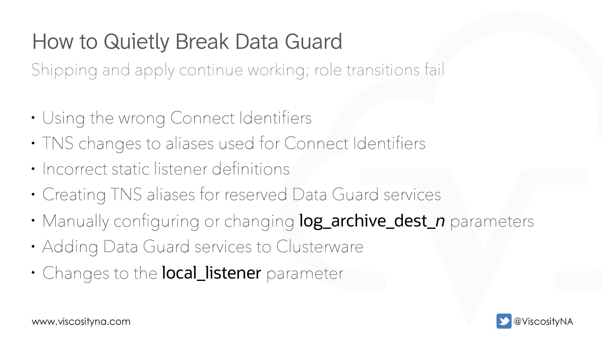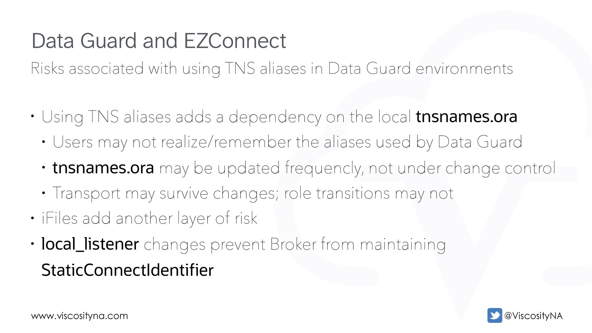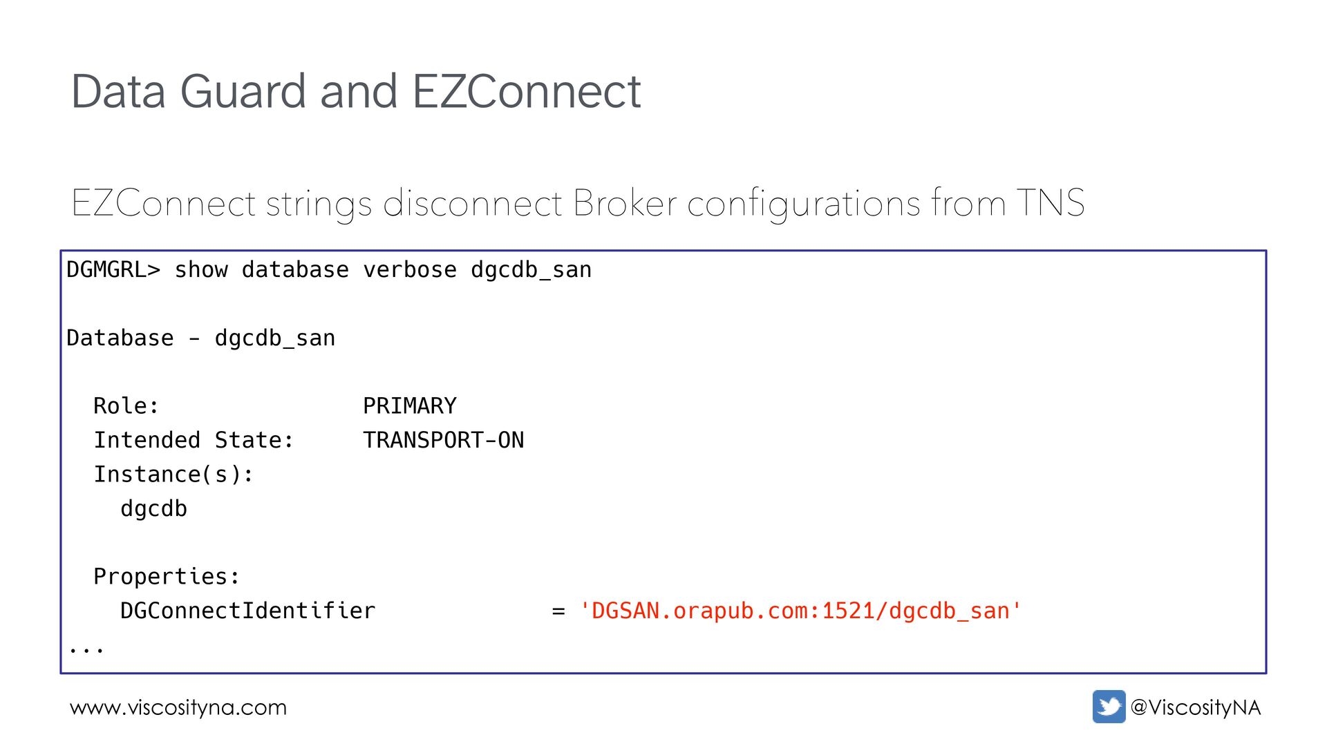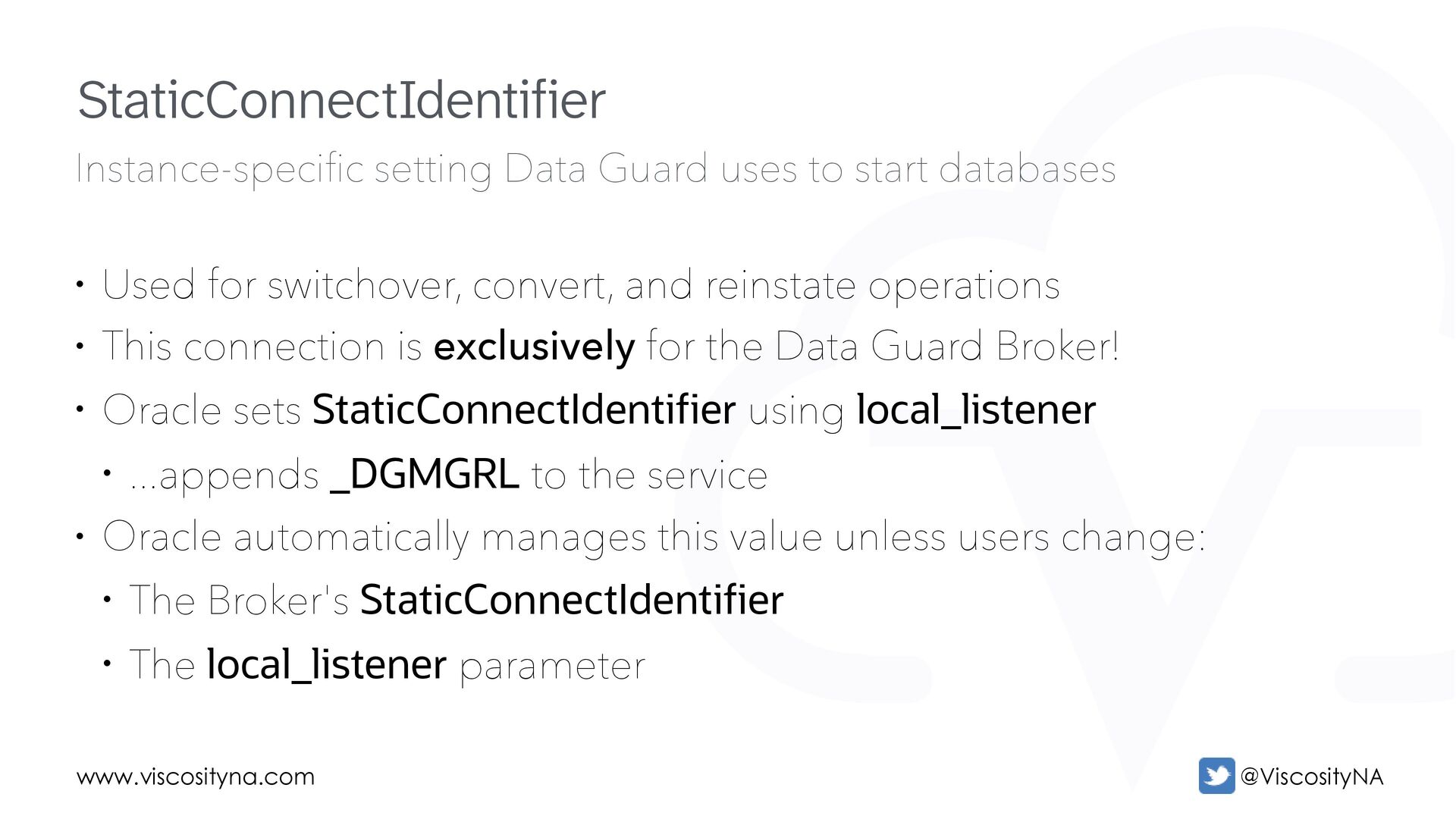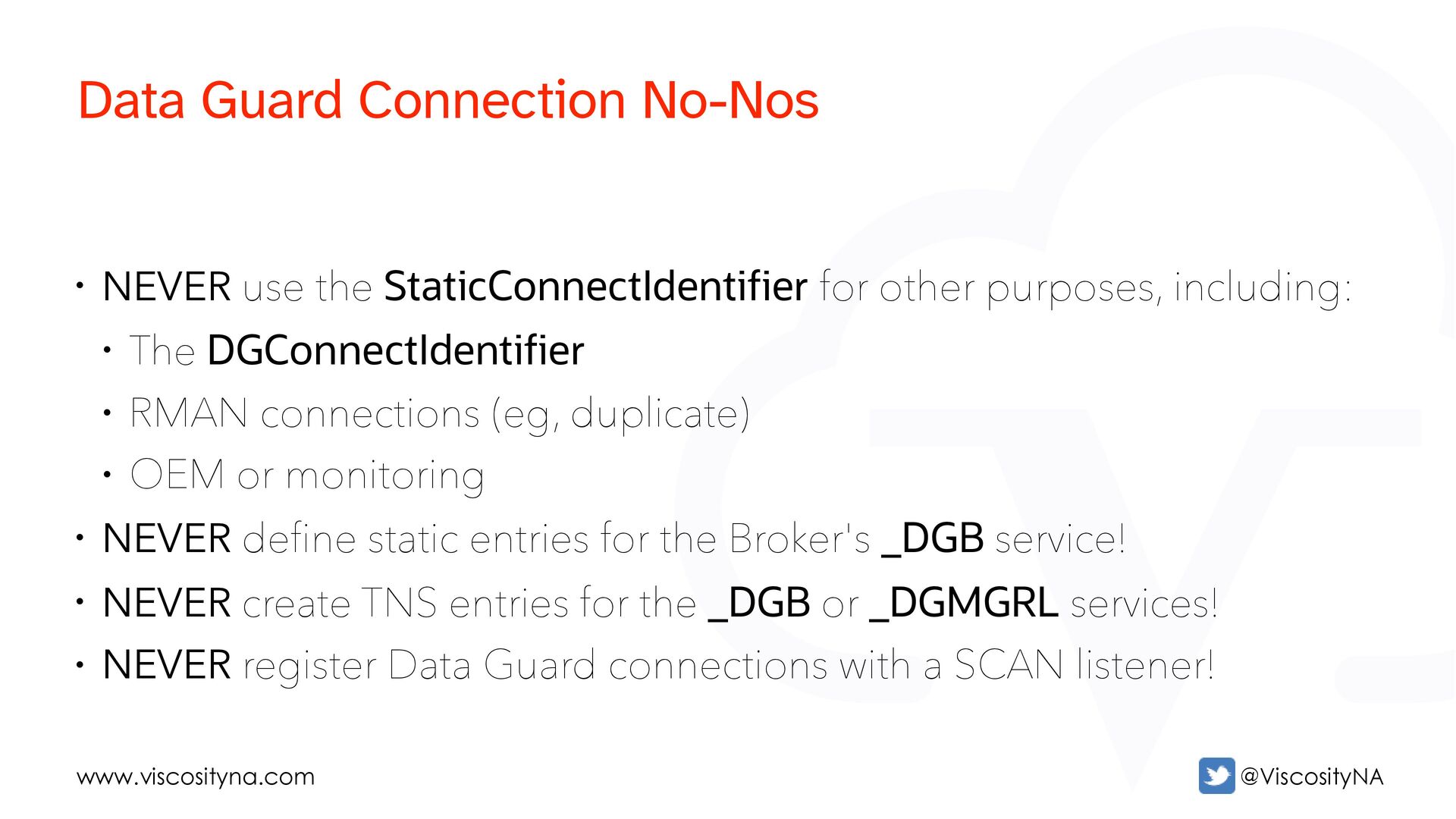 start databases • Used for switchover, convert, and reinstate operations • This connection is exclusively for the Data Guard Broker! • Oracle sets StaticConnectIdentifier using local_listener • ...appends _DGMGRL to the service • Oracle automatically manages this value unless users change: • The Broker's StaticConnectIdentifier • The local_listener parameter StaticConnectIdentifier