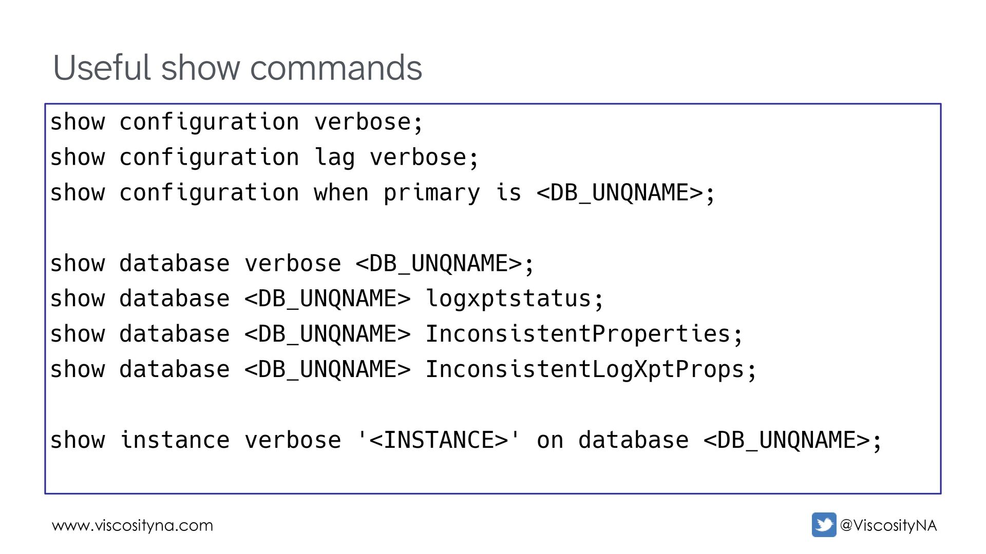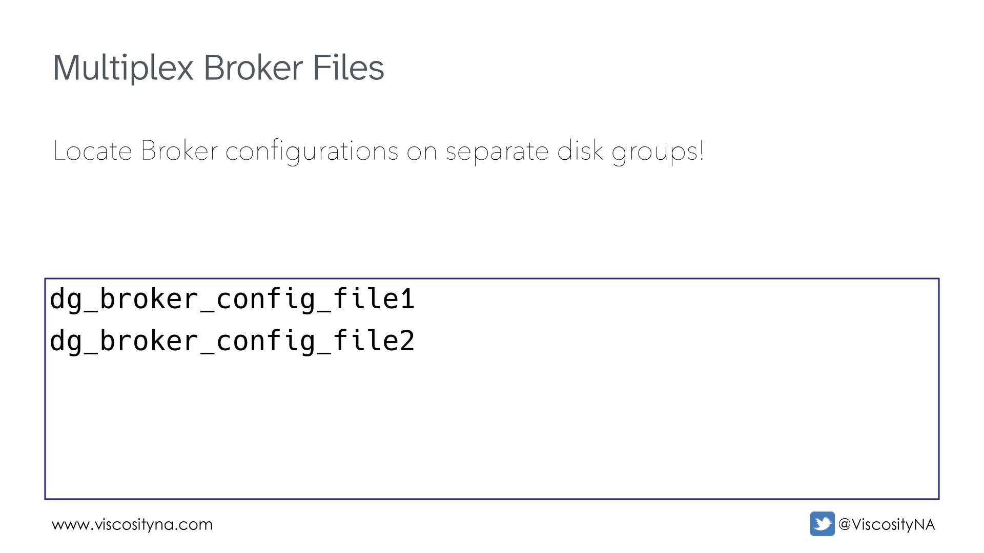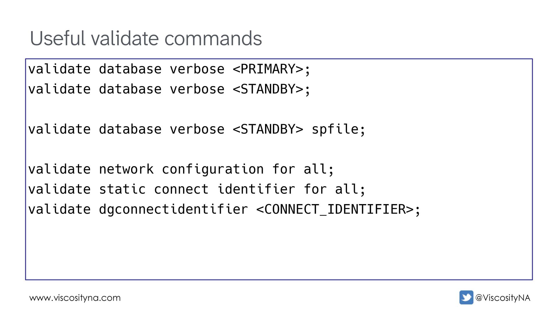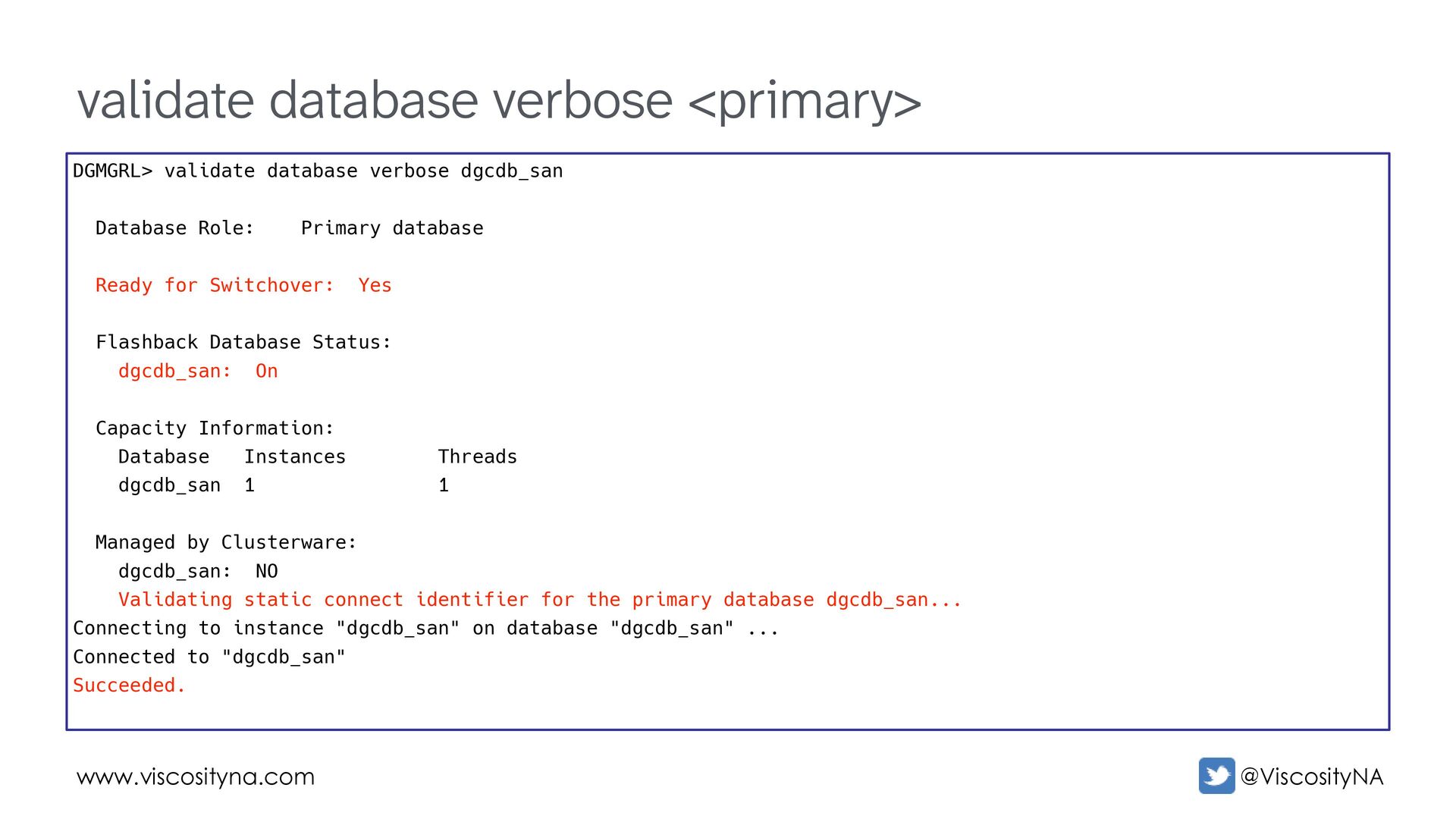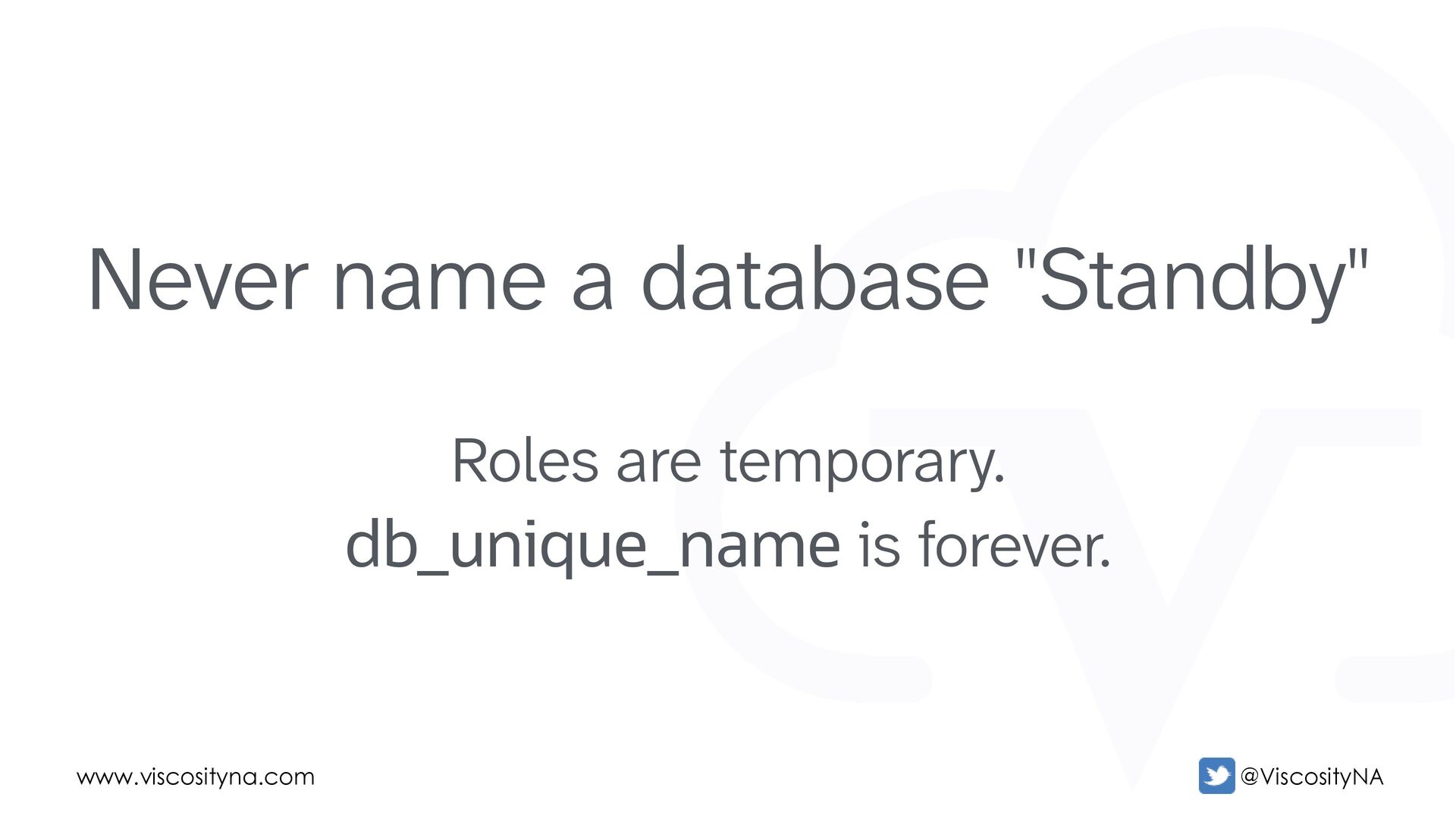 start databases • Used for switchover, convert, and reinstate operations • This connection is exclusively for the Data Guard Broker! • Oracle sets StaticConnectIdentifier using local_listener • ...appends _DGMGRL to the service • Oracle automatically manages this value unless users change: • The Broker's StaticConnectIdentifier • The local_listener parameter StaticConnectIdentifier