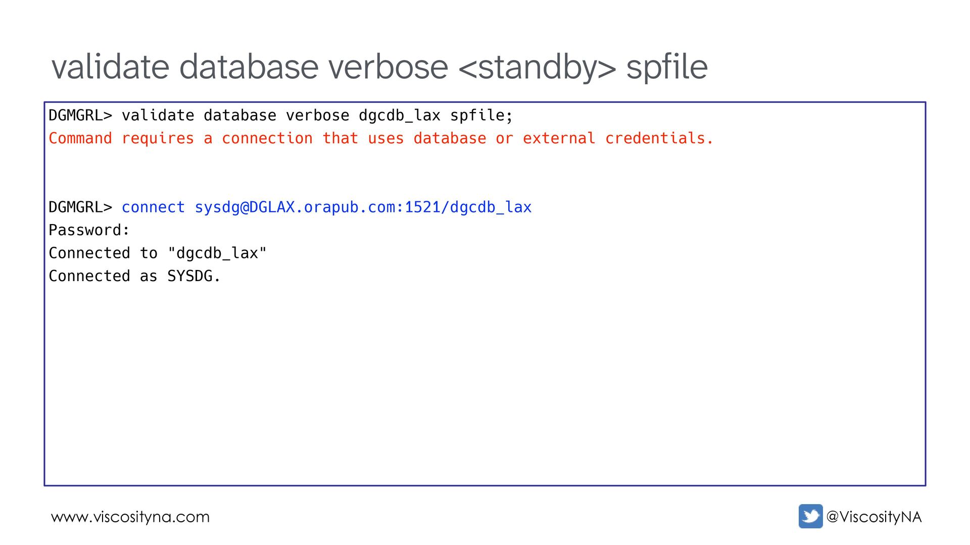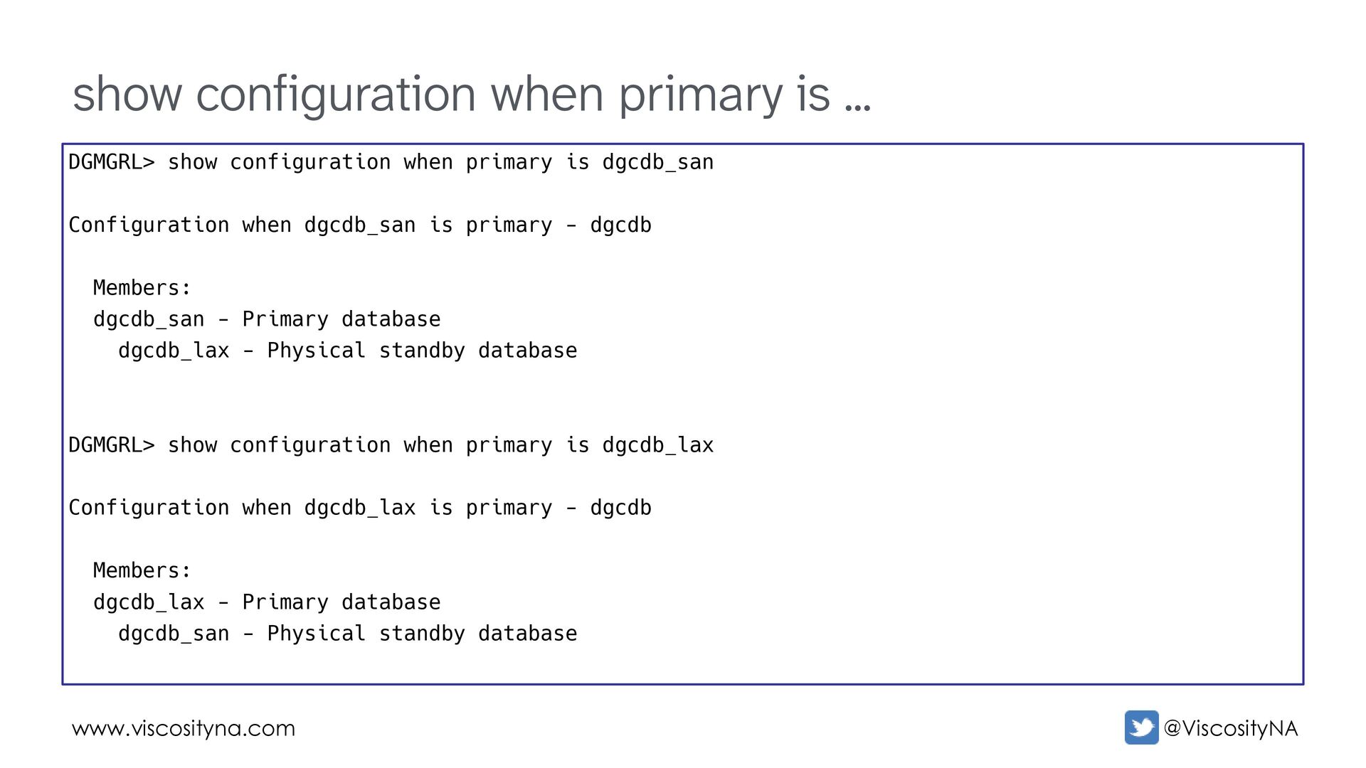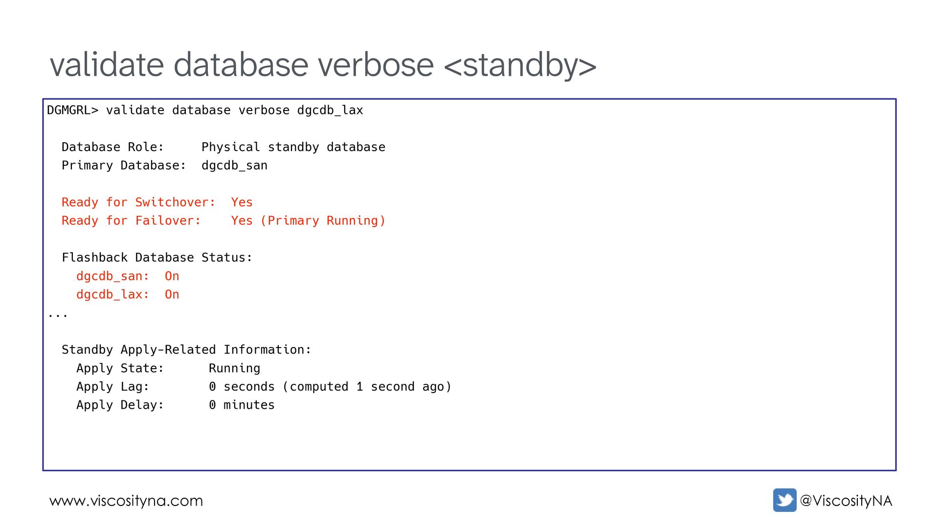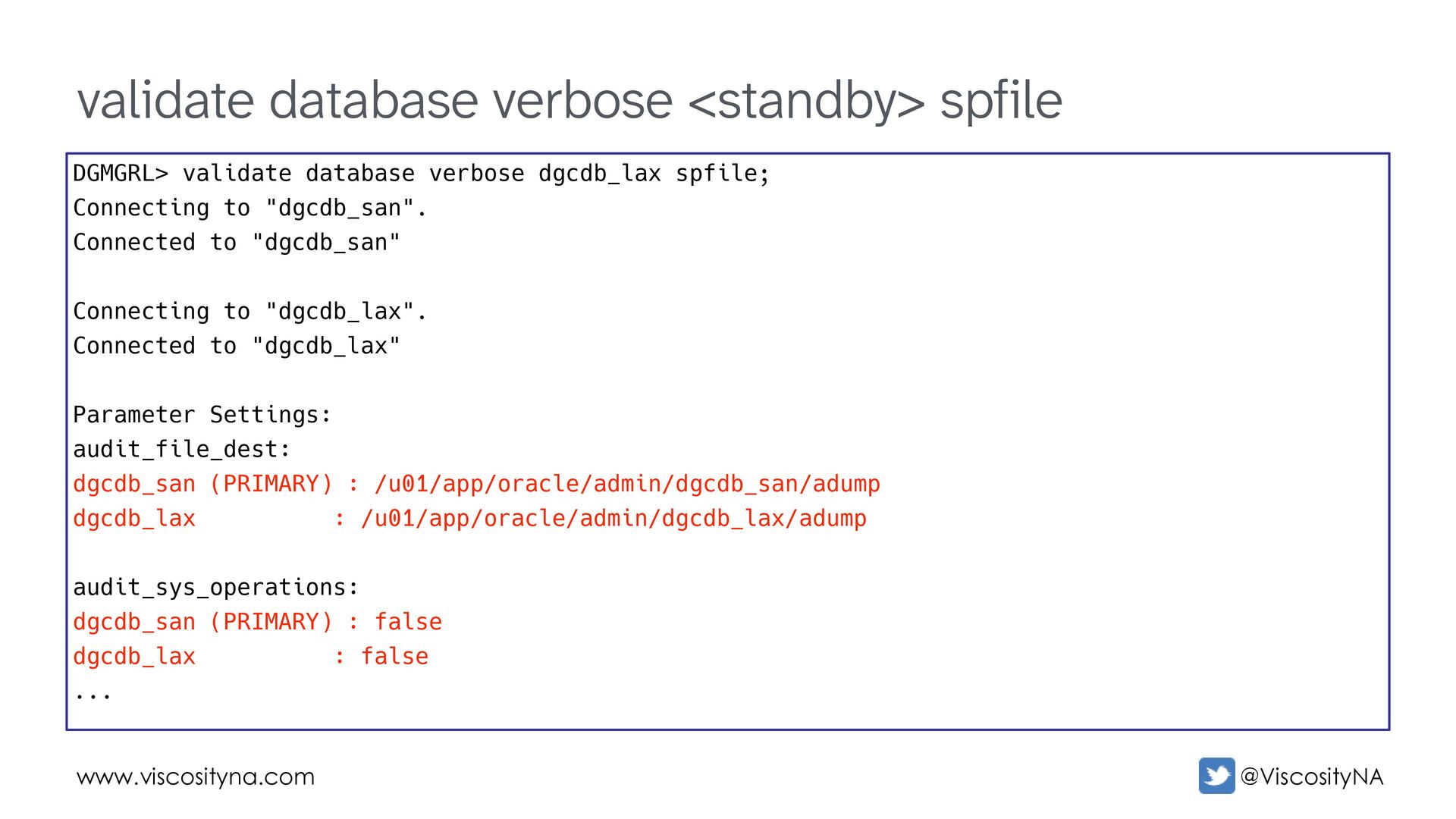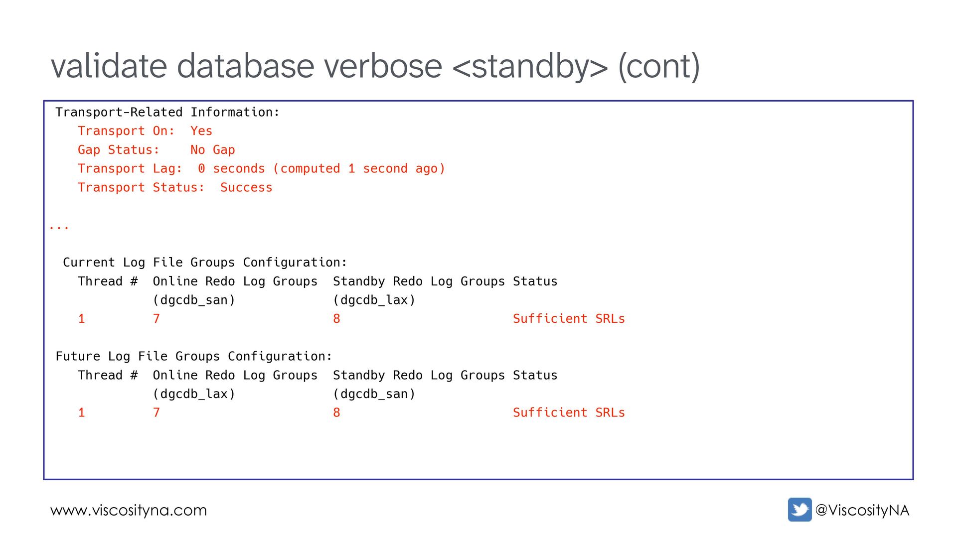 start databases • Used for switchover, convert, and reinstate operations • This connection is exclusively for the Data Guard Broker! • Oracle sets StaticConnectIdentifier using local_listener • ...appends _DGMGRL to the service • Oracle automatically manages this value unless users change: • The Broker's StaticConnectIdentifier • The local_listener parameter StaticConnectIdentifier