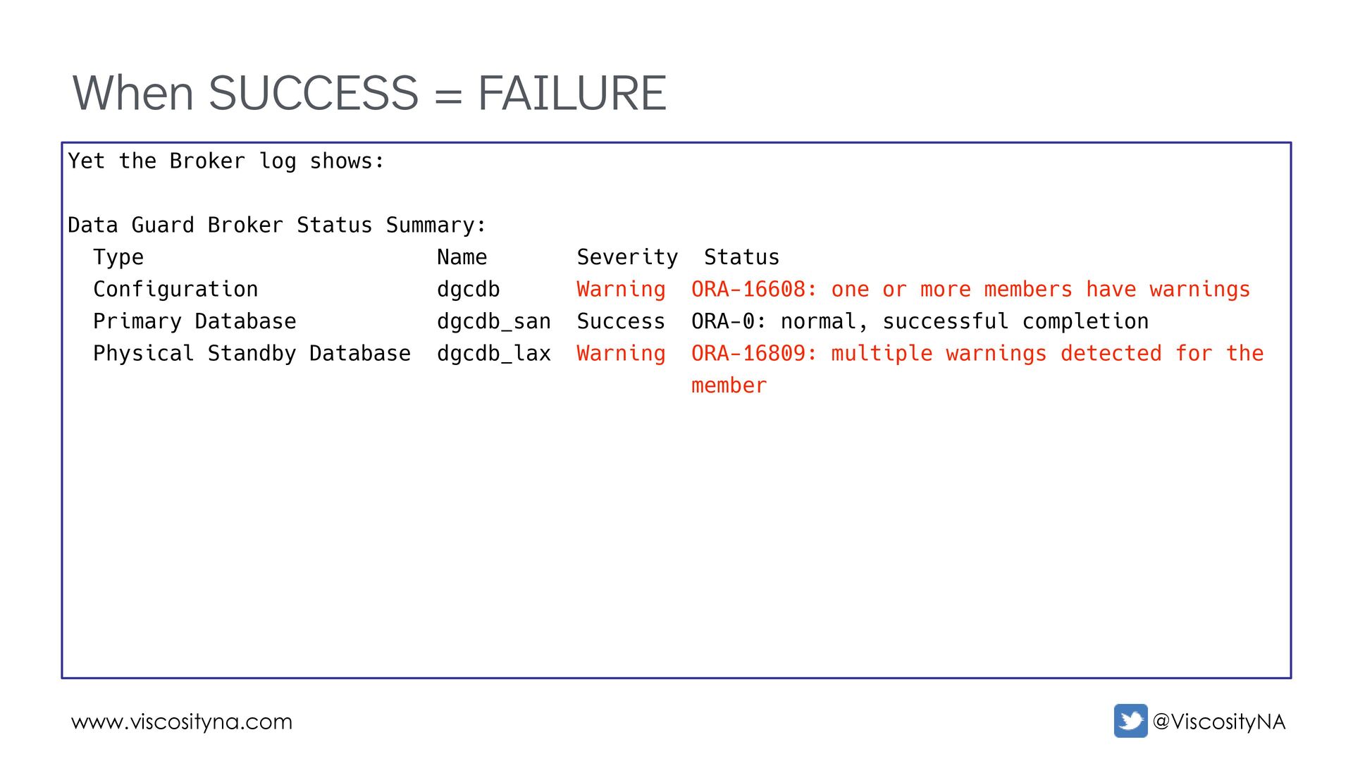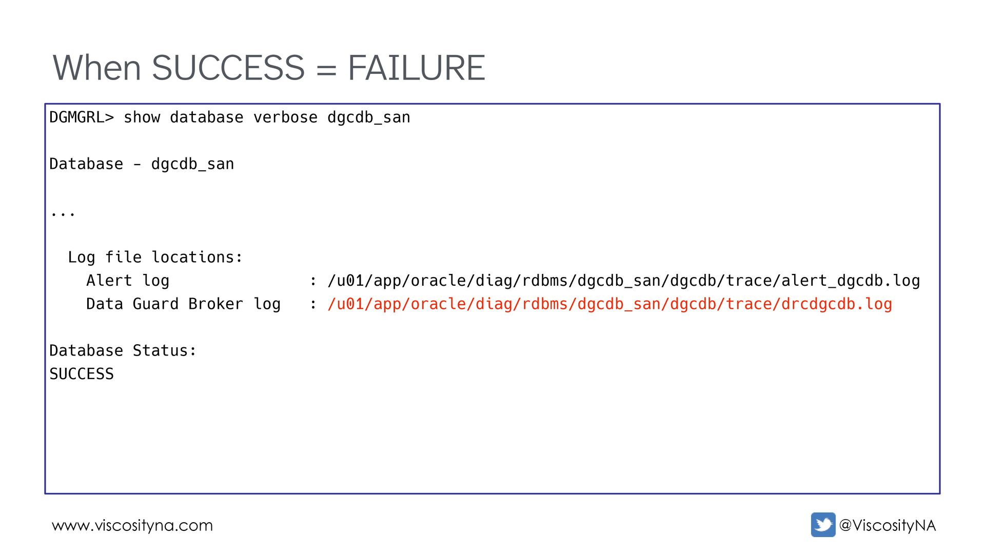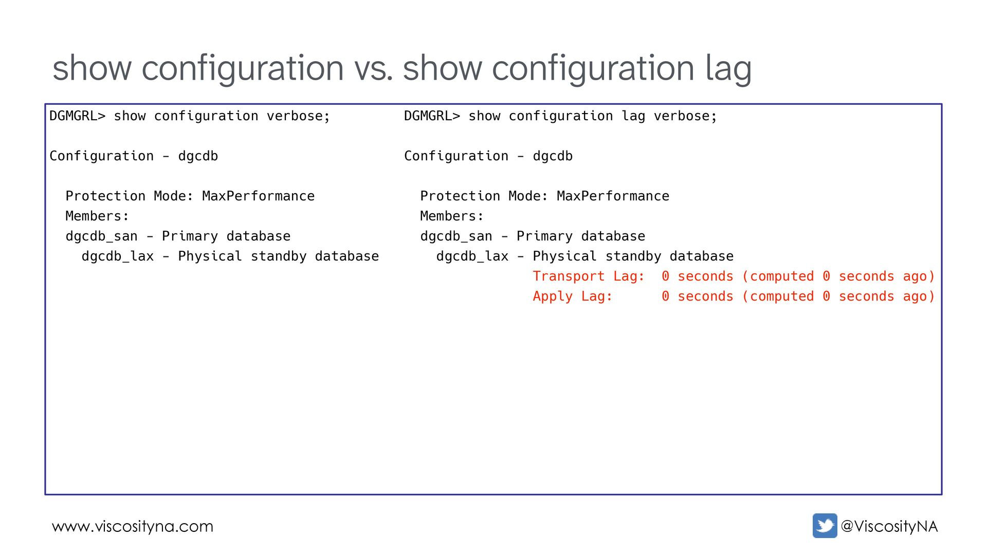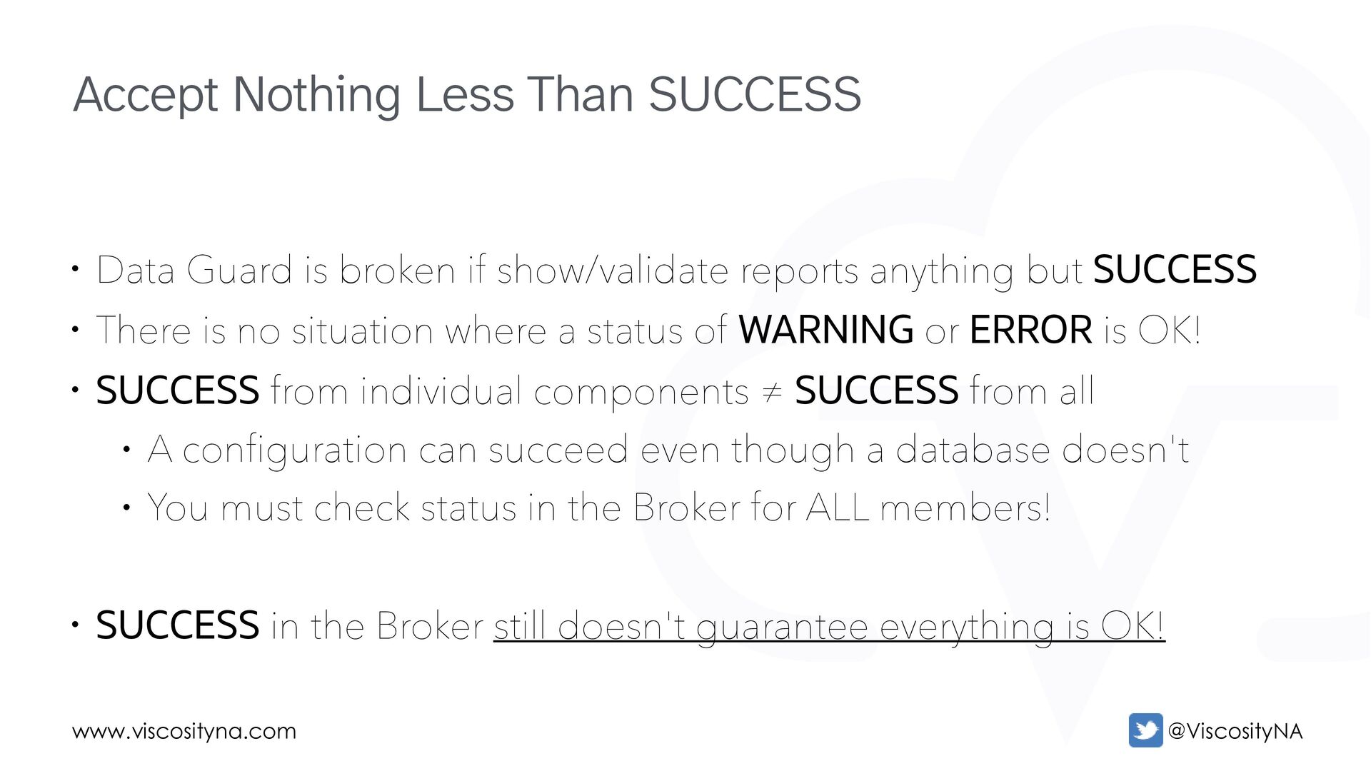 start databases • Used for switchover, convert, and reinstate operations • This connection is exclusively for the Data Guard Broker! • Oracle sets StaticConnectIdentifier using local_listener • ...appends _DGMGRL to the service • Oracle automatically manages this value unless users change: • The Broker's StaticConnectIdentifier • The local_listener parameter StaticConnectIdentifier