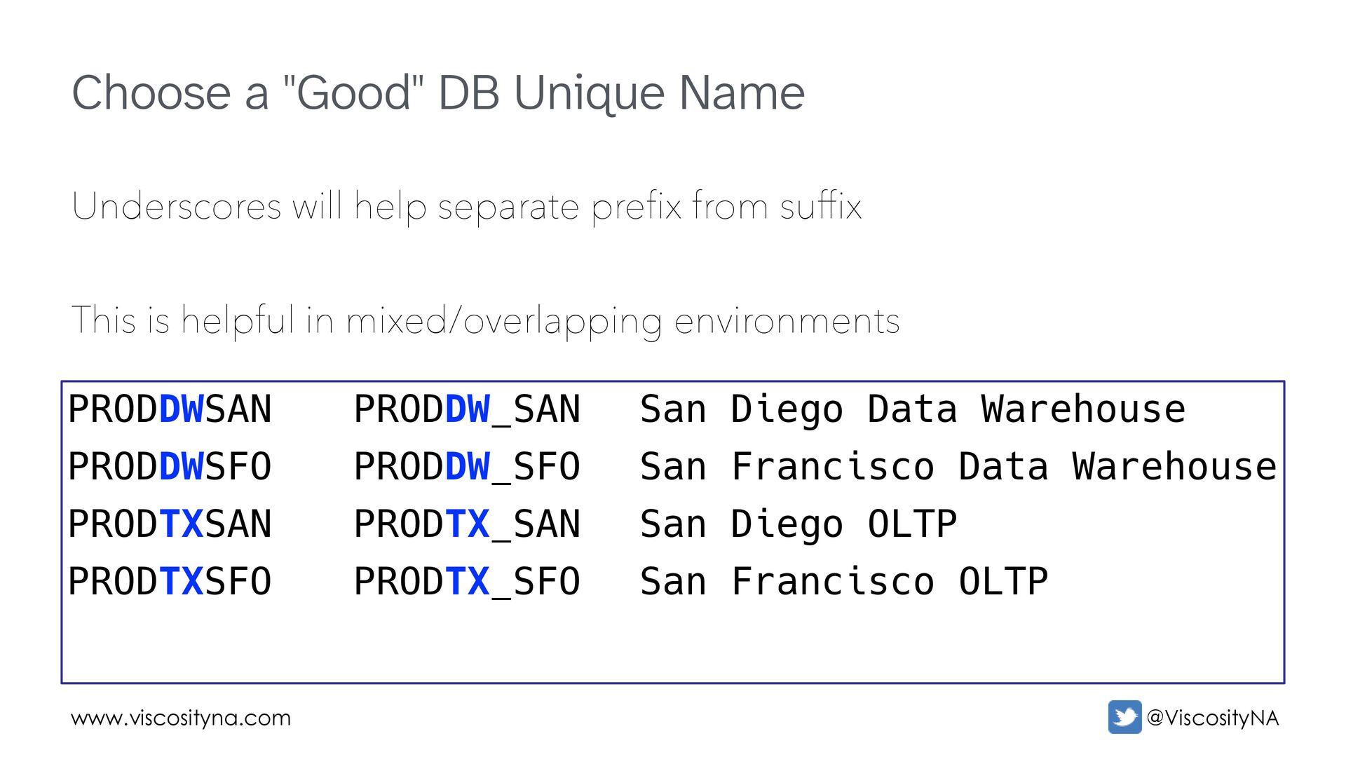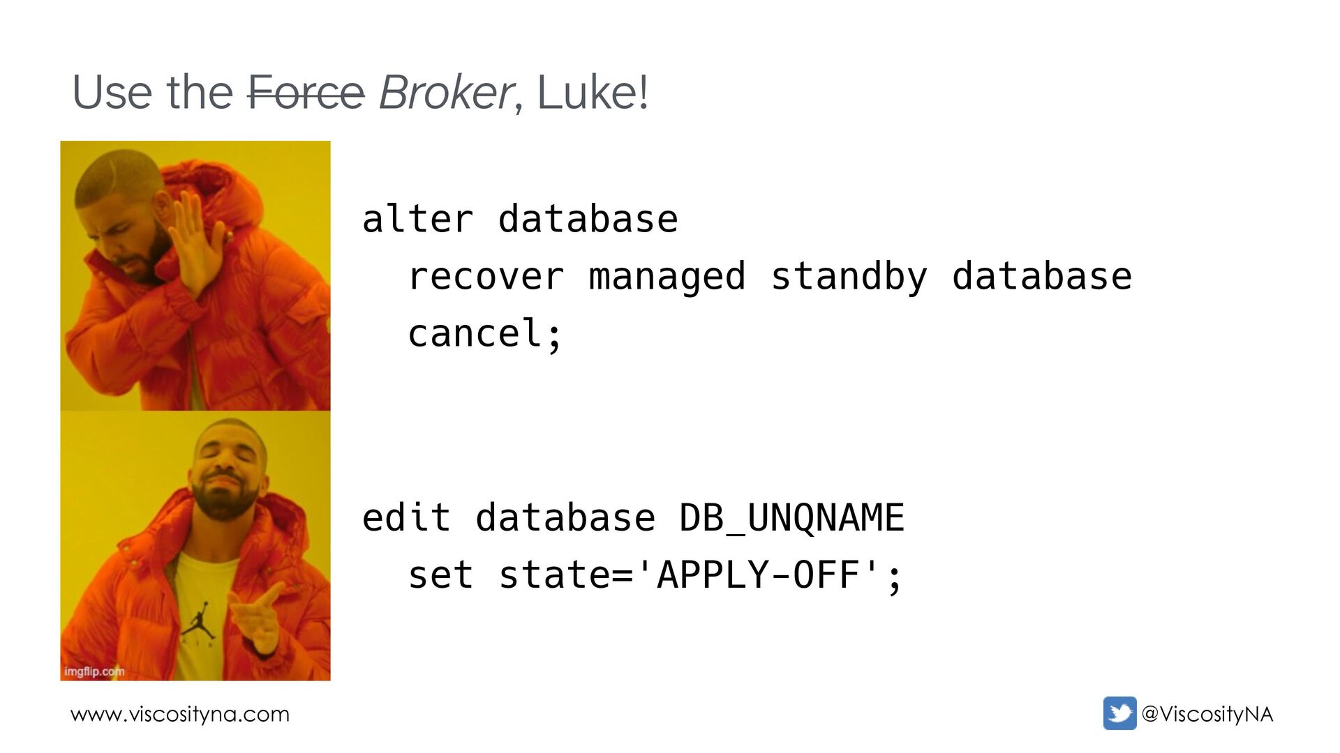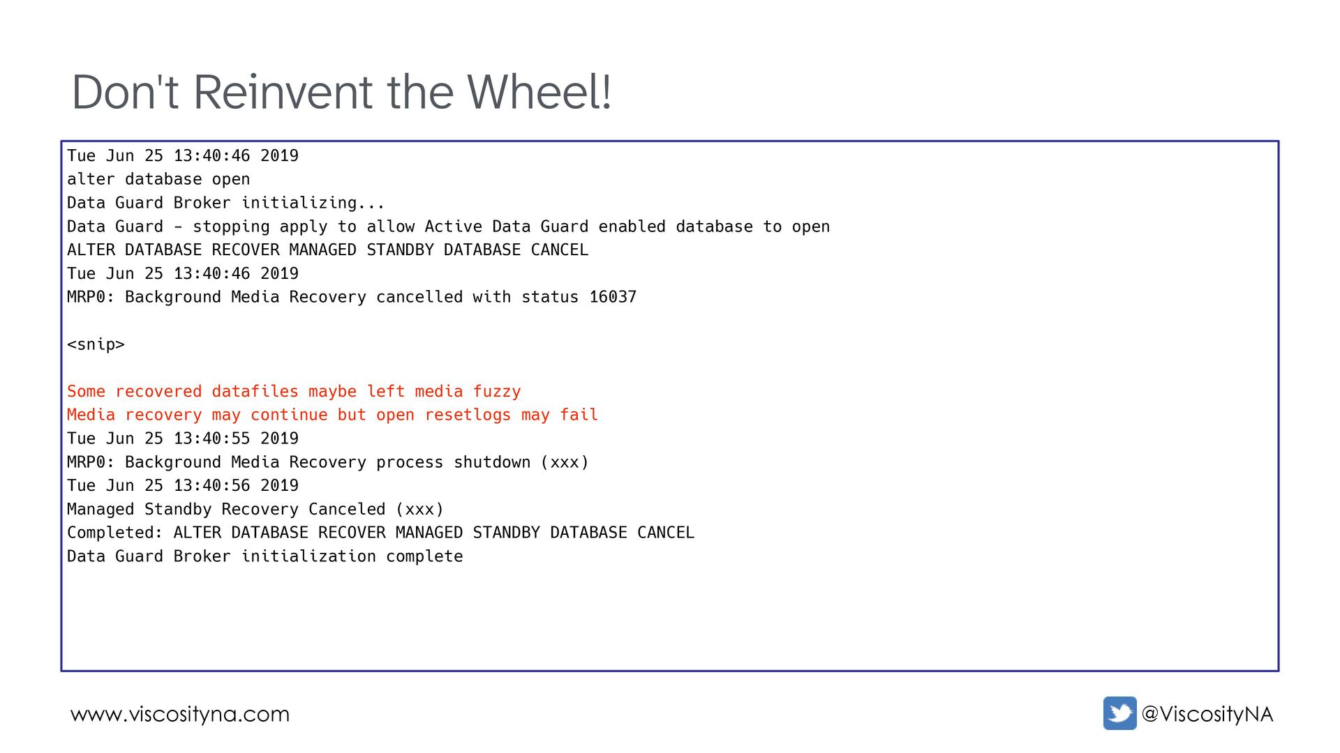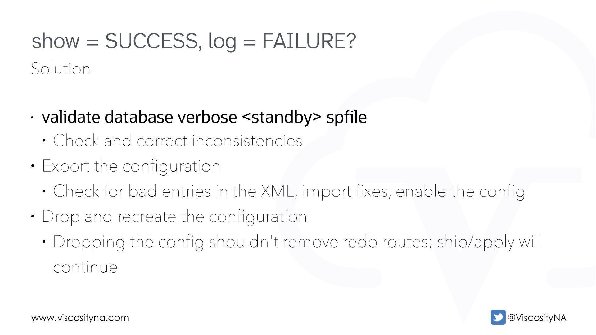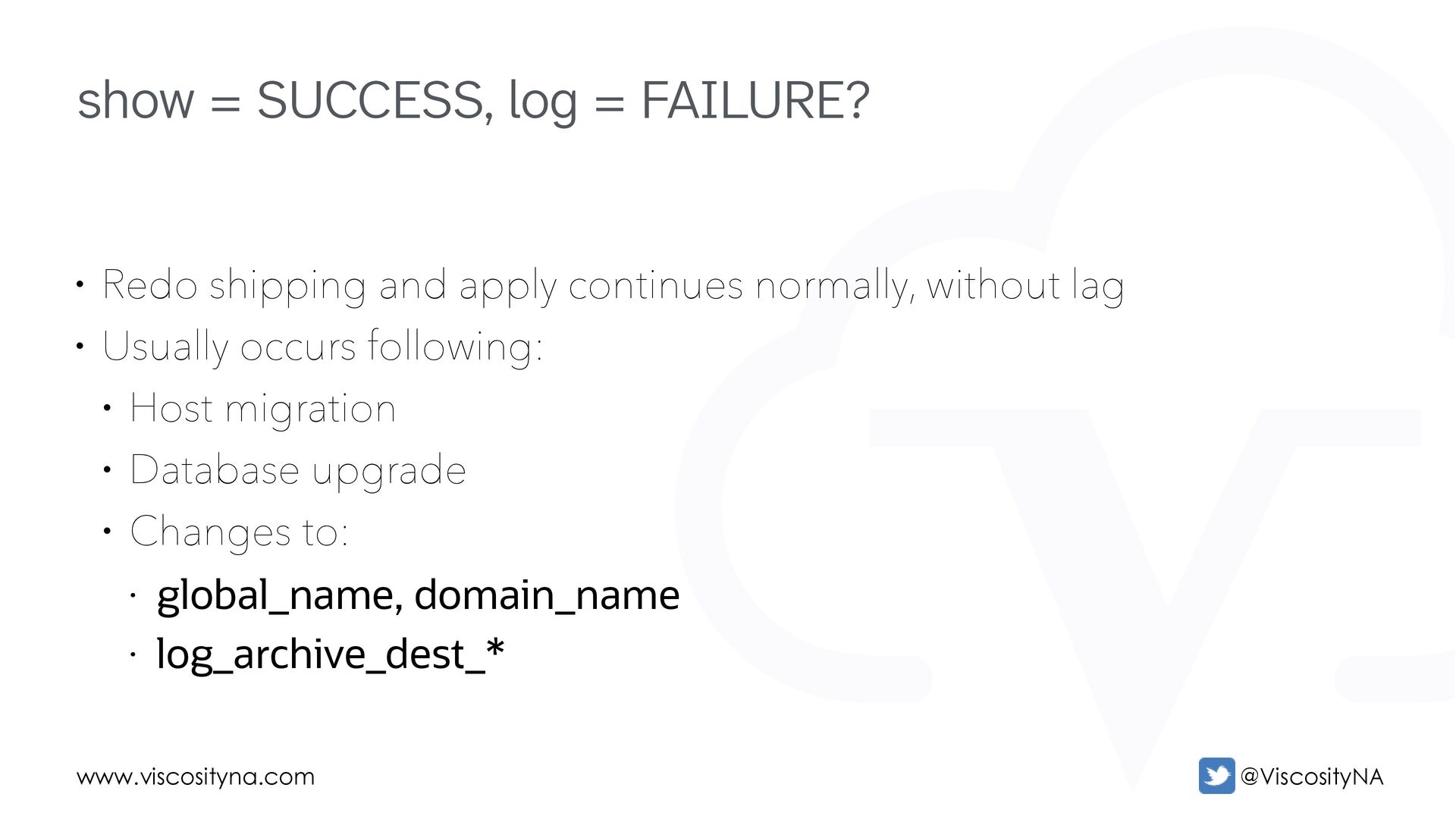 start databases • Used for switchover, convert, and reinstate operations • This connection is exclusively for the Data Guard Broker! • Oracle sets StaticConnectIdentifier using local_listener • ...appends _DGMGRL to the service • Oracle automatically manages this value unless users change: • The Broker's StaticConnectIdentifier • The local_listener parameter StaticConnectIdentifier