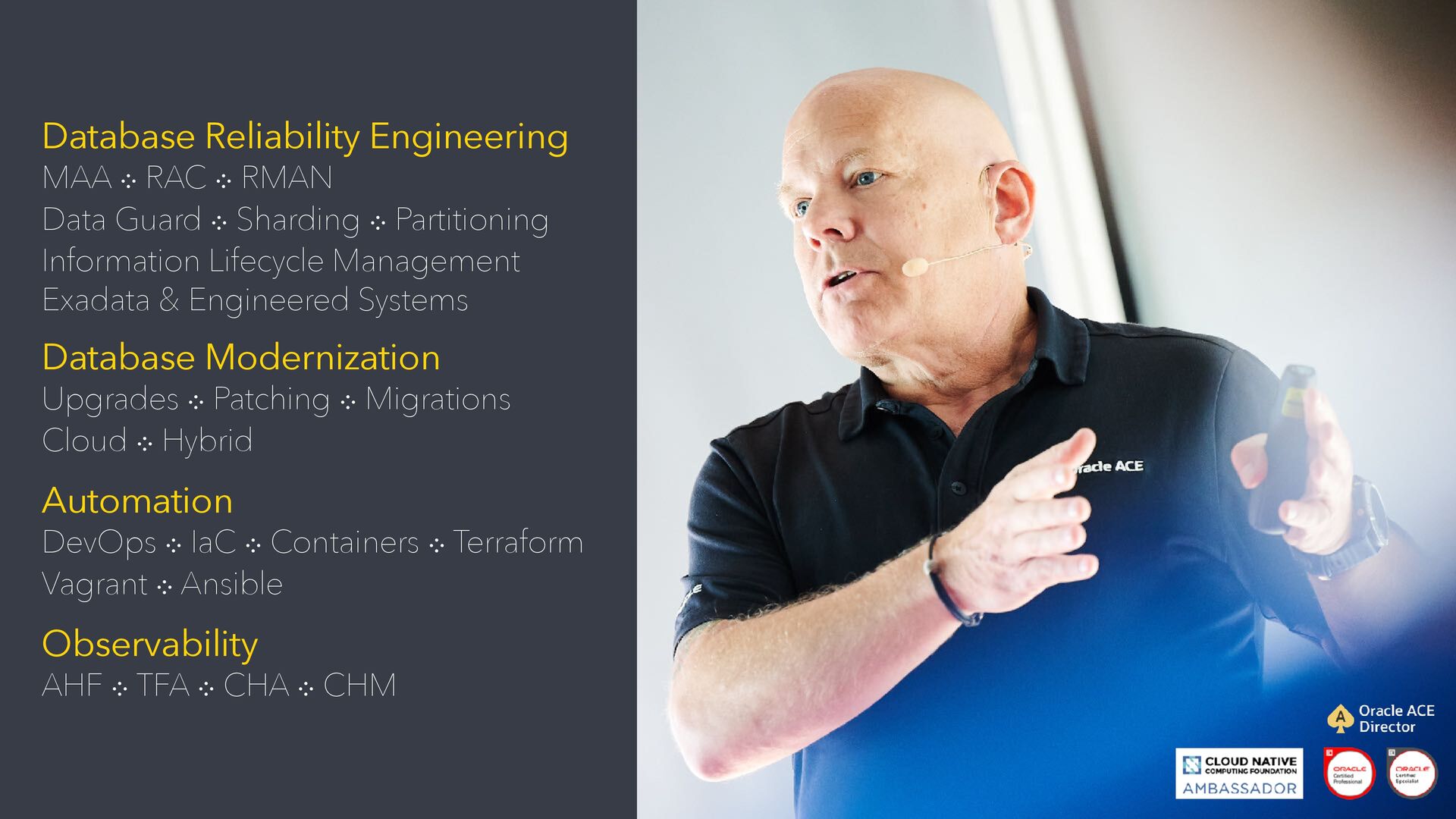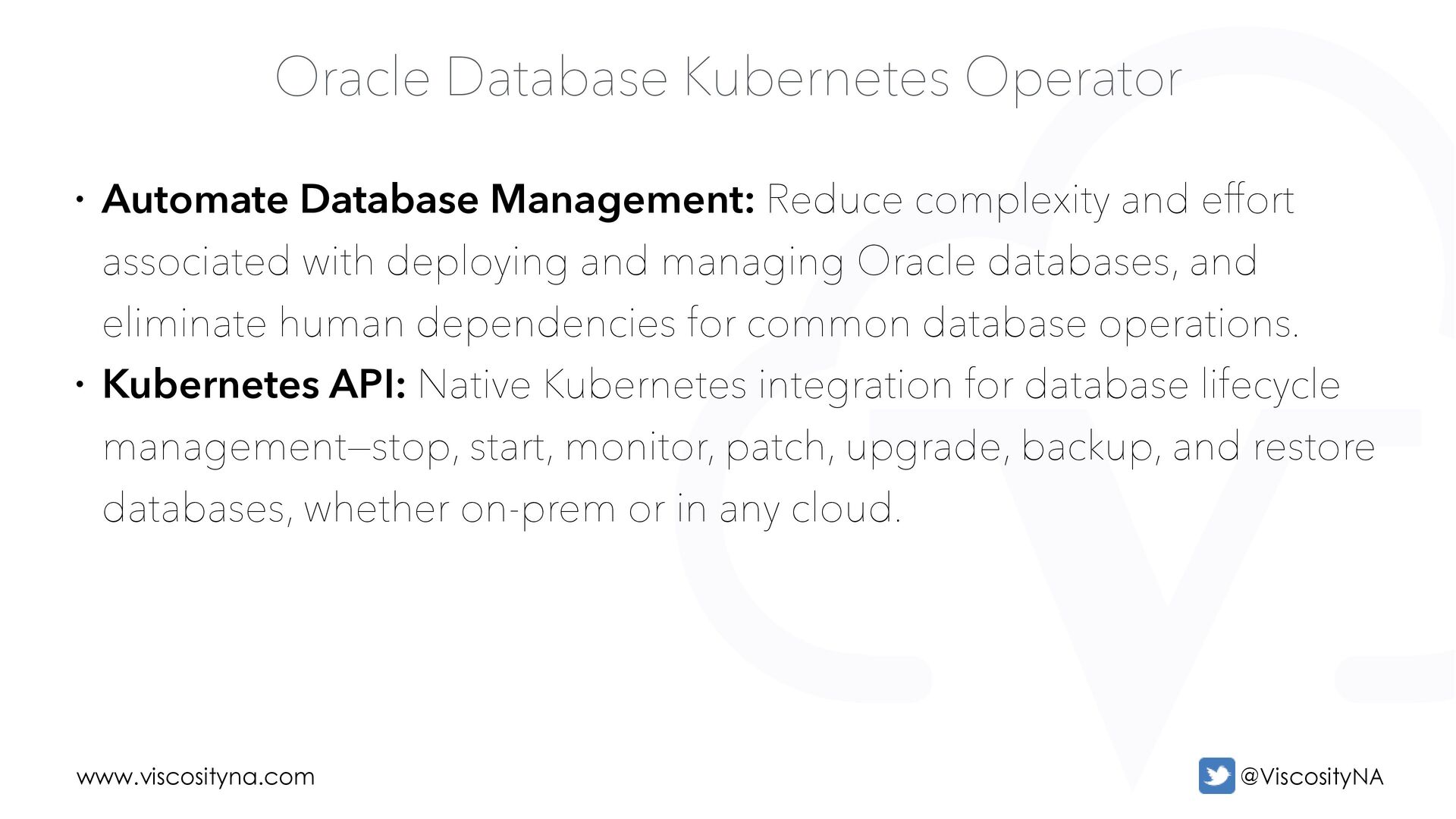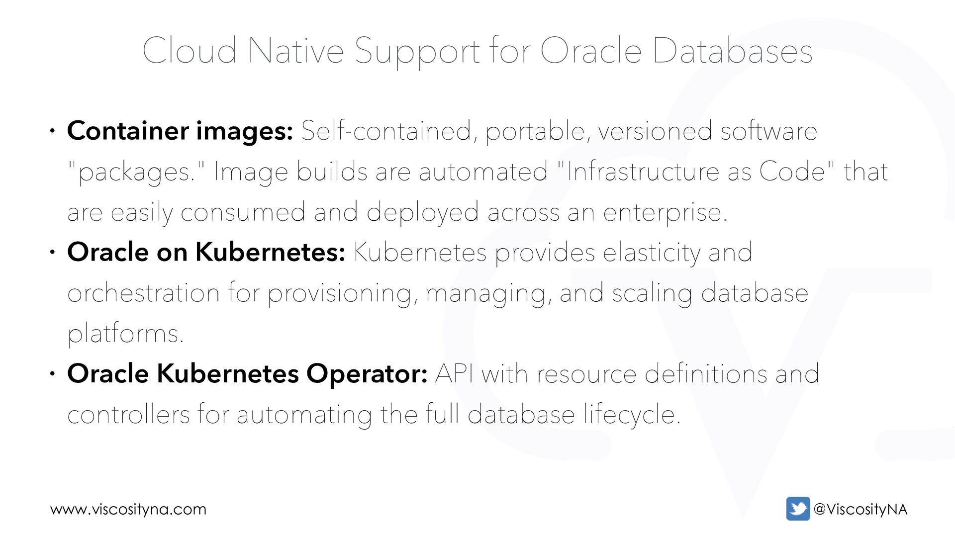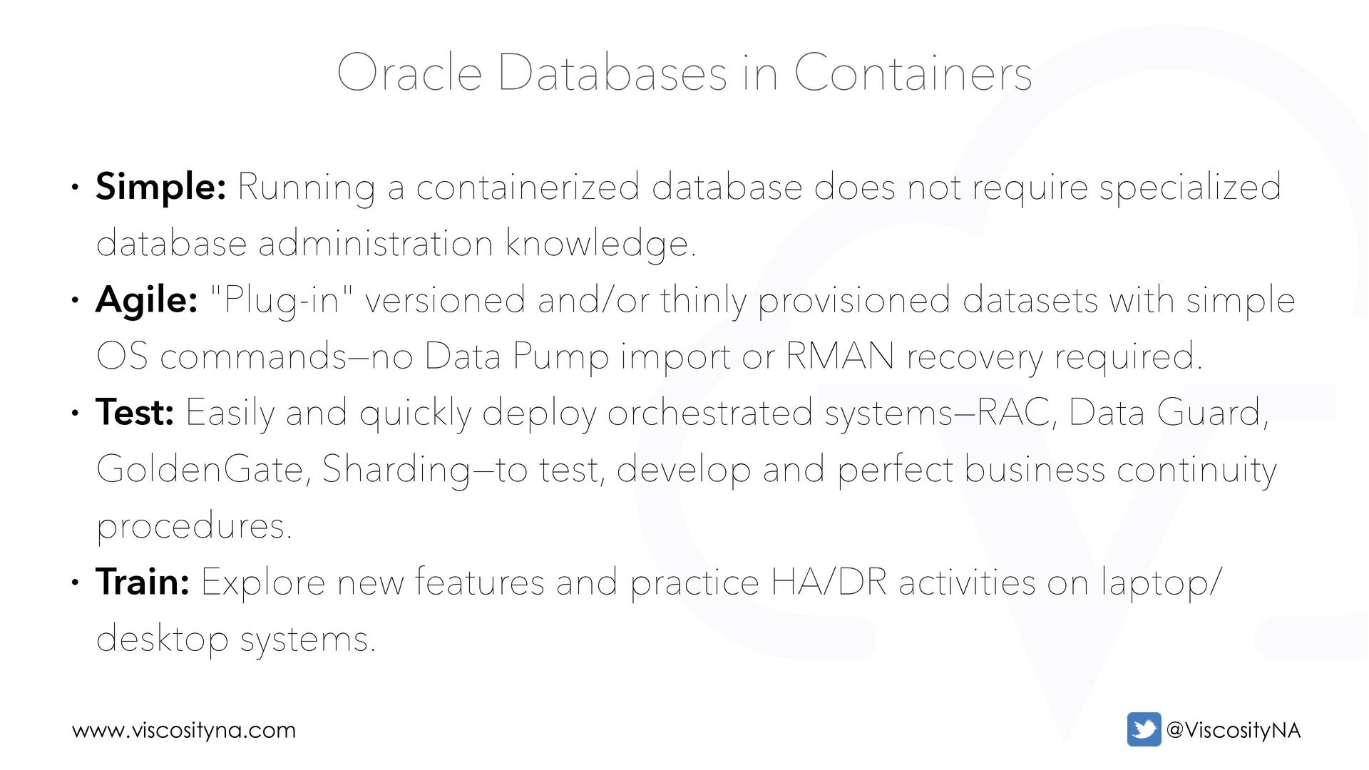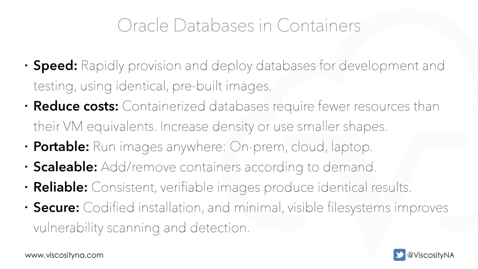 and deploy databases for development and testing, using identical, pre-built images. • Reduce costs: Containerized databases require fewer resources than their VM equivalents. Increase density or use smaller shapes. • Portable: Run images anywhere: On-prem, cloud, laptop. • Scaleable: Add/remove containers according to demand. • Reliable: Consistent, verifiable images produce identical results. • Secure: Codified installation, and minimal, visible filesystems improves vulnerability scanning and detection.