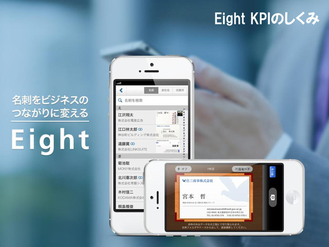 Eight ユーザ数:600,000+ 人 1日あたりの新規名刺枚数:100,000+ 枚 総名刺枚数:20,000,000 + 枚