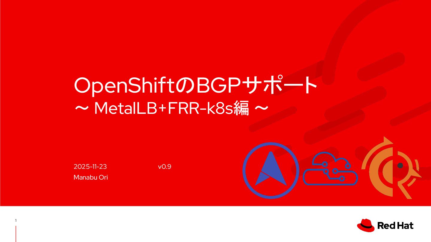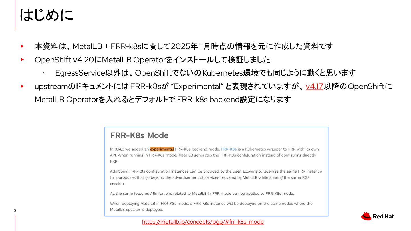 1. はじめに ▸ 本資料は、MetalLB + FRR-k8sに関して2025年11月時点の情報を元に作成した資料です ▸ OpenShift v4.20にMetalLB Operatorをインストールして検証しました ・