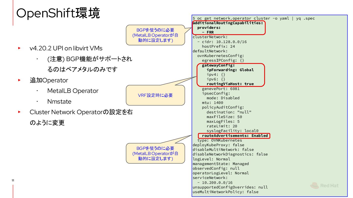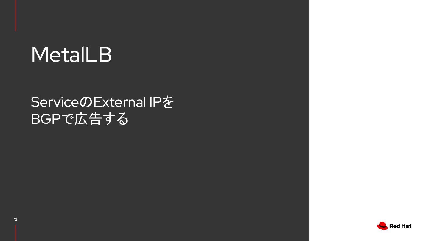 るのはベアメタルのみです ▸ 追加Operator ・ MetalLB Operator ・ Nmstate ▸ Cluster Network Operatorの設定を右 のように変更 $ oc get network.operator cluster -o yaml | yq .spec additionalRoutingCapabilities: providers: - FRR clusterNetwork: - cidr: 10.128.0.0/16 hostPrefix: 24 defaultNetwork: ovnKubernetesConfig: egressIPConfig: {} gatewayConfig: ipForwarding: Global ipv4: {} ipv6: {} routingViaHost: true genevePort: 6081 ipsecConfig: mode: Disabled mtu: 1400 policyAuditConfig: destination: "null" maxFileSize: 50 maxLogFiles: 5 rateLimit: 20 syslogFacility: local0 routeAdvertisements: Enabled type: OVNKubernetes deployKubeProxy: false disableMultiNetwork: false disableNetworkDiagnostics: false logLevel: Normal managementState: Managed observedConfig: null operatorLogLevel: Normal serviceNetwork: - 10.200.0.0/16 unsupportedConfigOverrides: null useMultiNetworkPolicy: false BGPを使うのに必要 (MetalLB Operatorが自 動的に設定します) VRF設定時に必要 BGPを使うのに必要 (MetalLB Operatorが自 動的に設定します) 11