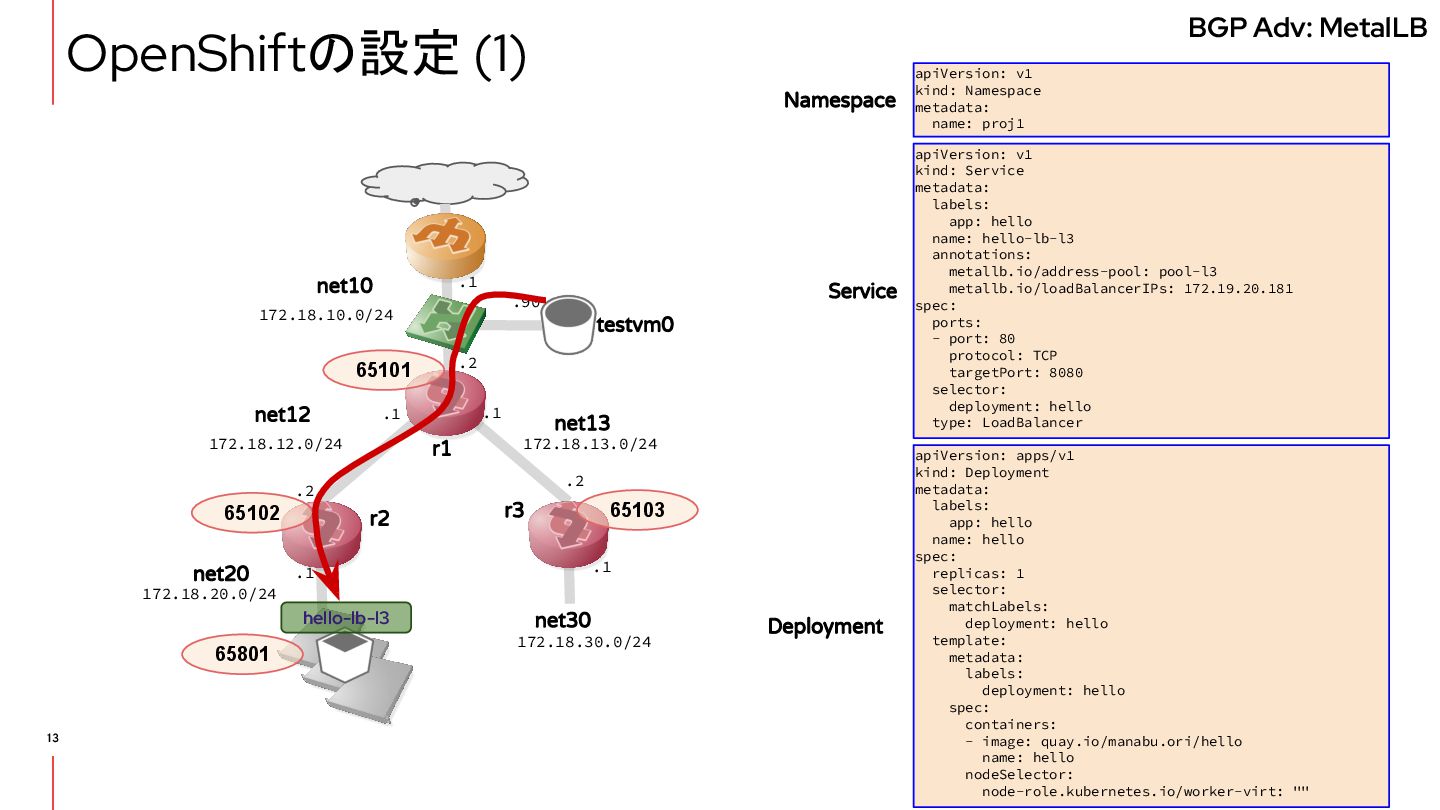 172.18.12.0/24 172.18.13.0/24 172.18.20.0/24 .1 .2 .2 .1 .2 .1 .90 65101 65102 65103 .1 .1 testvm0 net30 172.18.30.0/24 apiVersion: v1 kind: Namespace metadata: name: proj1 apiVersion: v1 kind: Service metadata: labels: app: hello name: hello-lb-l3 annotations: metallb.io/address-pool: pool-l3 metallb.io/loadBalancerIPs: 172.19.20.181 spec: ports: - port: 80 protocol: TCP targetPort: 8080 selector: deployment: hello type: LoadBalancer apiVersion: apps/v1 kind: Deployment metadata: labels: app: hello name: hello spec: replicas: 1 selector: matchLabels: deployment: hello template: metadata: labels: deployment: hello spec: containers: - image: quay.io/manabu.ori/hello name: hello nodeSelector: node-role.kubernetes.io/worker-virt: "" Namespace Service Deployment 65801 13 hello-lb-l3 BGP Adv: MetalLB