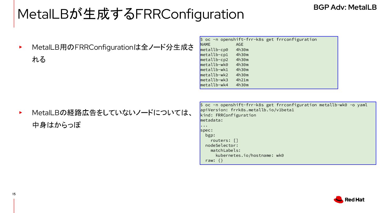 frrconfiguration NAME AGE metallb-cp0 4h30m metallb-cp1 4h30m metallb-cp2 4h30m metallb-wk0 4h30m metallb-wk1 4h30m metallb-wk2 4h30m metallb-wk3 4h21m metallb-wk4 4h30m $ oc -n openshift-frr-k8s get frrconfiguration metallb-wk0 -o yaml apiVersion: frrk8s.metallb.io/v1beta1 kind: FRRConfiguration metadata: ... spec: bgp: routers: [] nodeSelector: matchLabels: kubernetes.io/hostname: wk0 raw: {} ▸ MetalLBの経路広告をしていないノードについては、 中身はからっぽ BGP Adv: MetalLB