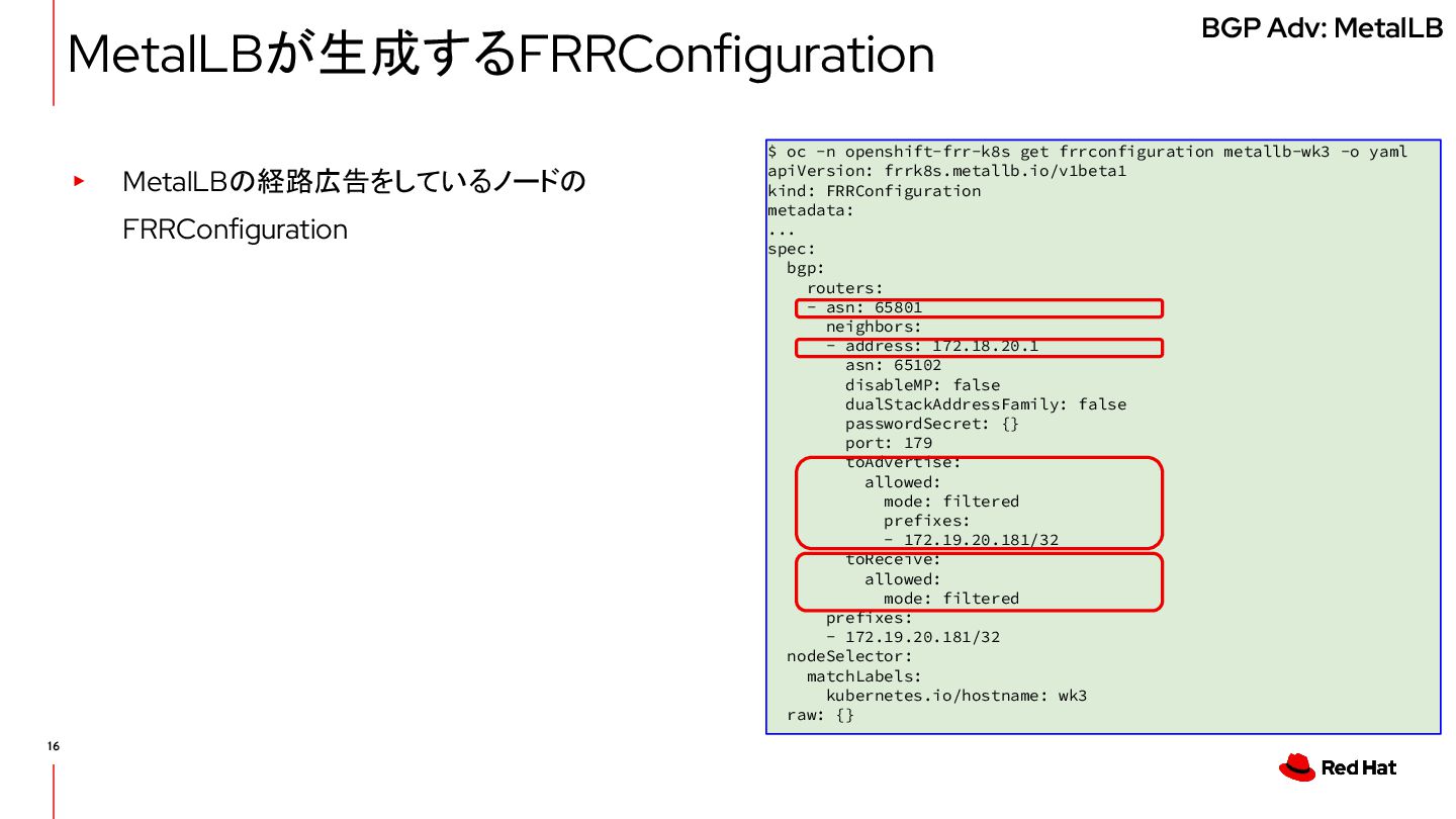 yaml | yq .spec bgp: routers: - asn: 65801 neighbors: - address: 172.18.20.1 asn: 65102 disableMP: false dualStackAddressFamily: false toReceive: allowed: mode: all $ oc -n openshift-frr-k8s get frrconfiguration metallb-wk3 -o yaml | yq .spec bgp: routers: - asn: 65801 neighbors: - address: 172.18.20.1 asn: 65102 disableMP: false dualStackAddressFamily: false passwordSecret: {} port: 179 toAdvertise: allowed: mode: filtered prefixes: - 172.19.20.181/32 toReceive: allowed: mode: filtered prefixes: - 172.19.20.181/32 nodeSelector: matchLabels: kubernetes.io/hostname: wk3 raw: {} この2つのFRRConfigurationがマージされて、外部 からの経路を受け取れるようになる 手で追加した FRRConfiguration MetalLBが生成した FRRConfiguration MetalLB route import