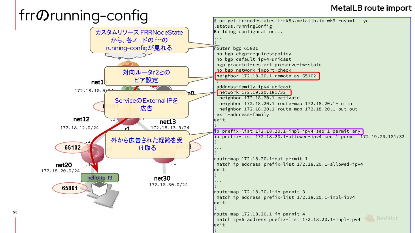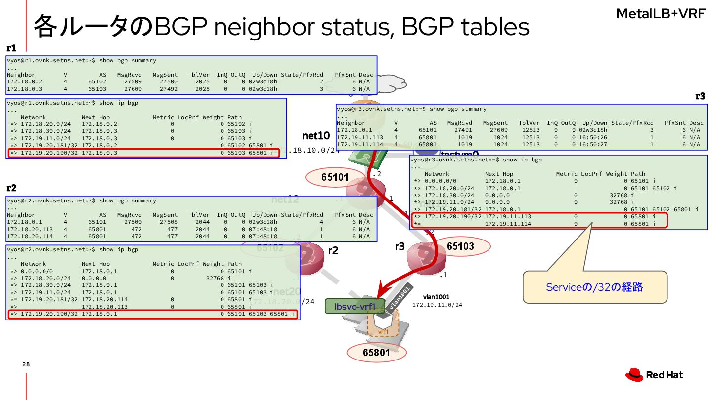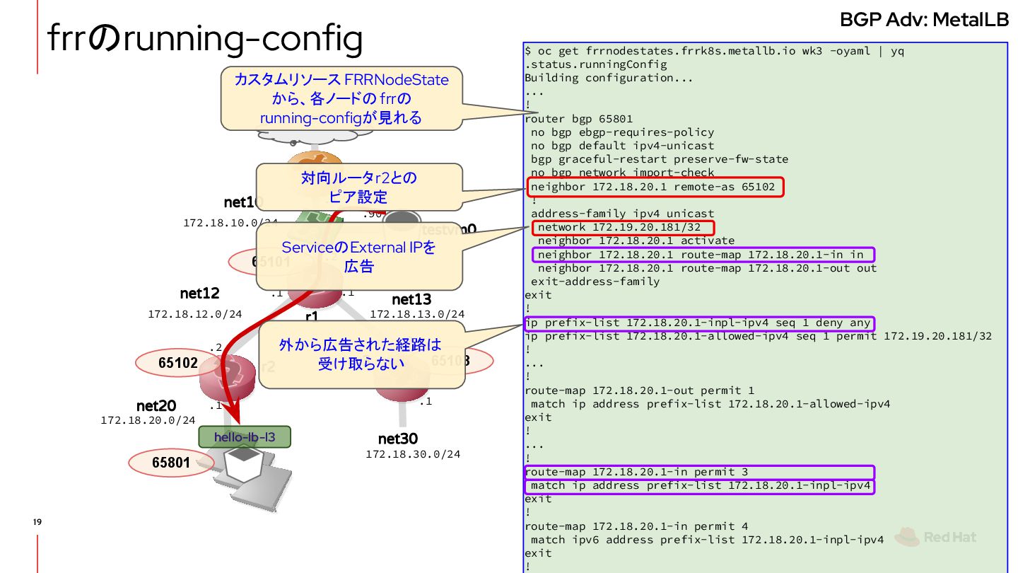 172.18.12.0/24 172.18.13.0/24 172.18.20.0/24 .1 .2 .2 .1 .2 .1 .90 65101 65102 65103 .1 .1 testvm0 net30 172.18.30.0/24 65801 hello-lb-l3 $ oc get frrnodestates.frrk8s.metallb.io wk3 -oyaml | yq .status.runningConfig Building configuration... ... ! router bgp 65801 no bgp ebgp-requires-policy no bgp default ipv4-unicast bgp graceful-restart preserve-fw-state no bgp network import-check neighbor 172.18.20.1 remote-as 65102 ! address-family ipv4 unicast network 172.19.20.181/32 neighbor 172.18.20.1 activate neighbor 172.18.20.1 route-map 172.18.20.1-in in neighbor 172.18.20.1 route-map 172.18.20.1-out out exit-address-family exit ! ip prefix-list 172.18.20.1-inpl-ipv4 seq 1 permit any ip prefix-list 172.18.20.1-allowed-ipv4 seq 1 permit 172.19.20.181/32 ! ... ! route-map 172.18.20.1-out permit 1 match ip address prefix-list 172.18.20.1-allowed-ipv4 exit ! ... ! route-map 172.18.20.1-in permit 3 match ip address prefix-list 172.18.20.1-inpl-ipv4 exit ! route-map 172.18.20.1-in permit 4 match ipv6 address prefix-list 172.18.20.1-inpl-ipv4 exit ! ServiceのExternal IPを 広告 対向ルータr2との ピア設定 カスタムリソース FRRNodeState から、各ノードの frrの running-configが見れる 外から広告された経路を受 け取る MetalLB route import