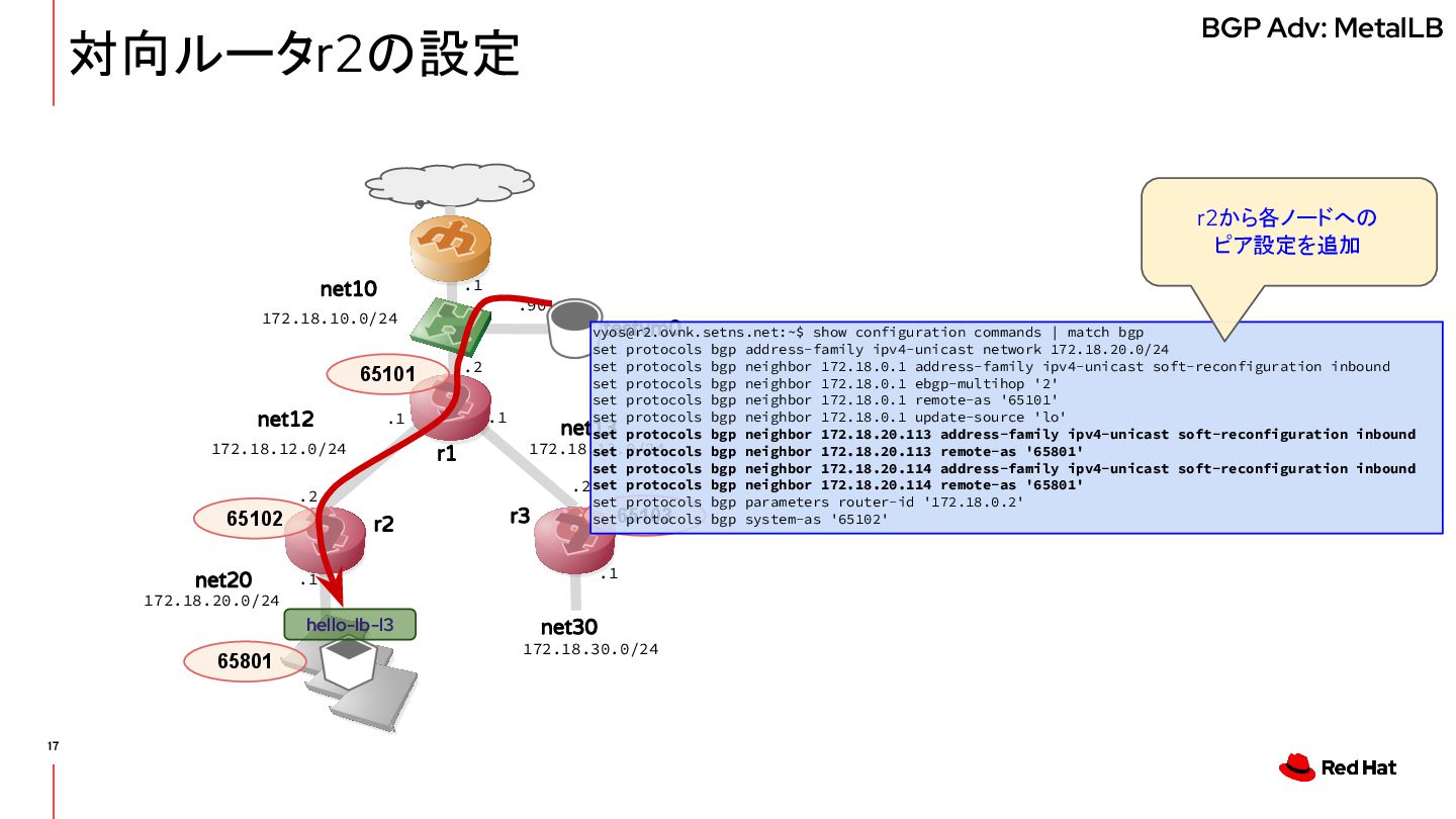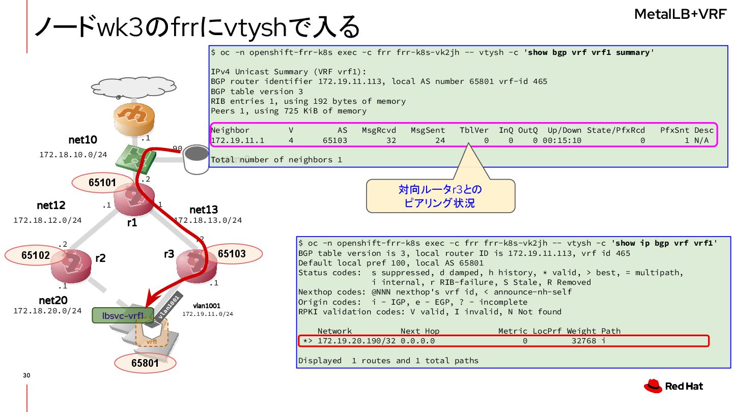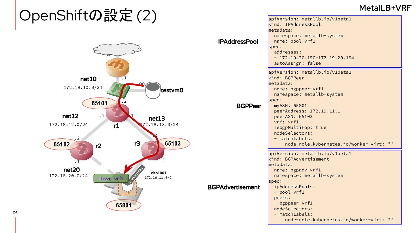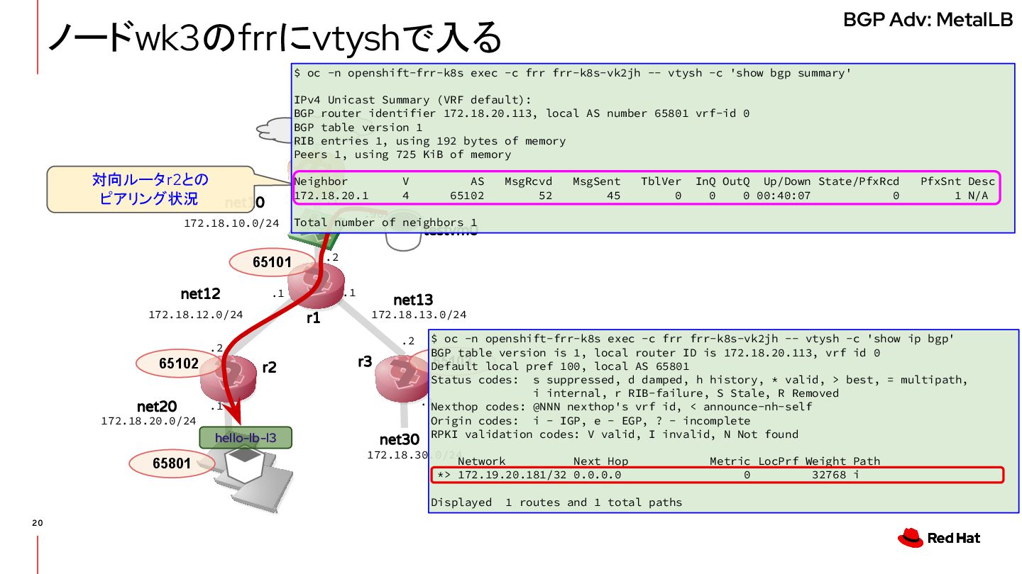 172.18.12.0/24 172.18.13.0/24 172.18.20.0/24 .1 .2 .2 .1 .2 .1 .90 65101 65102 65103 .1 .1 testvm0 net30 172.18.30.0/24 65801 hello-lb-l3 $ oc get frrnodestates.frrk8s.metallb.io wk3 -oyaml | yq .status.runningConfig Building configuration... ... ! router bgp 65801 no bgp ebgp-requires-policy no bgp default ipv4-unicast bgp graceful-restart preserve-fw-state no bgp network import-check neighbor 172.18.20.1 remote-as 65102 ! address-family ipv4 unicast network 172.19.20.181/32 neighbor 172.18.20.1 activate neighbor 172.18.20.1 route-map 172.18.20.1-in in neighbor 172.18.20.1 route-map 172.18.20.1-out out exit-address-family exit ! ip prefix-list 172.18.20.1-inpl-ipv4 seq 1 permit any ip prefix-list 172.18.20.1-allowed-ipv4 seq 1 permit 172.19.20.181/32 ! ... ! route-map 172.18.20.1-out permit 1 match ip address prefix-list 172.18.20.1-allowed-ipv4 exit ! ... ! route-map 172.18.20.1-in permit 3 match ip address prefix-list 172.18.20.1-inpl-ipv4 exit ! route-map 172.18.20.1-in permit 4 match ipv6 address prefix-list 172.18.20.1-inpl-ipv4 exit ! ServiceのExternal IPを 広告 対向ルータr2との ピア設定 カスタムリソース FRRNodeState から、各ノードの frrの running-configが見れる 外から広告された経路を受 け取る MetalLB route import
