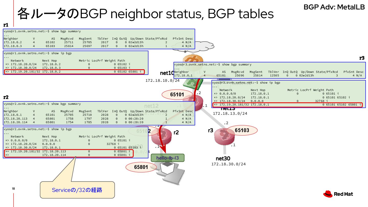 r2 r3 net20 172.18.10.0/24 172.18.12.0/24 172.18.13.0/24 172.18.20.0/24 .1 .2 .2 .1 .2 .1 .90 65101 65102 65103 .1 .1 testvm0 net30 172.18.30.0/24 65801 hello-lb-l3 [email protected]:~$ show bgp summary ... Neighbor V AS MsgRcvd MsgSent TblVer InQ OutQ Up/Down State/PfxRcd PfxSnt Desc 172.18.0.2 4 65102 25711 25705 2017 0 0 02w2d13h 2 4 N/A 172.18.0.3 4 65103 25814 25697 2017 0 0 02w2d13h 1 4 N/A [email protected]:~$ show ip bgp ... Network Next Hop Metric LocPrf Weight Path *> 172.18.20.0/24 172.18.0.2 0 0 65102 i *> 172.18.30.0/24 172.18.0.3 0 0 65103 i *> 172.19.20.181/32 172.18.0.2 0 65102 65801 i [email protected]:~$ show bgp summary ... Neighbor V AS MsgRcvd MsgSent TblVer InQ OutQ Up/Down State/PfxRcd PfxSnt Desc 172.18.0.1 4 65101 25696 25814 12505 0 0 02w2d13h 3 4 N/A [email protected]:~$ show ip bgp ... Network Next Hop Metric LocPrf Weight Path *> 0.0.0.0/0 172.18.0.1 0 0 65101 i *> 172.18.20.0/24 172.18.0.1 0 65101 65102 i *> 172.18.30.0/24 0.0.0.0 0 32768 i *> 172.19.20.181/32 172.18.0.1 0 65101 65102 65801 i r1 r2 r3 [email protected]:~$ show bgp summary ... Neighbor V AS MsgRcvd MsgSent TblVer InQ OutQ Up/Down State/PfxRcd PfxSnt Desc 172.18.0.1 4 65101 25705 25710 2028 0 0 02w2d13h 2 4 N/A 172.18.20.113 4 65801 1758 1797 2028 0 0 00:28:20 1 4 N/A 172.18.20.114 4 65801 1754 1785 2028 0 0 00:28:20 1 4 N/A [email protected]:~$ show ip bgp ... Network Next Hop Metric LocPrf Weight Path *> 0.0.0.0/0 172.18.0.1 0 0 65101 i *> 172.18.20.0/24 0.0.0.0 0 32768 i *> 172.18.30.0/24 172.18.0.1 0 65101 65103 i *= 172.19.20.181/32 172.18.20.113 0 0 65801 i *> 172.18.20.114 0 0 65801 i Serviceの/32の経路 BGP Adv: MetalLB