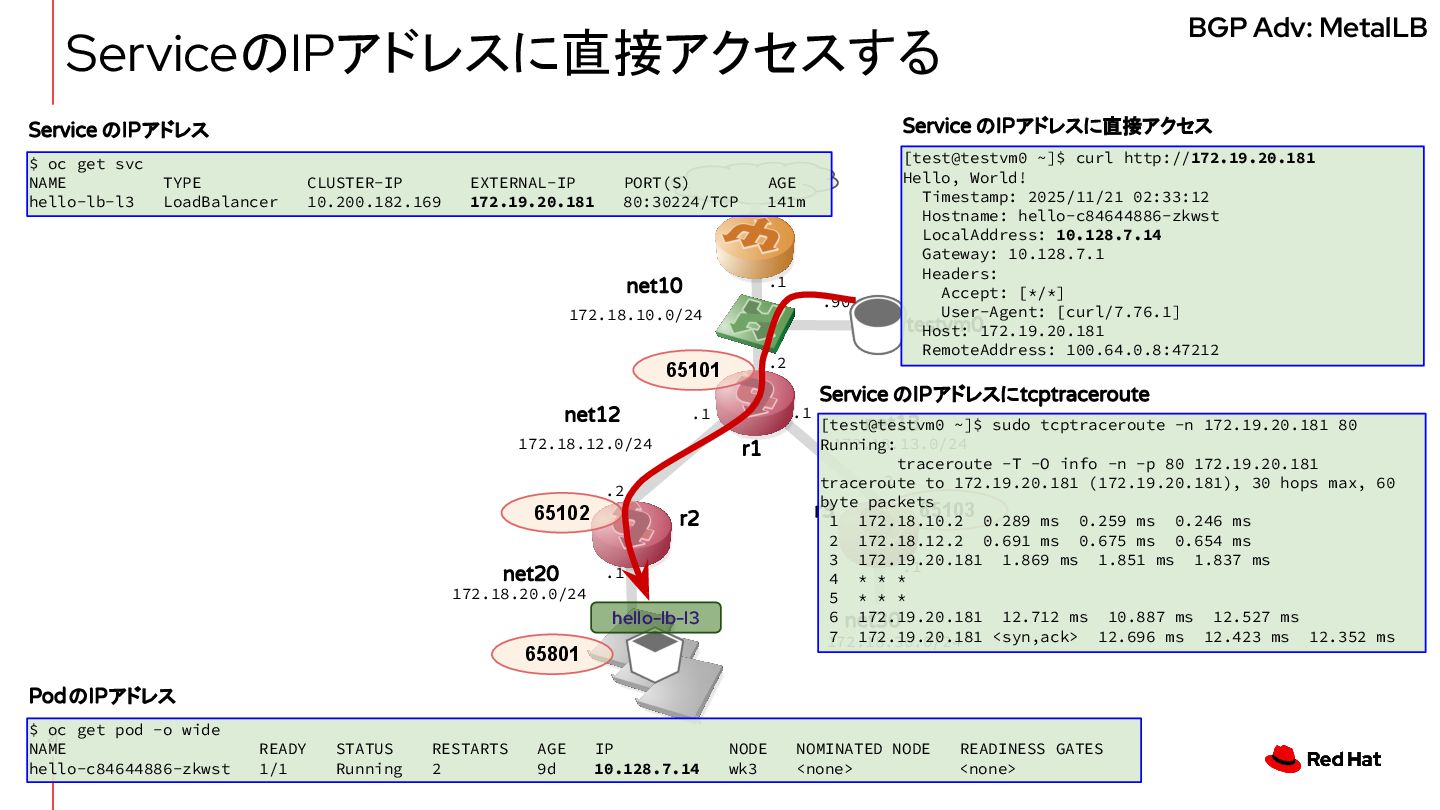 172.18.12.0/24 172.18.13.0/24 172.18.20.0/24 .1 .2 .2 .1 .2 .1 .90 65101 65102 65103 .1 .1 testvm0 net30 172.18.30.0/24 65801 hello-lb-l3 PodのIPアドレス $ oc get pod -o wide NAME READY STATUS RESTARTS AGE IP NODE NOMINATED NODE READINESS GATES hello-c84644886-zkwst 1/1 Running 2 9d 10.128.7.14 wk3 <none> <none> [test@testvm0 ~]$ sudo tcptraceroute -n 172.19.20.181 80 Running: traceroute -T -O info -n -p 80 172.19.20.181 traceroute to 172.19.20.181 (172.19.20.181), 30 hops max, 60 byte packets 1 172.18.10.2 0.289 ms 0.259 ms 0.246 ms 2 172.18.12.2 0.691 ms 0.675 ms 0.654 ms 3 172.19.20.181 1.869 ms 1.851 ms 1.837 ms 4 * * * 5 * * * 6 172.19.20.181 12.712 ms 10.887 ms 12.527 ms 7 172.19.20.181 <syn,ack> 12.696 ms 12.423 ms 12.352 ms [test@testvm0 ~]$ curl http://172.19.20.181 Hello, World! Timestamp: 2025/11/21 02:33:12 Hostname: hello-c84644886-zkwst LocalAddress: 10.128.7.14 Gateway: 10.128.7.1 Headers: Accept: [*/*] User-Agent: [curl/7.76.1] Host: 172.19.20.181 RemoteAddress: 100.64.0.8:47212 Service のIPアドレスに直接アクセス Service のIPアドレスにtcptraceroute Service のIPアドレス $ oc get svc NAME TYPE CLUSTER-IP EXTERNAL-IP PORT(S) AGE hello-lb-l3 LoadBalancer 10.200.182.169 172.19.20.181 80:30224/TCP 141m BGP Adv: MetalLB