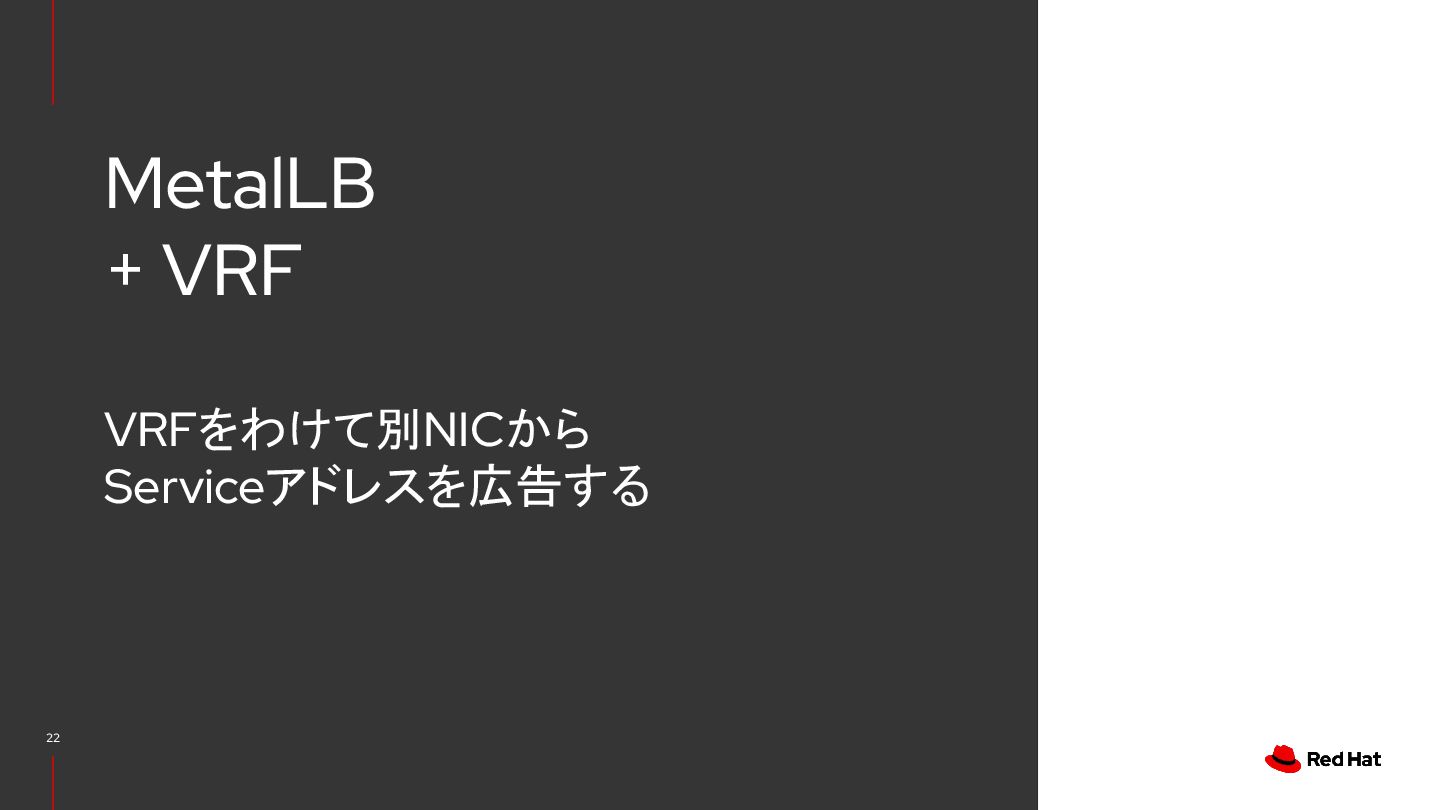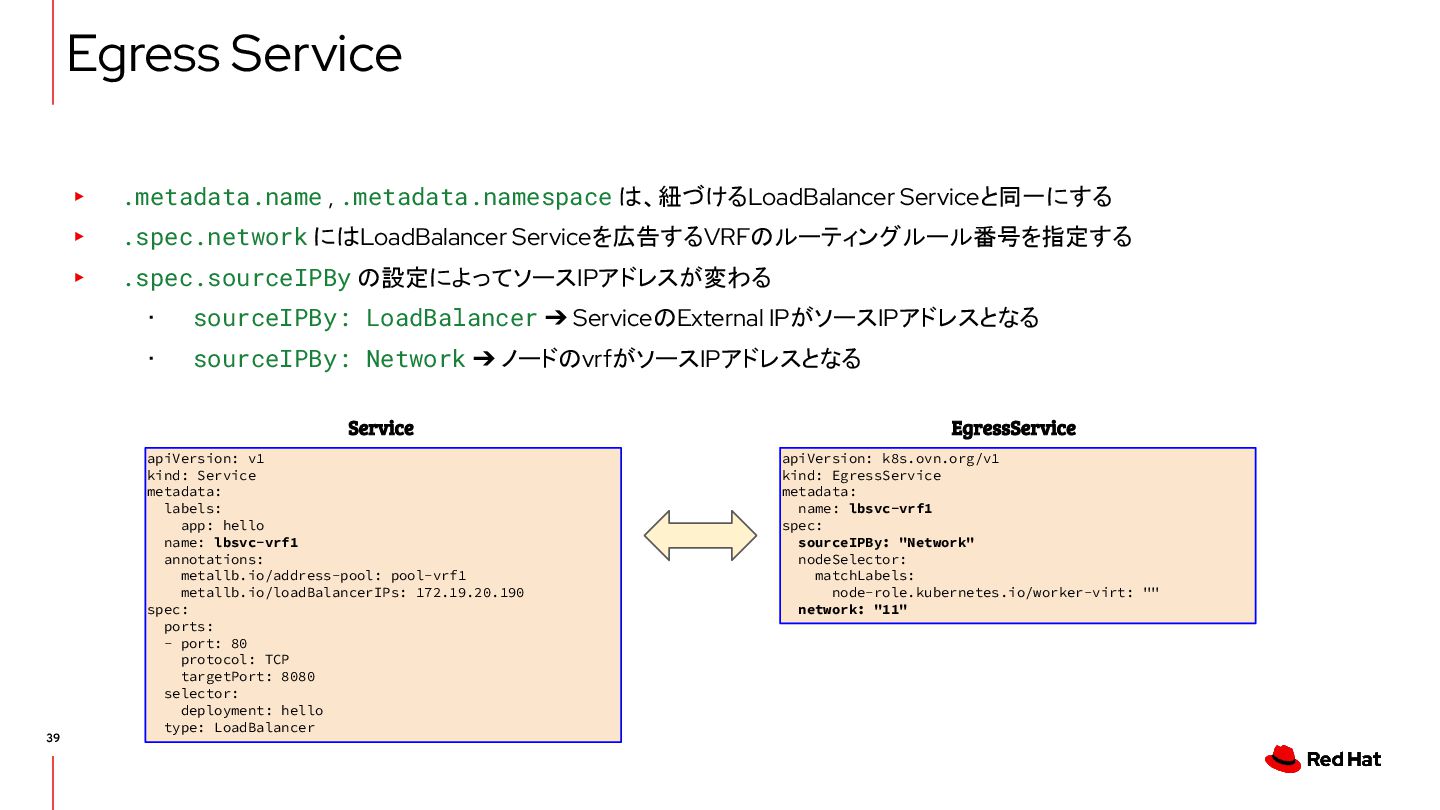 にはLoadBalancer Serviceを広告するVRFのルーティングルール番号を指定する ▸ .spec.sourceIPBy の設定によってソースIPアドレスが変わる ・ sourceIPBy: LoadBalancer ➔ ServiceのExternal IPがソースIPアドレスとなる ・ sourceIPBy: Network ➔ ノードのvrfがソースIPアドレスとなる 39 apiVersion: v1 kind: Service metadata: labels: app: hello name: lbsvc-vrf1 annotations: metallb.io/address-pool: pool-vrf1 metallb.io/loadBalancerIPs: 172.19.20.190 spec: ports: - port: 80 protocol: TCP targetPort: 8080 selector: deployment: hello type: LoadBalancer apiVersion: k8s.ovn.org/v1 kind: EgressService metadata: name: lbsvc-vrf1 spec: sourceIPBy: "Network" nodeSelector: matchLabels: node-role.kubernetes.io/worker-virt: "" network: "11" Service EgressService
