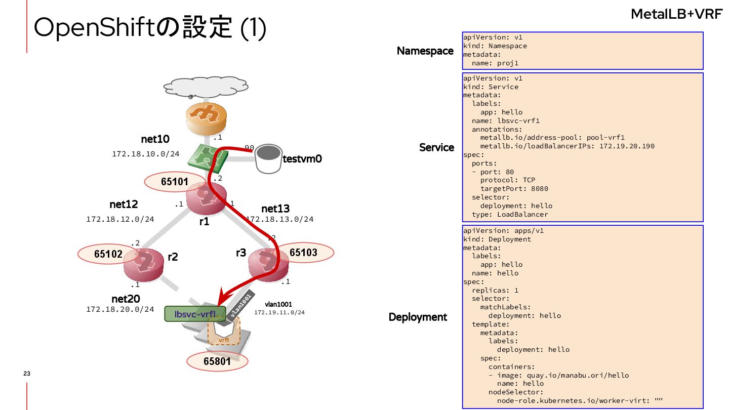 172.18.12.0/24 172.18.13.0/24 172.18.20.0/24 .1 .2 .2 .1 .2 .1 .90 65101 65102 65103 .1 .1 testvm0 vrf1 vlan1001 vlan1001 172.19.11.0/24 65801 23 lbsvc-vrf1 apiVersion: v1 kind: Namespace metadata: name: proj1 apiVersion: v1 kind: Service metadata: labels: app: hello name: lbsvc-vrf1 annotations: metallb.io/address-pool: pool-vrf1 metallb.io/loadBalancerIPs: 172.19.20.190 spec: ports: - port: 80 protocol: TCP targetPort: 8080 selector: deployment: hello type: LoadBalancer apiVersion: apps/v1 kind: Deployment metadata: labels: app: hello name: hello spec: replicas: 1 selector: matchLabels: deployment: hello template: metadata: labels: deployment: hello spec: containers: - image: quay.io/manabu.ori/hello name: hello nodeSelector: node-role.kubernetes.io/worker-virt: "" Namespace Service Deployment MetalLB+VRF