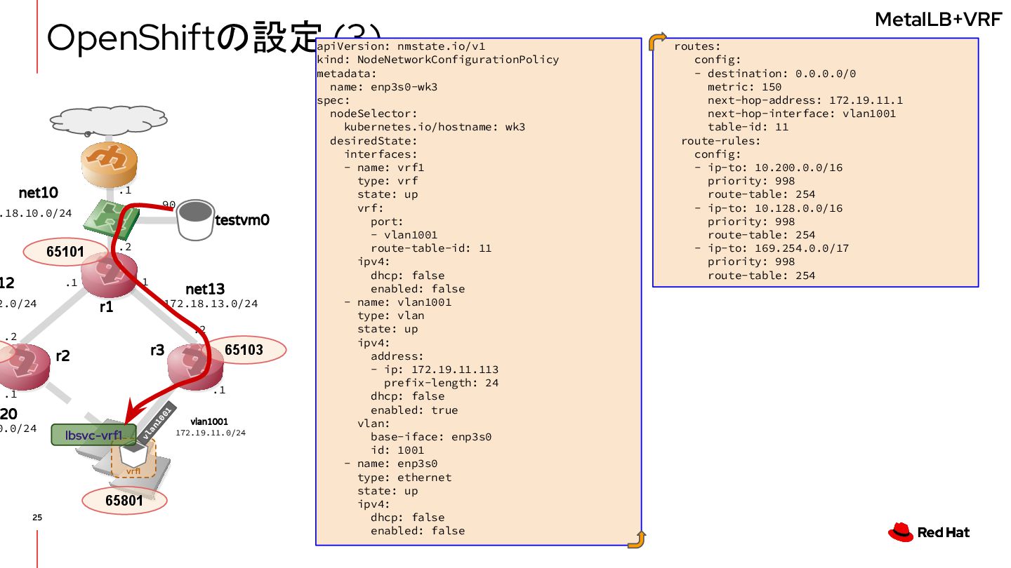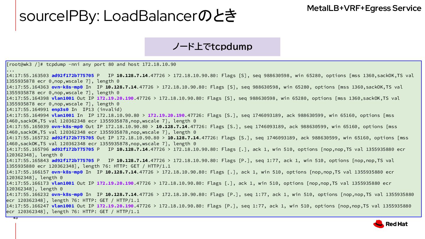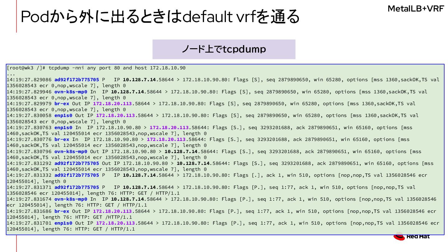172.18.13.0/24 172.18.20.0/24 .1 .2 .2 .1 .2 .1 .90 65101 65102 65103 .1 .1 testvm0 vrf1 vlan1001 vlan1001 172.19.11.0/24 65801 31 lbsvc-vrf1 PodのIPアドレス $ oc get pod -o wide NAME READY STATUS RESTARTS AGE IP NODE NOMINATED NODE READINESS GATES hello-c84644886-zkwst 1/1 Running 2 11d 10.128.7.14 wk3 <none> <none> [test@testvm0 rpmbuild]$ sudo tcptraceroute 172.19.20.190 80 Running: traceroute -T -O info -p 80 172.19.20.190 traceroute to 172.19.20.190 (172.19.20.190), 30 hops max, 60 byte packets 1 _gateway (172.18.10.2) 0.313 ms 0.269 ms * 2 172.18.13.2 (172.18.13.2) 0.590 ms * * 3 172.19.20.190 (172.19.20.190) 1.001 ms * * 4 * * * 5 * * * 6 172.19.20.190 (172.19.20.190) <syn,ack> 10.571 ms * * [test@testvm0 rpmbuild]$ curl http://172.19.20.190 Hello, World! Timestamp: 2025/11/22 08:30:27 Hostname: hello-c84644886-zkwst LocalAddress: 10.128.7.14 Gateway: 10.128.7.1 Headers: Accept: [*/*] User-Agent: [curl/7.76.1] Host: 172.19.20.190 RemoteAddress: 100.64.0.9:35036 Service のIPアドレスに直接アクセス Service のIPアドレスにtcptraceroute Service のIPアドレス $ oc get svc NAME TYPE CLUSTER-IP EXTERNAL-IP PORT(S) AGE hello-lb-l3 LoadBalancer 10.200.182.169 172.19.20.181 80:30224/TCP 32h lbsvc-vrf1 LoadBalancer 10.200.202.186 172.19.20.190 80:32612/TCP 12m MetalLB+VRF